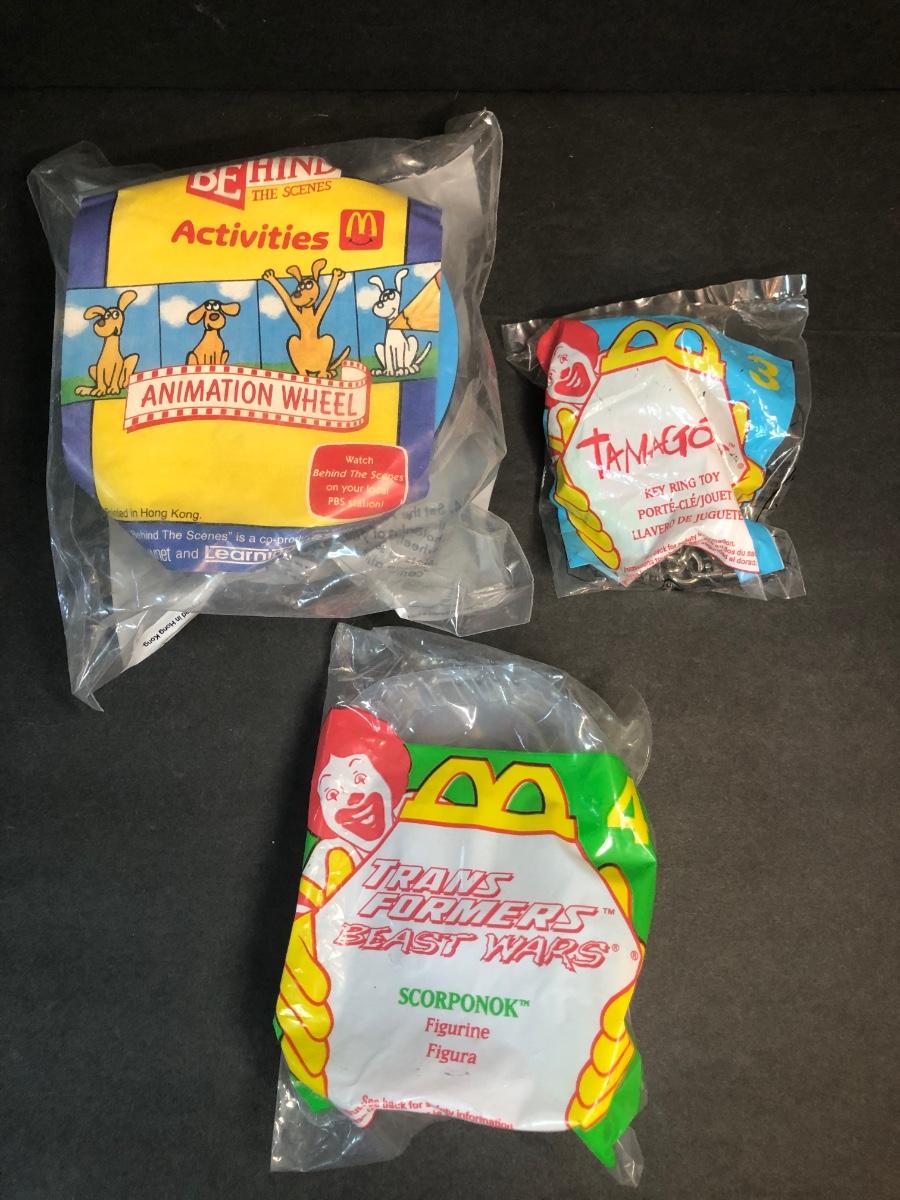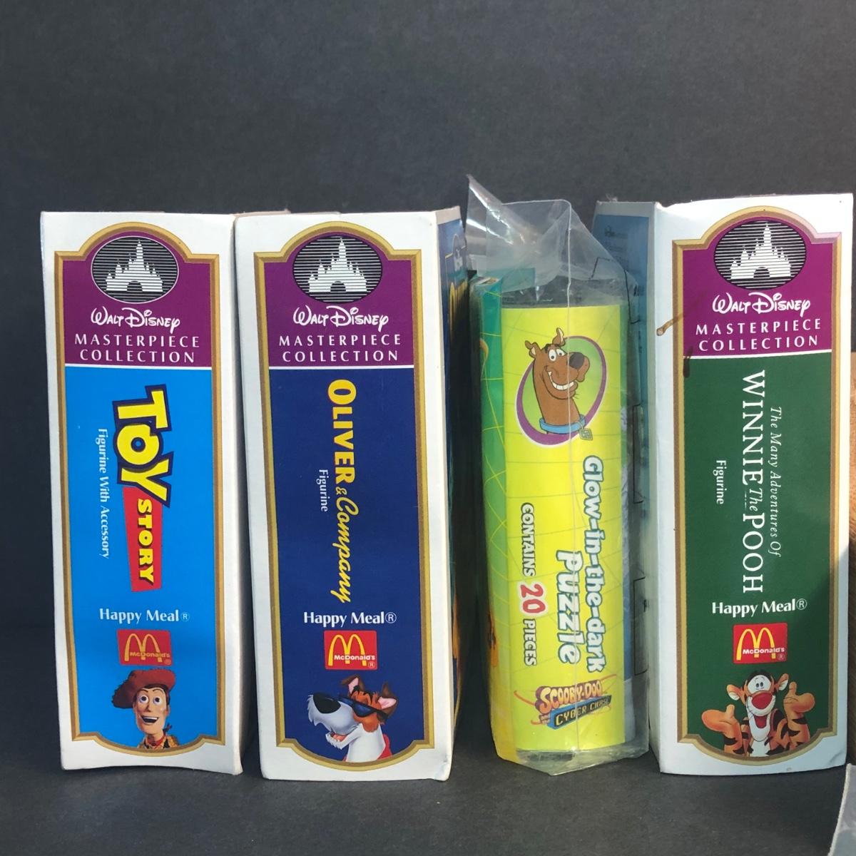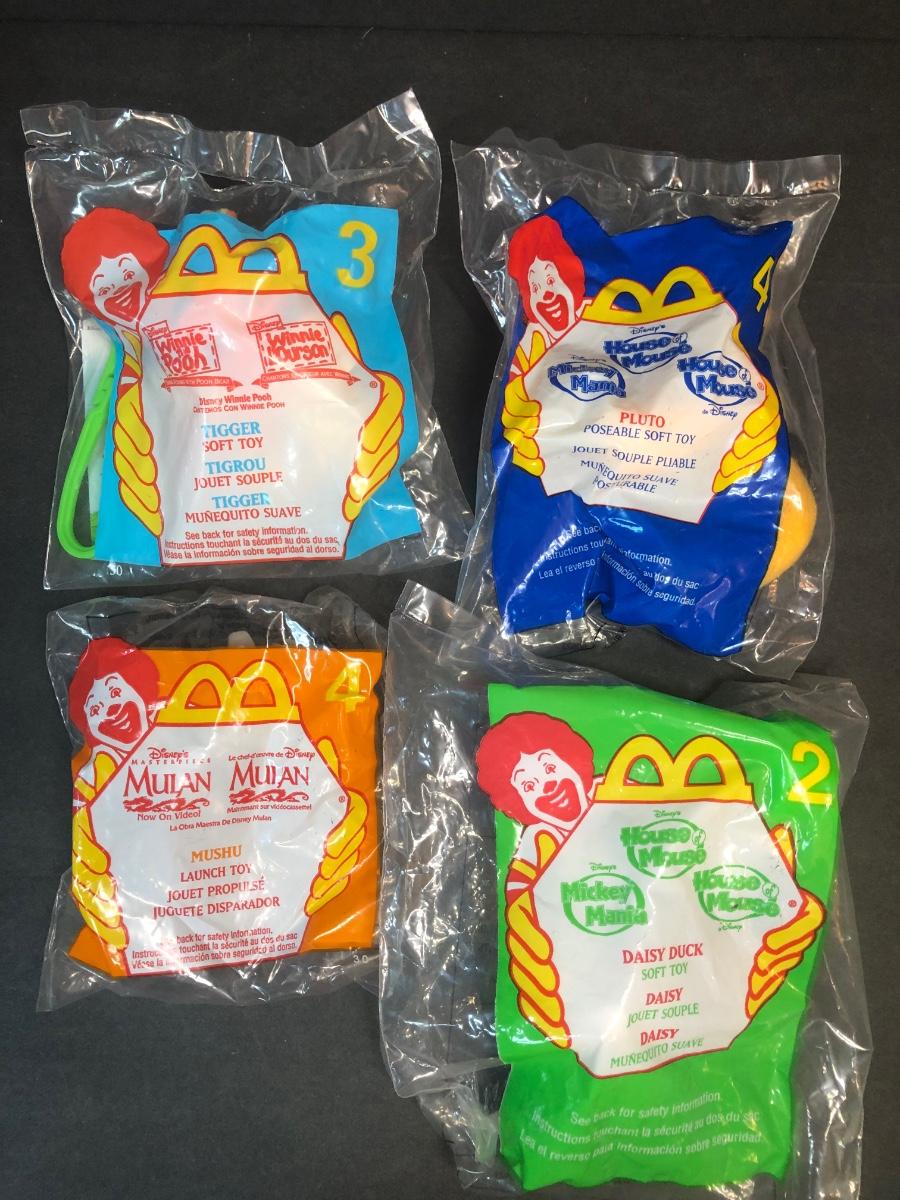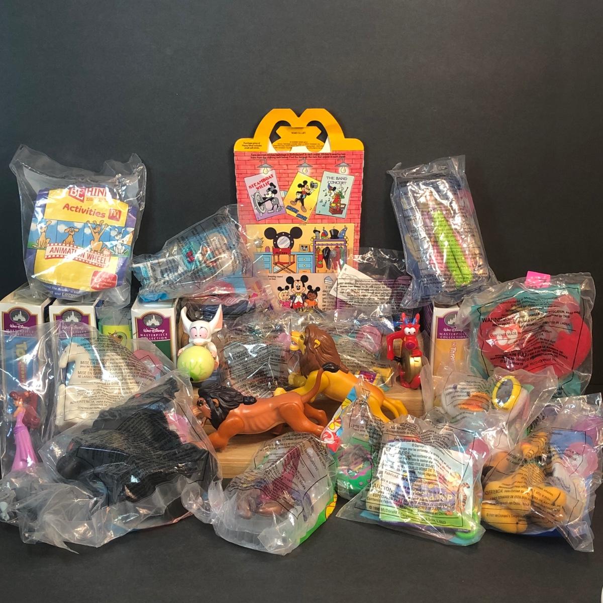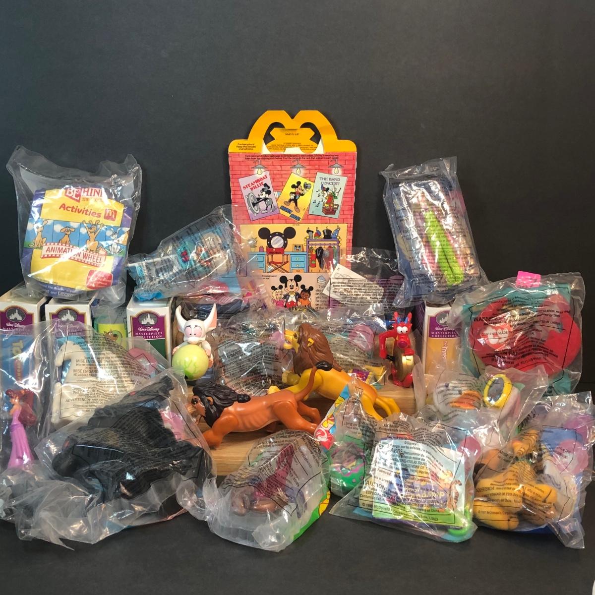 LOT 171M: Large Collection of Mostly Packaged McDonald's Toys w/ Vintage Mickey & Goofy Happy Meal Box