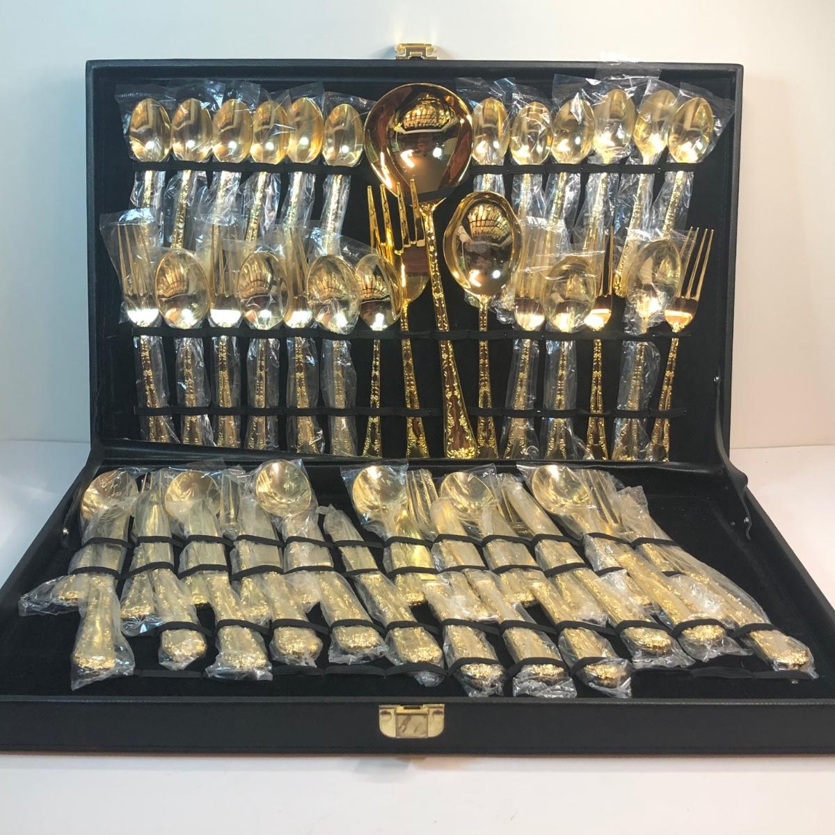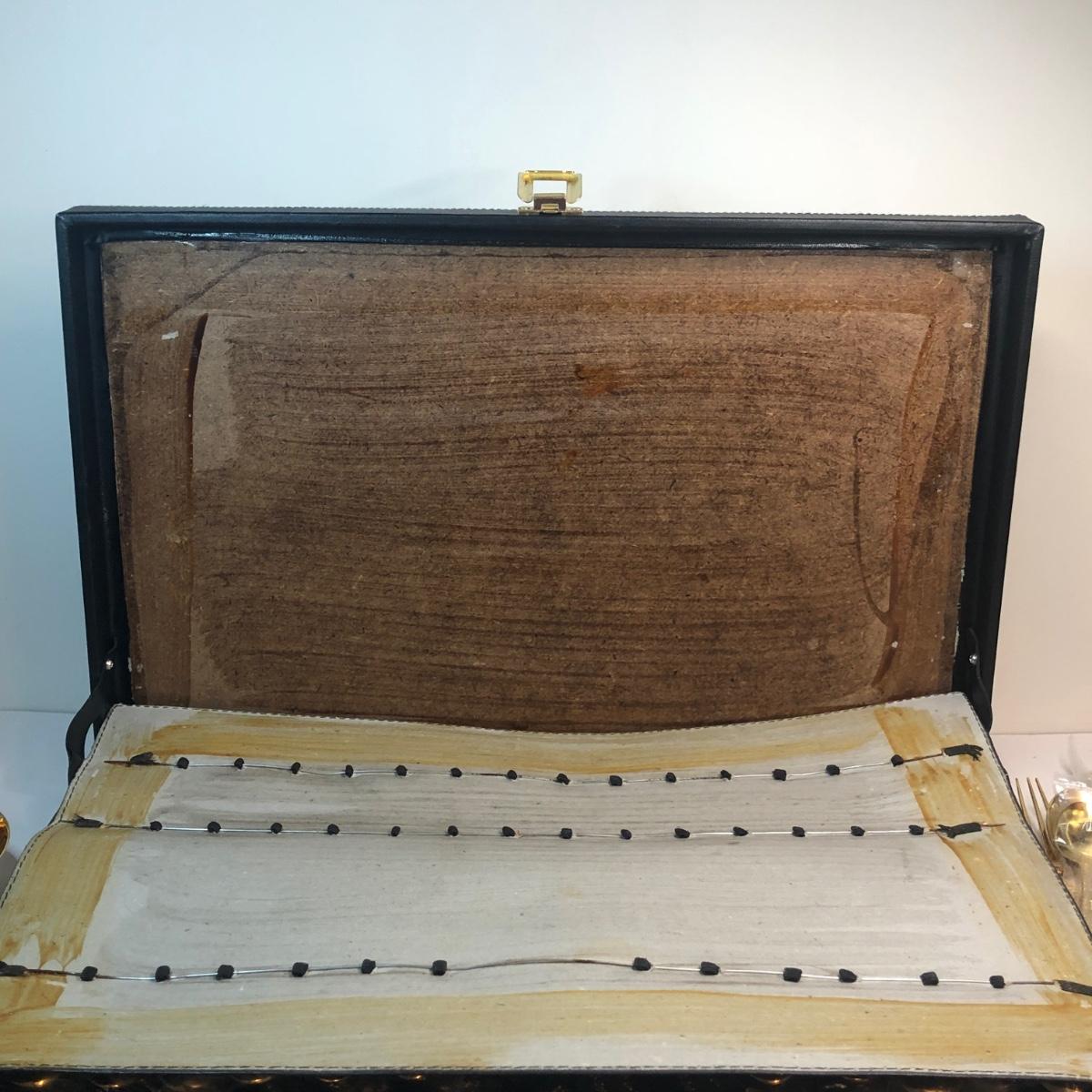 Includes 12 knives, spoons, and small spoons, but only 11 forks. Includes 3 serving utensils. Case is damaged.