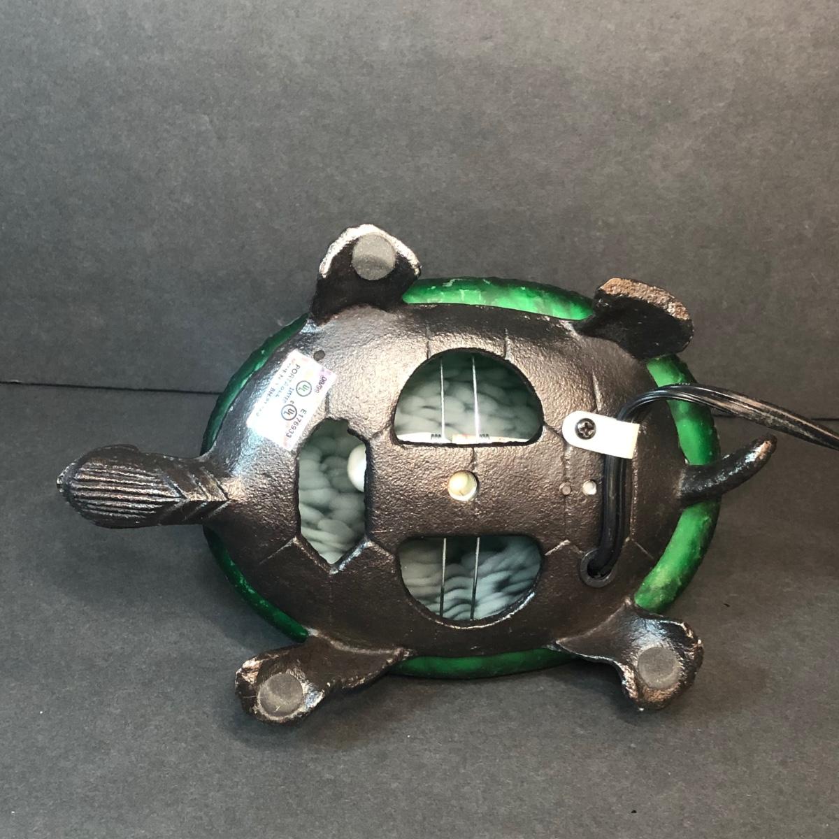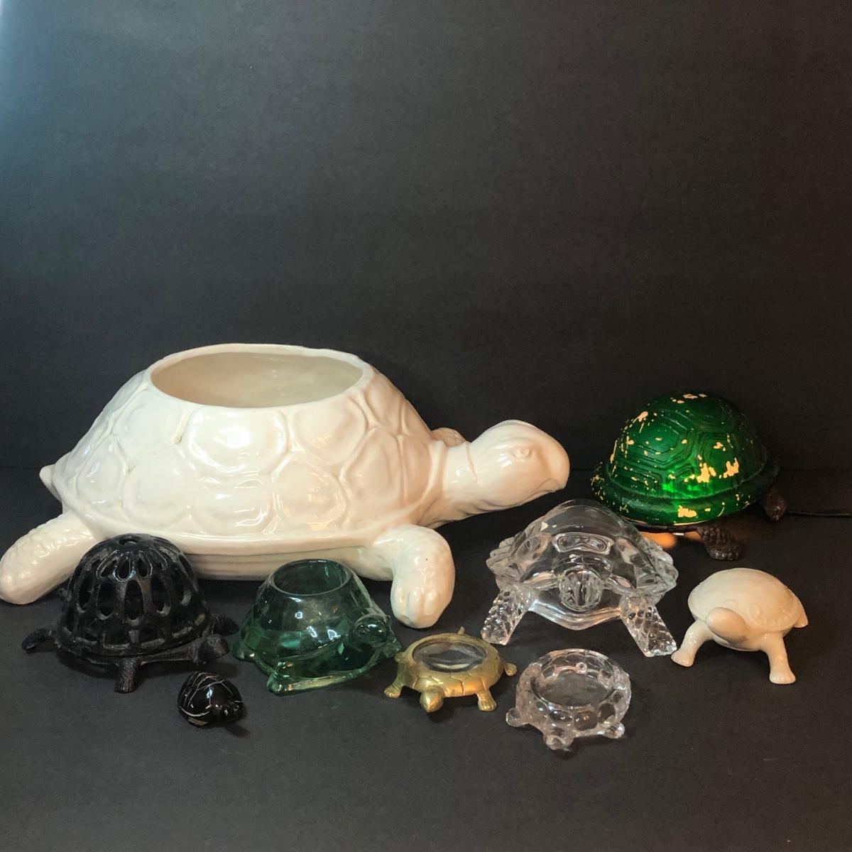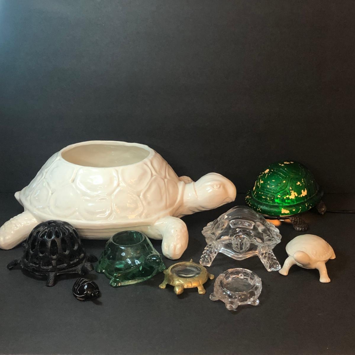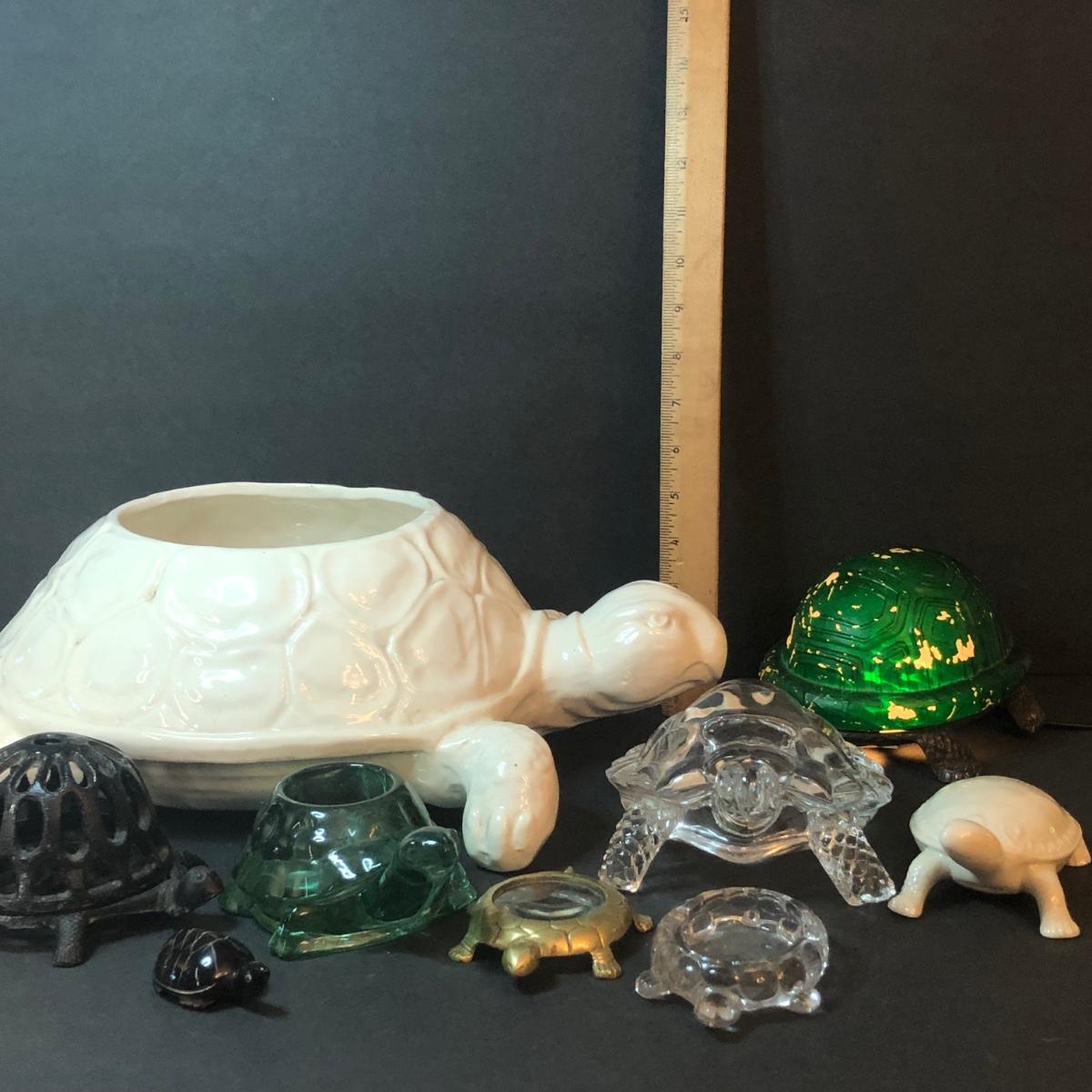 An assortment of turtle shaped items including a planter, lamp, magnifying glass, and yarn holder. Lamp works.