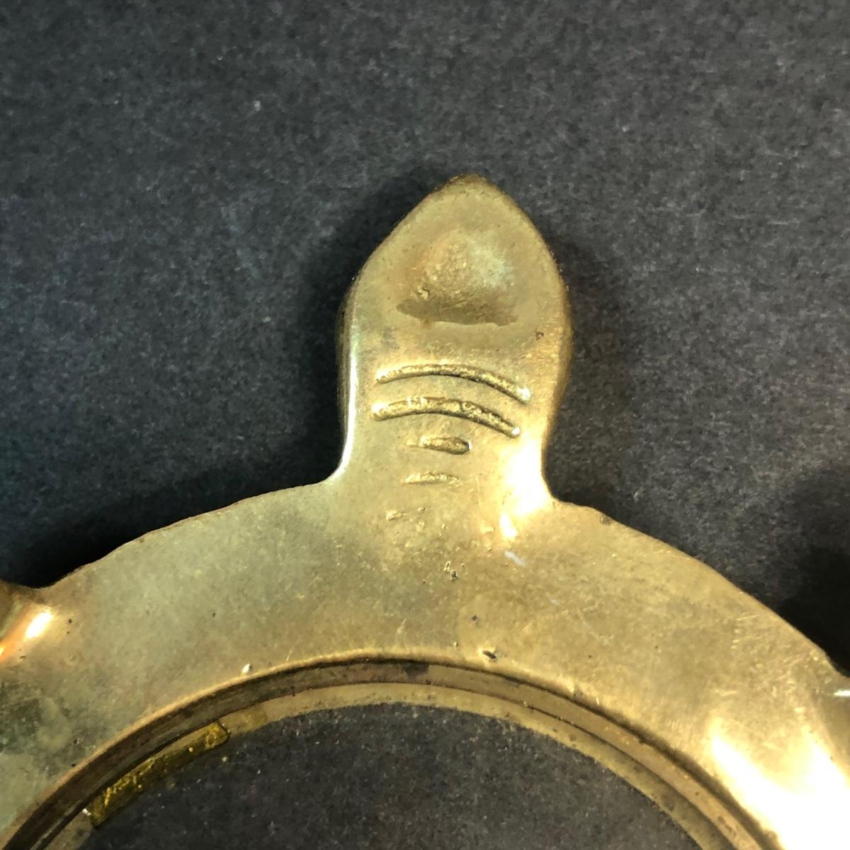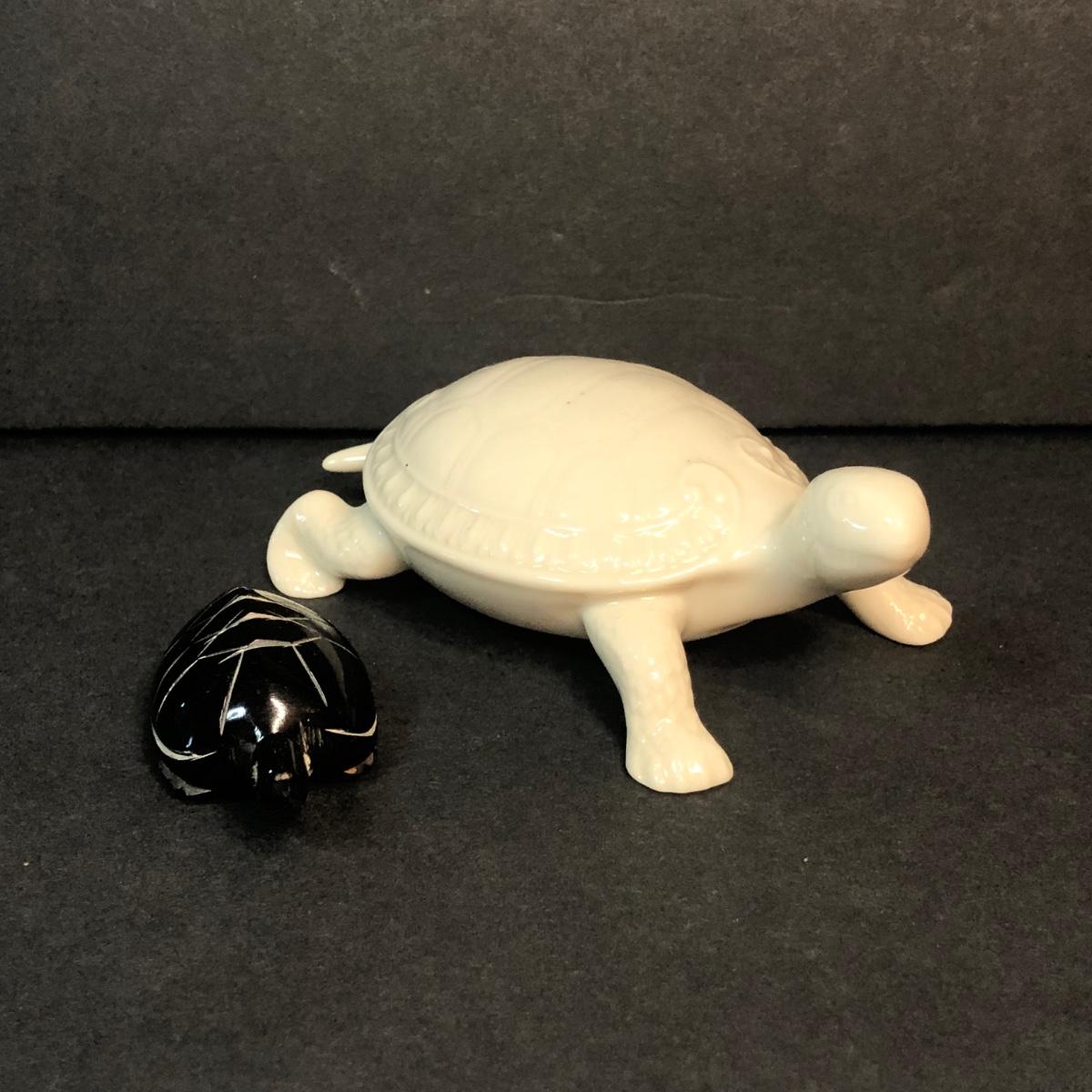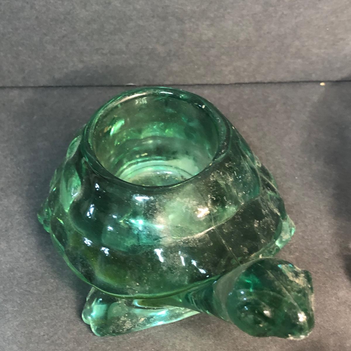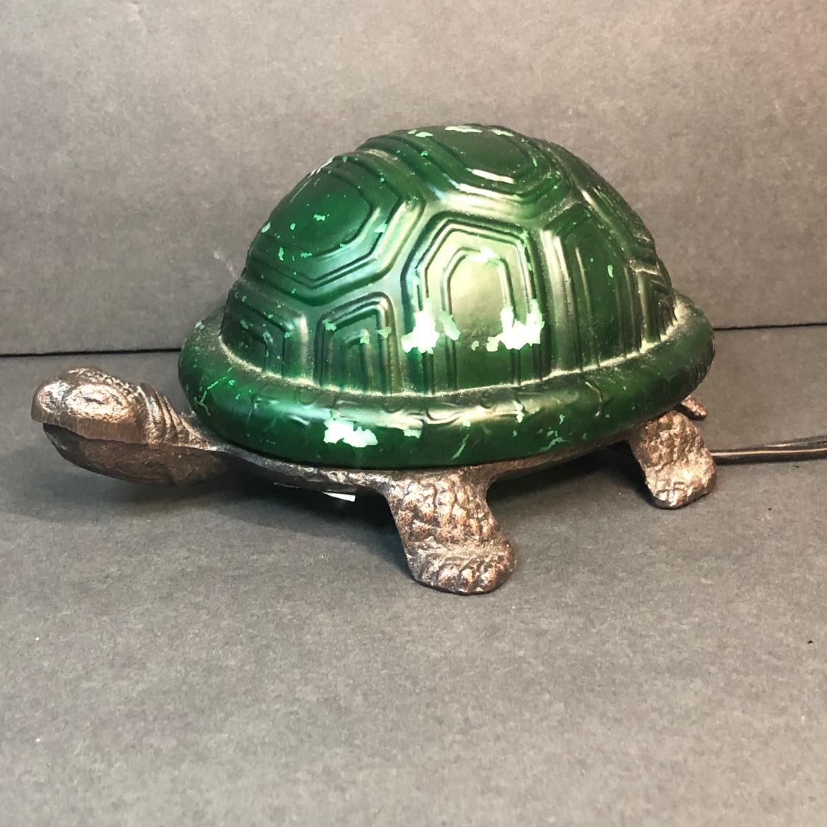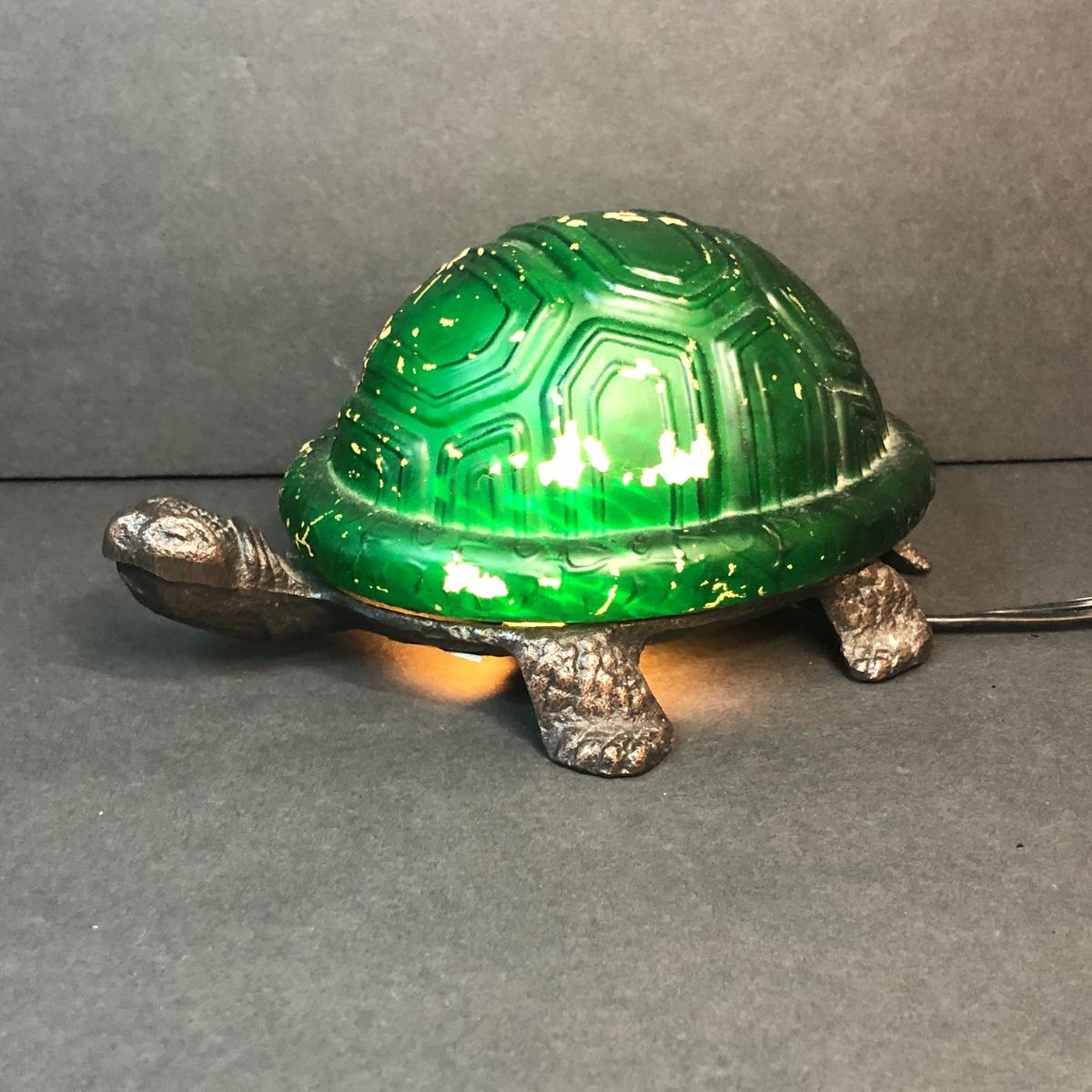 An assortment of turtle shaped items including a planter, lamp, magnifying glass, and yarn holder. Lamp works.