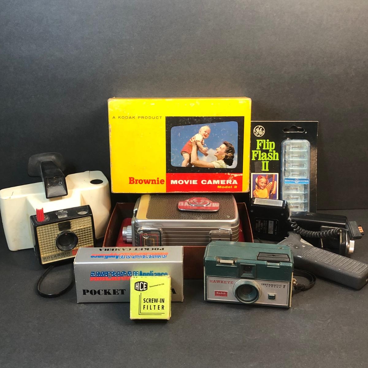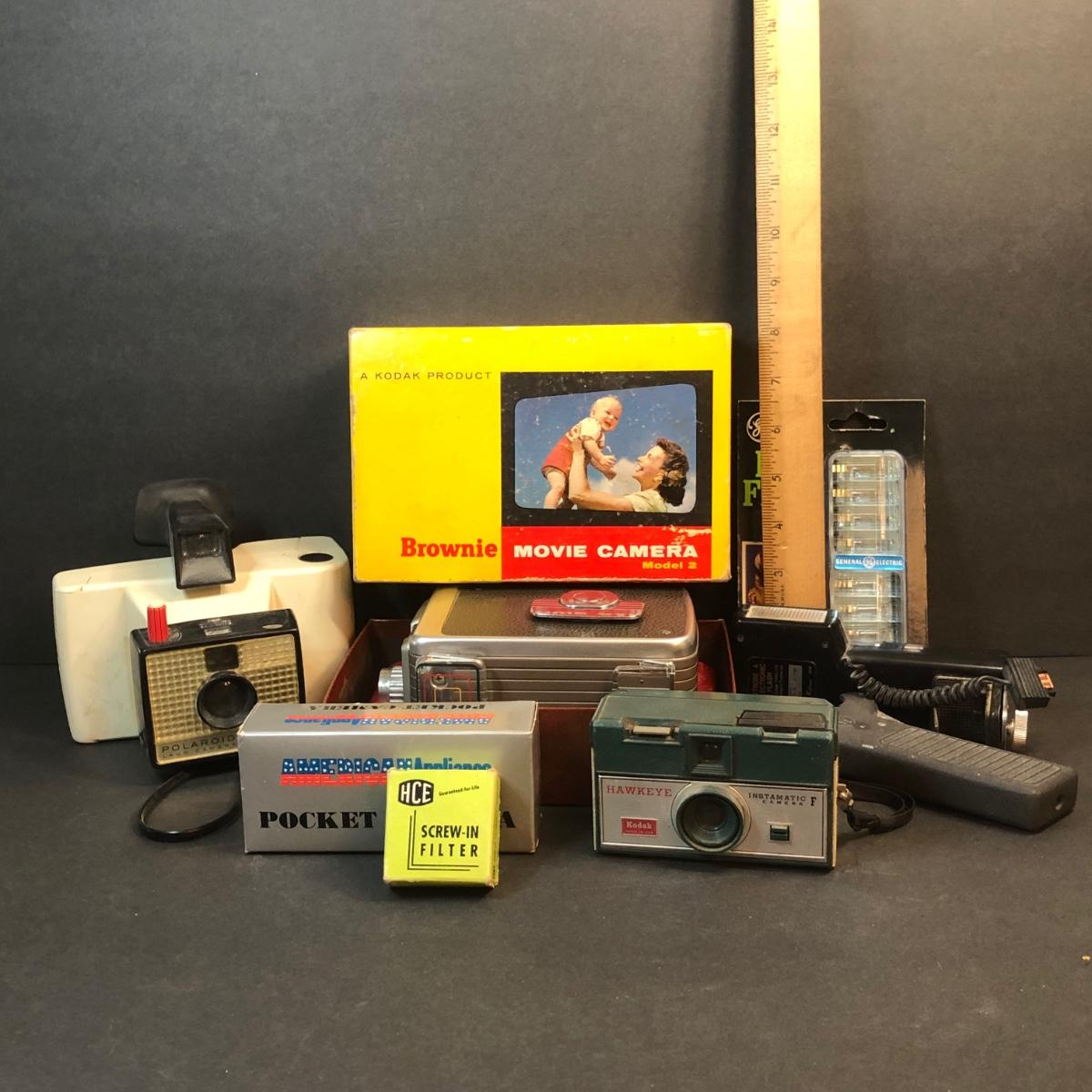 LOT 178M: Kodak Brownie Movie Camera Model 2, Polaroid Land Camera Swinger Model, Kodak Hawkeye Instatmatic Camera F, American Appliance Pocket Camera & More