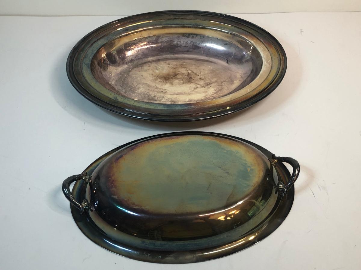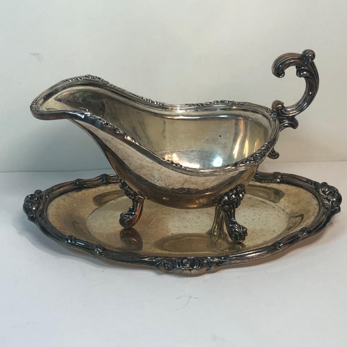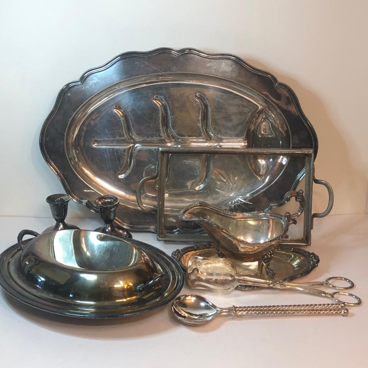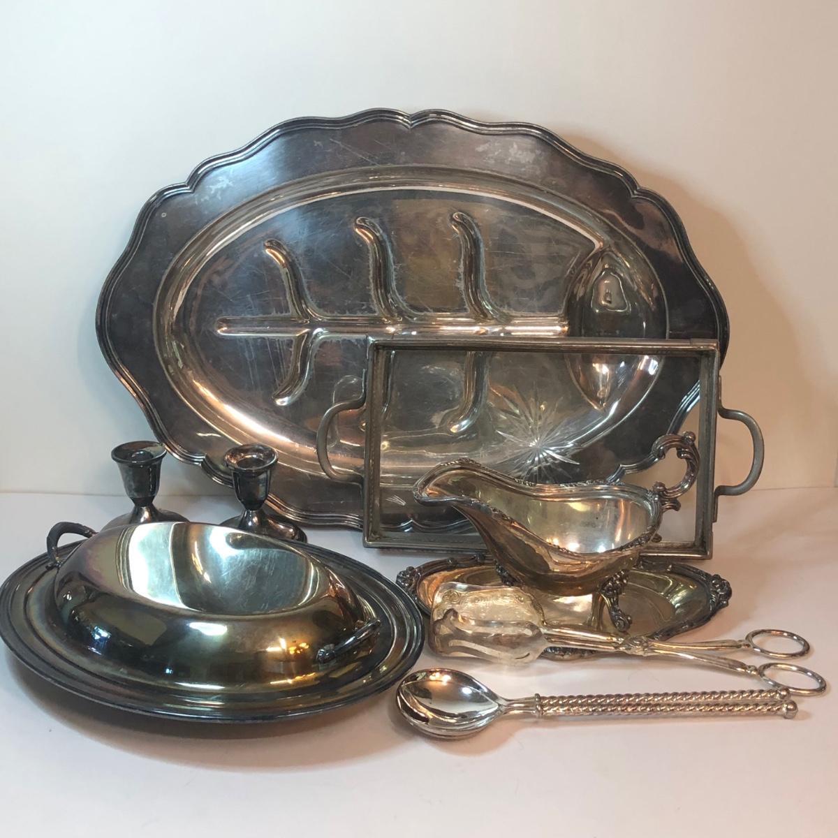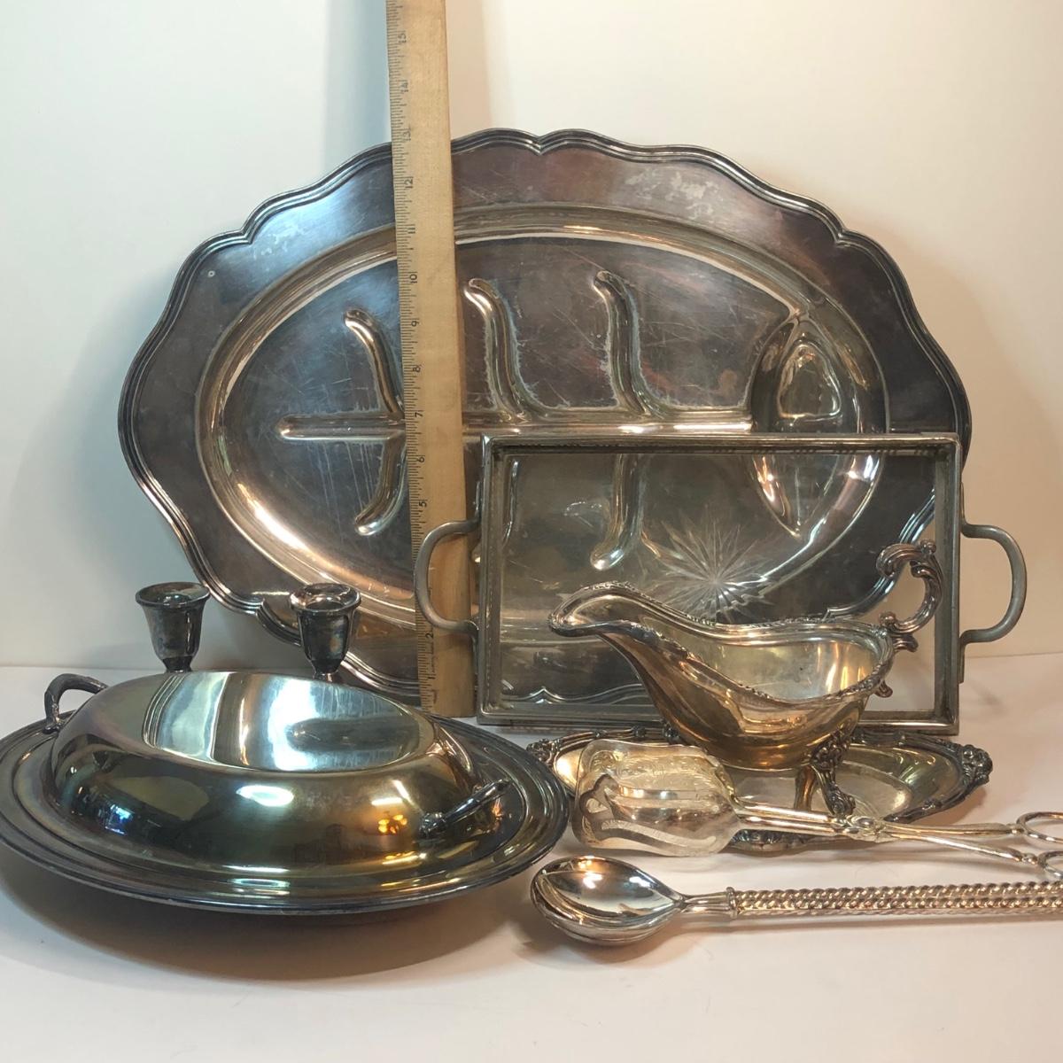 LOT 181M: Silverplate Serving Collection - Sheffield Meat Tray, Towle Candlesticks, Glass Bottom Tray, Gravy Boat w/ Dish, Lidded Concord Serving Dish