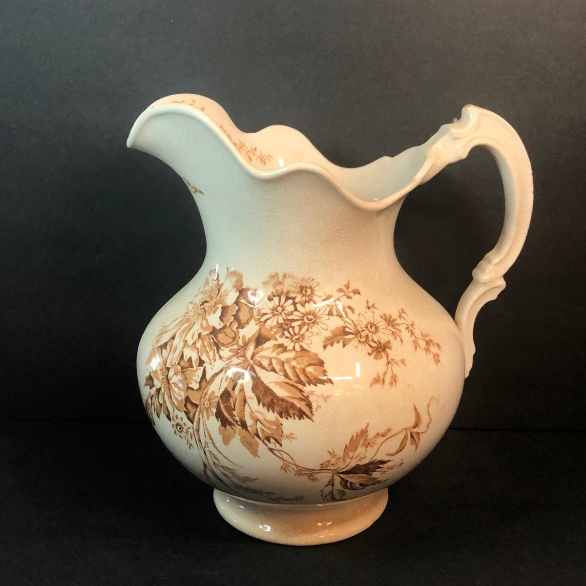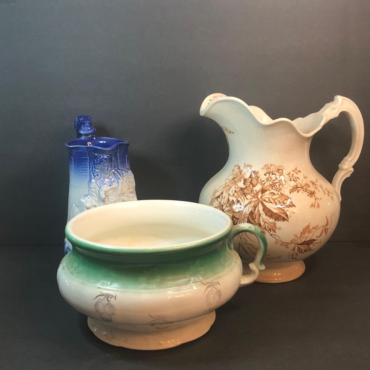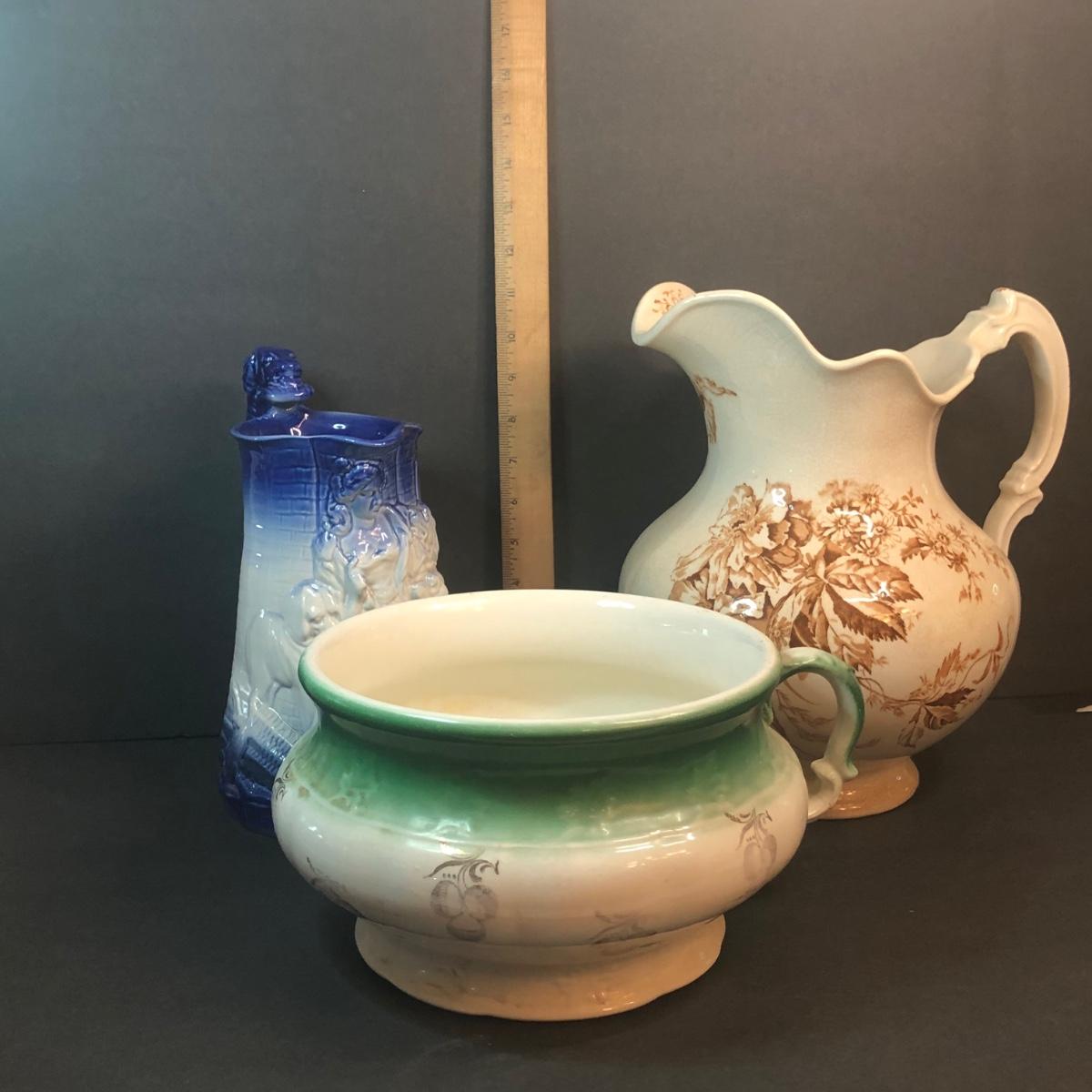 LOT 187M: Burleigh Ironstone Pitcher, Brown Pottery Pitcher & Semi-Vitreous Porcelain Chamber Pot