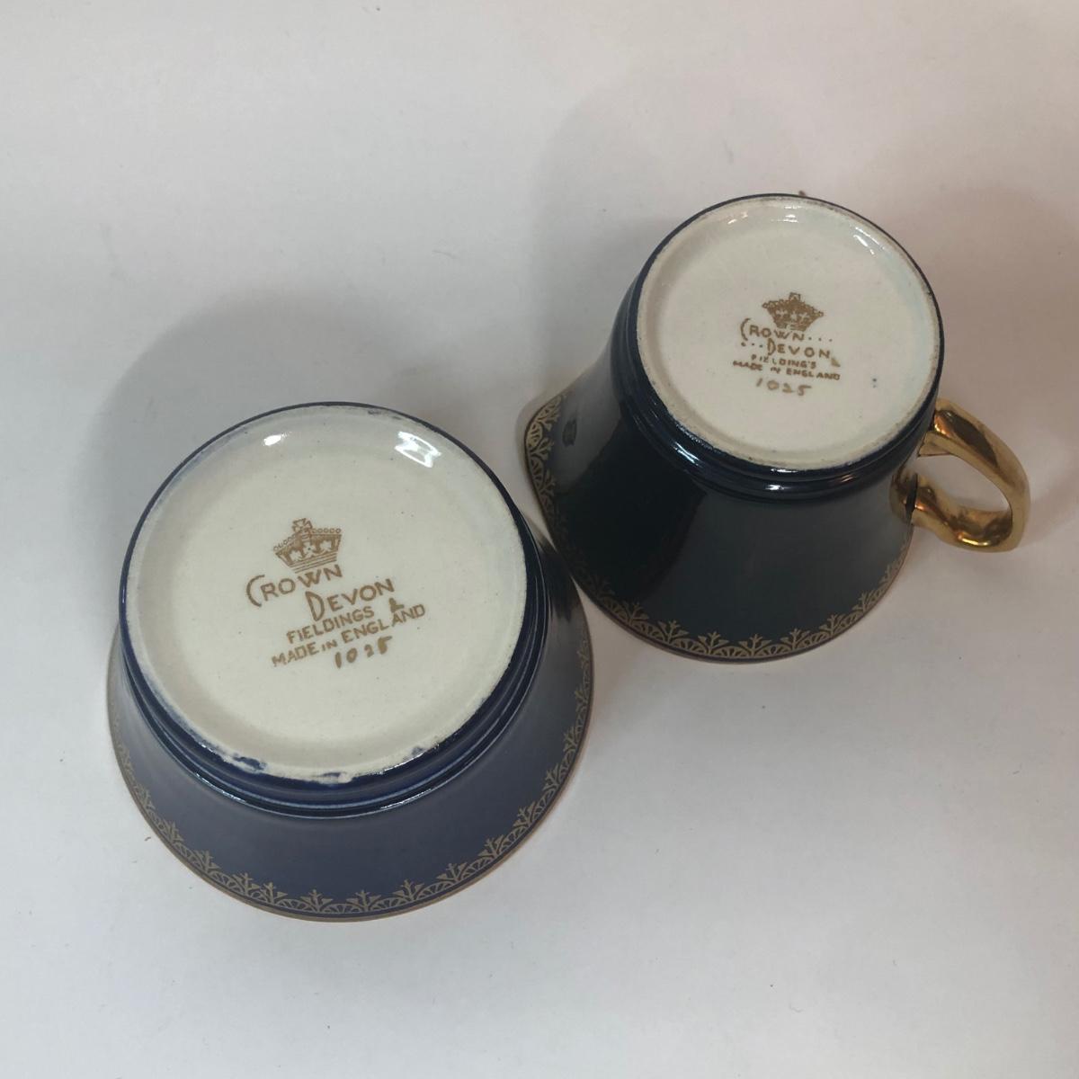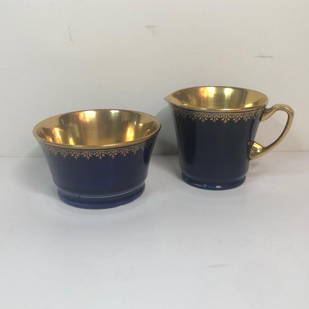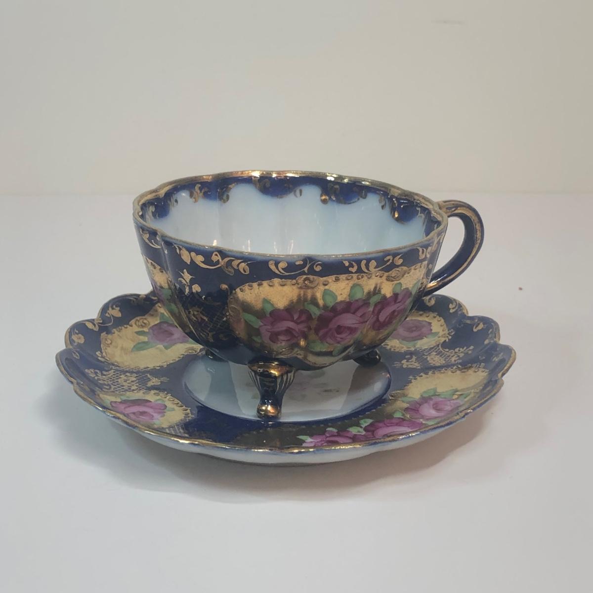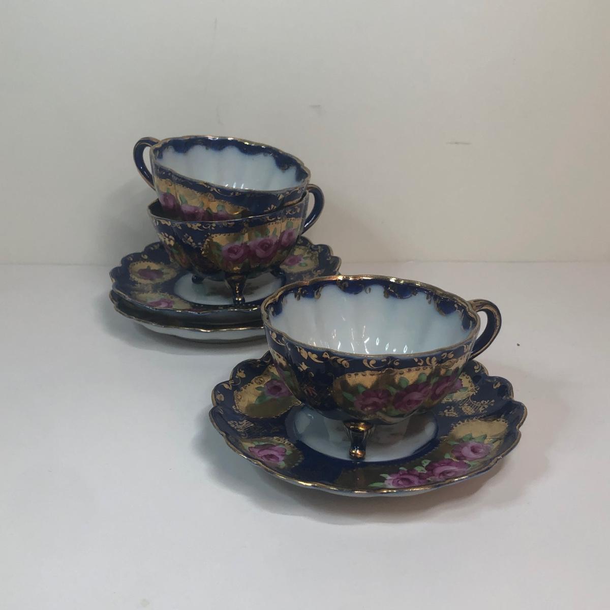 Also includes a circular pink vase, gold tone coffee spoons, a set of three teacups with saucers that have a pink rose design with a cobalt background and goldtone accents.