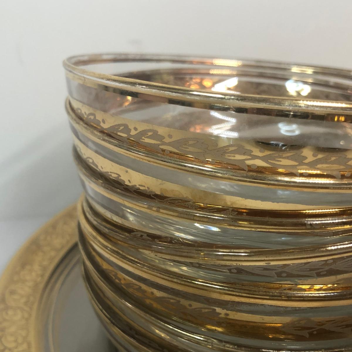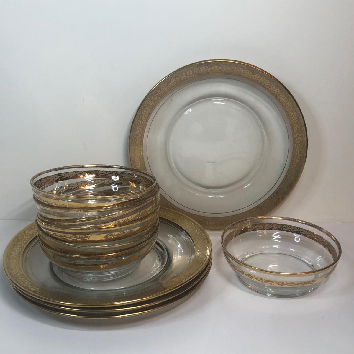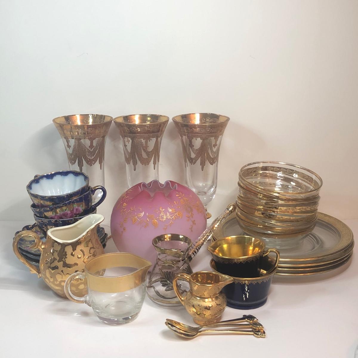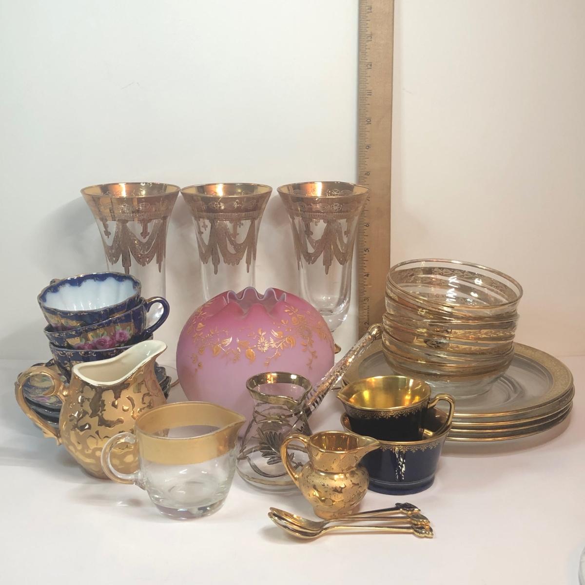 LOT 189M: 22KT & 24KT Gold Decorated Miniature Pitchers, 24Kt Gold Hand Decorated Cristallerie Italiane Glasses, Gold Rimmed Plates & More