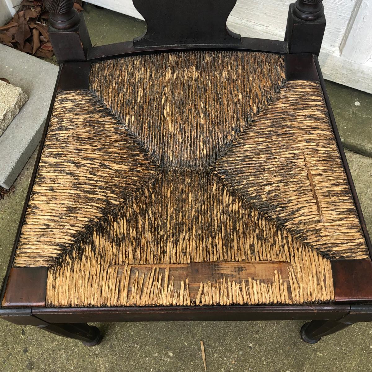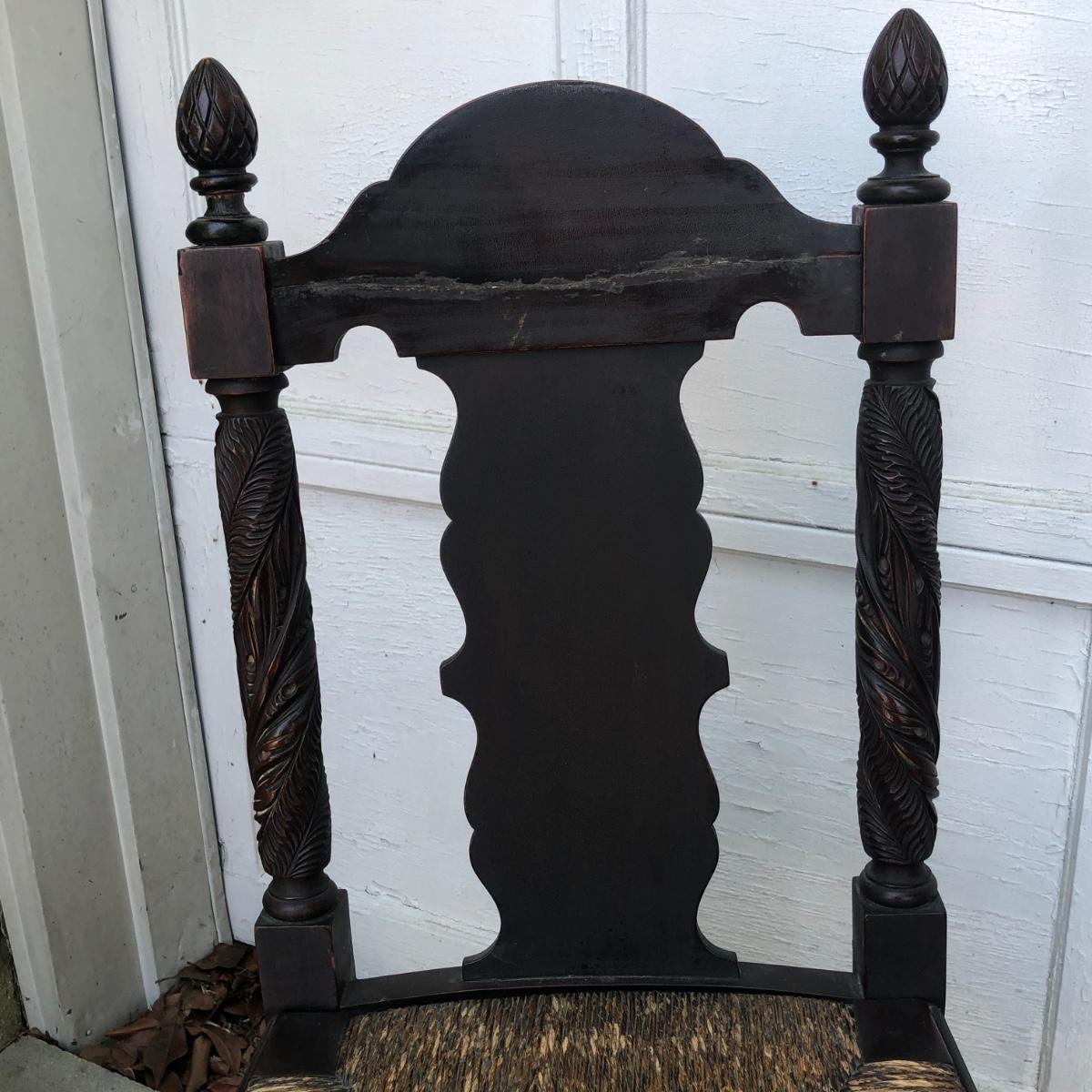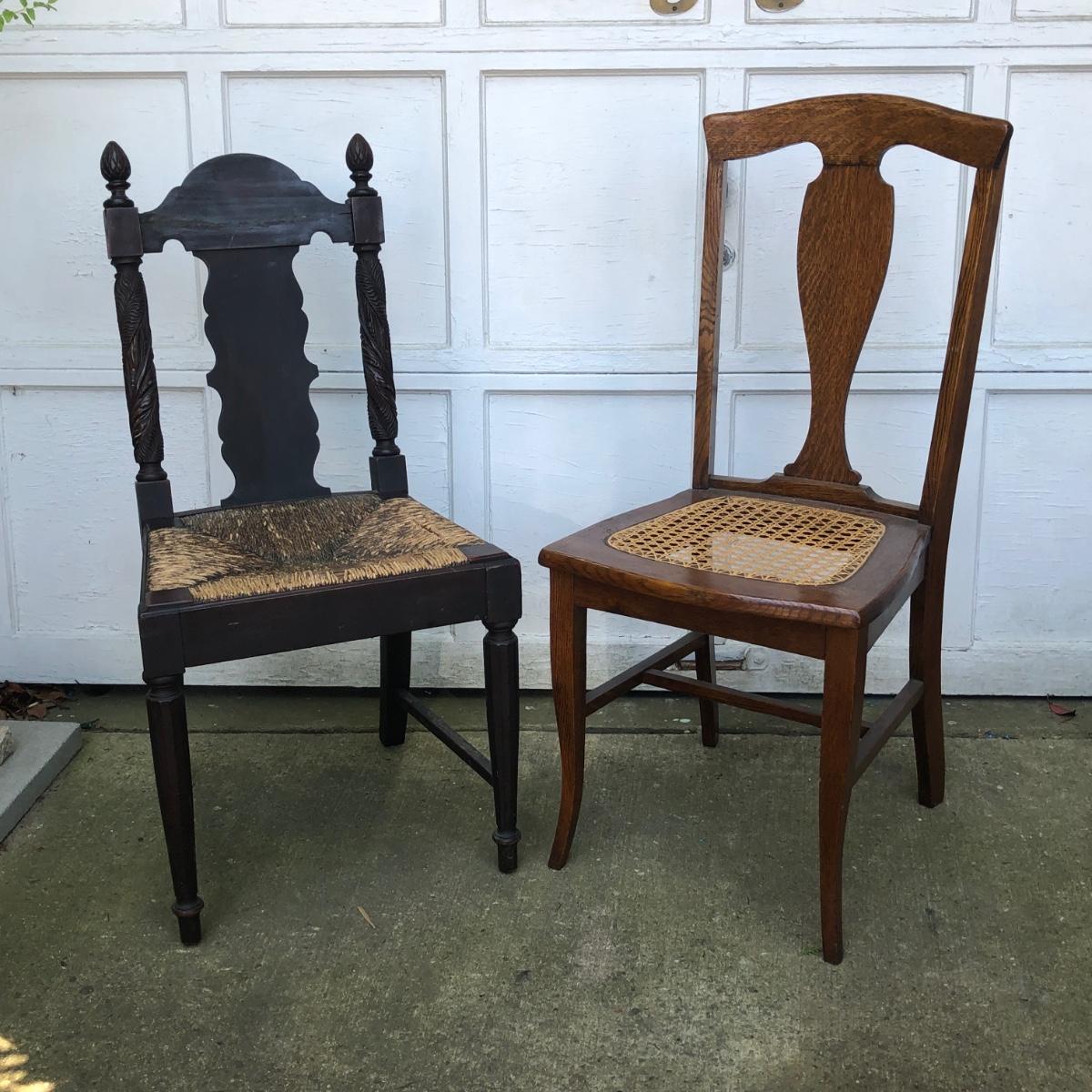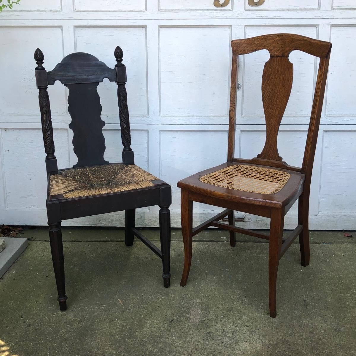 Darker chair has condition issues in the seat and a loose knob on the top. Measures 17 x 15 x 34. Other chair measures 16 x 16 x 37 inches.