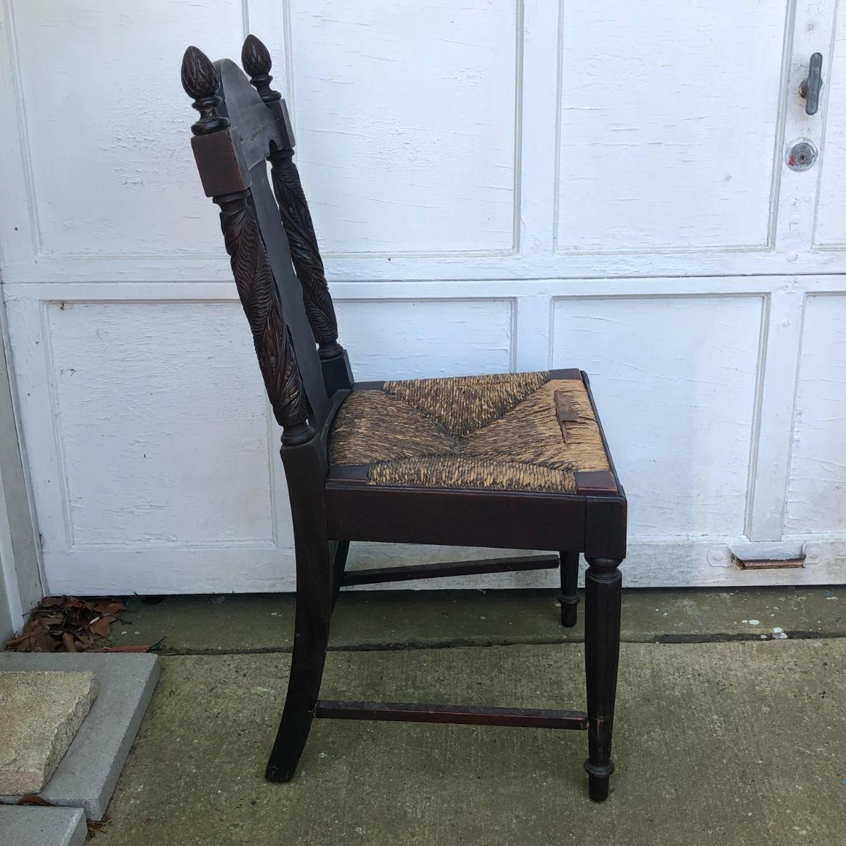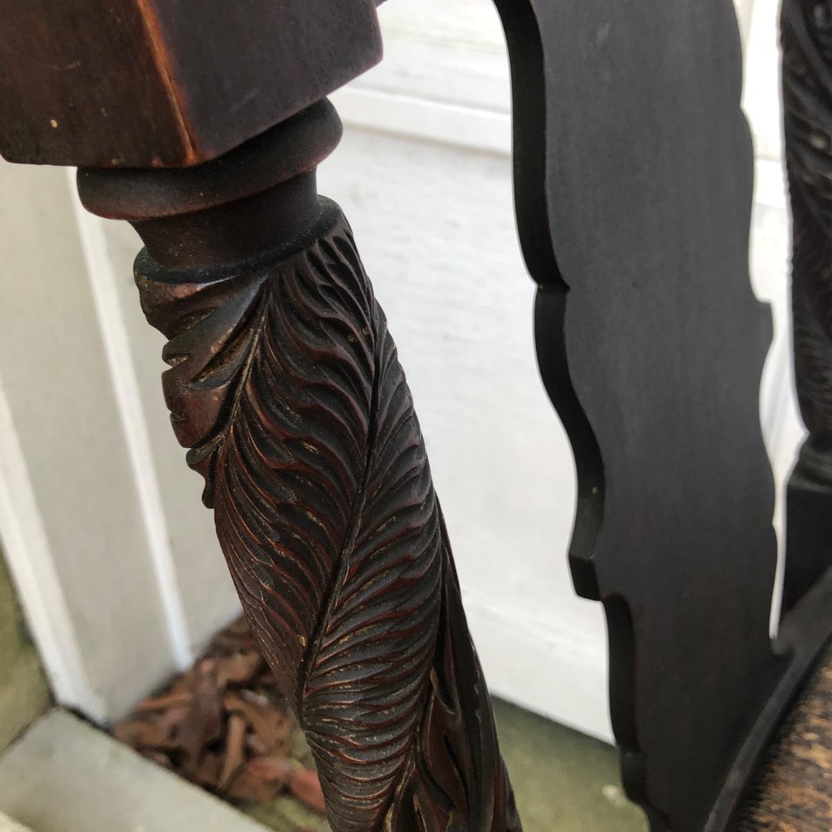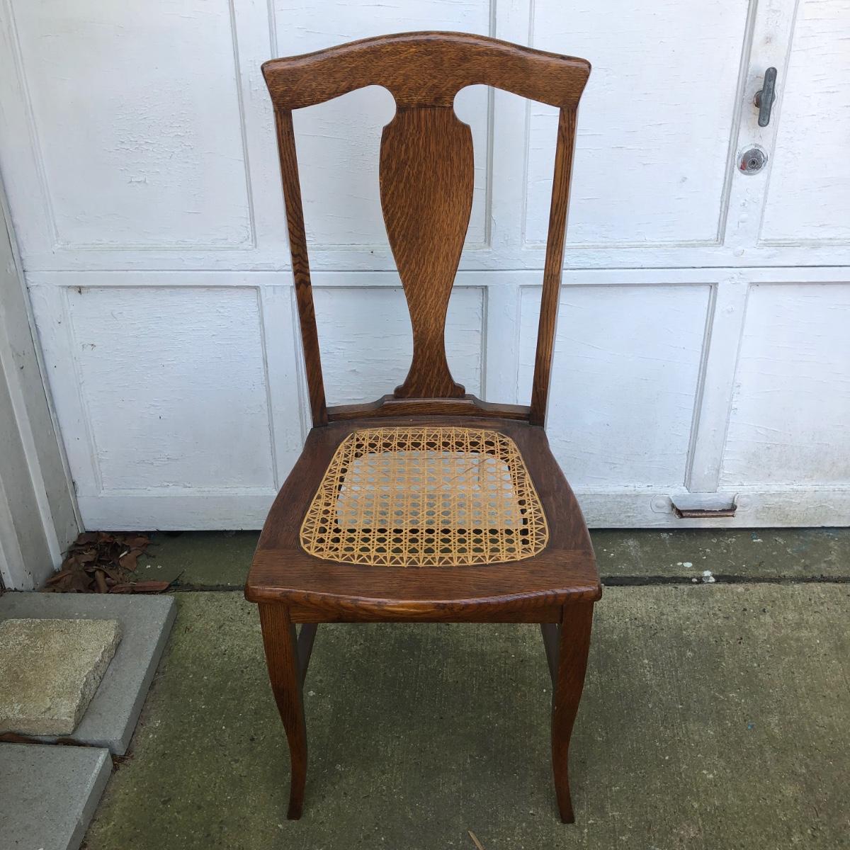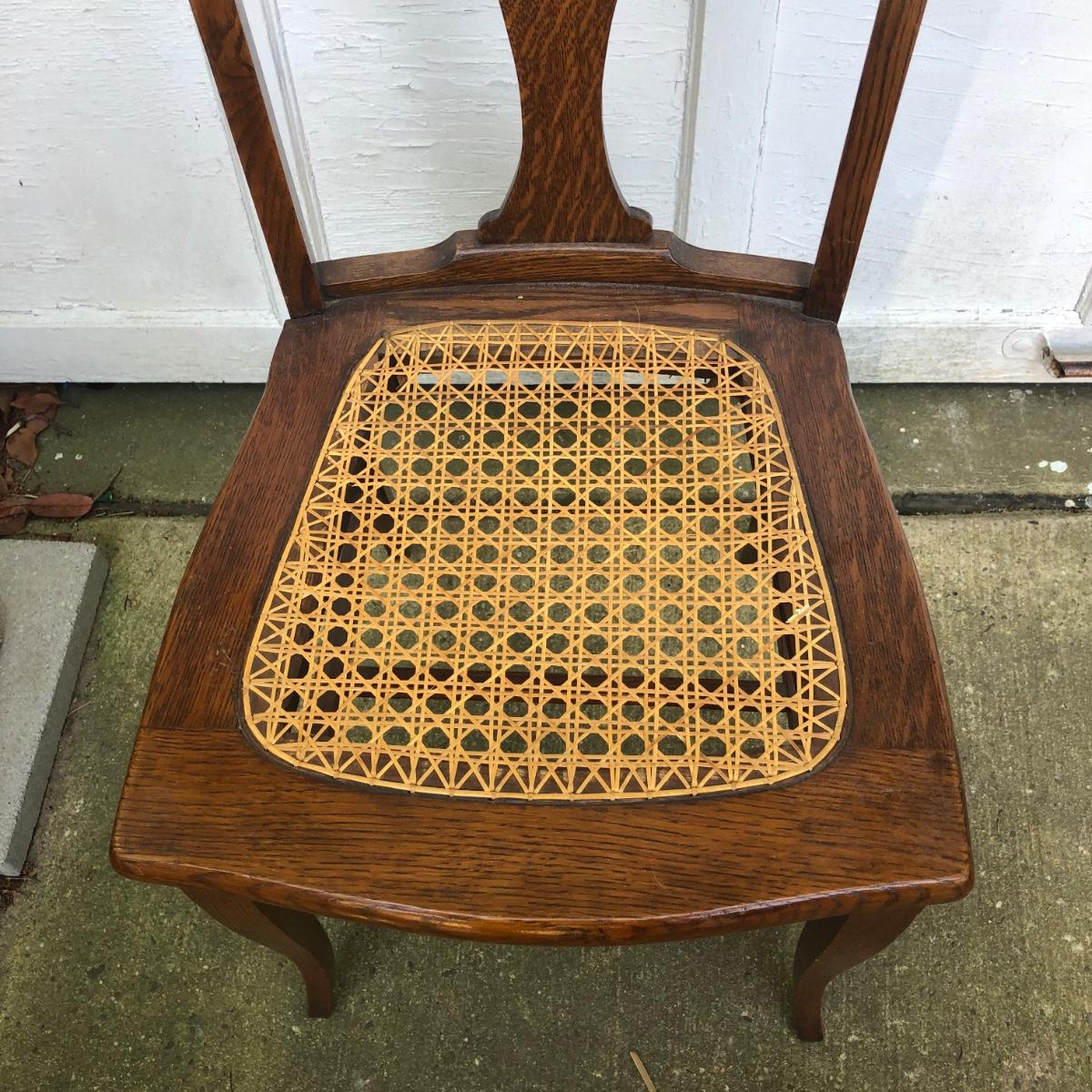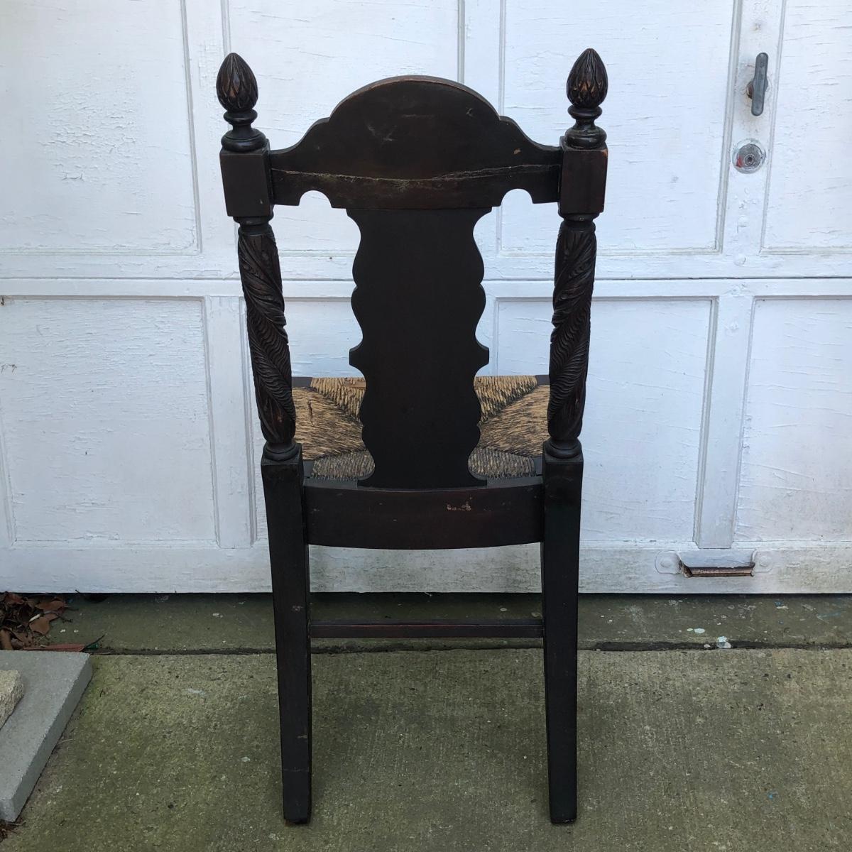 Darker chair has condition issues in the seat and a loose knob on the top. Measures 17 x 15 x 34. Other chair measures 16 x 16 x 37 inches.