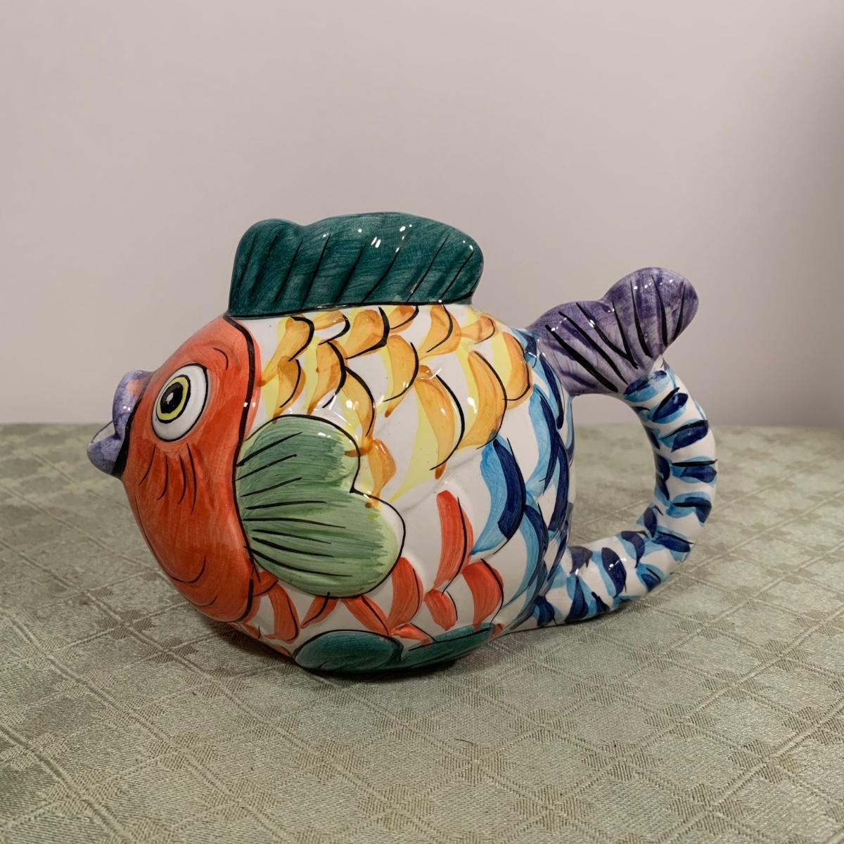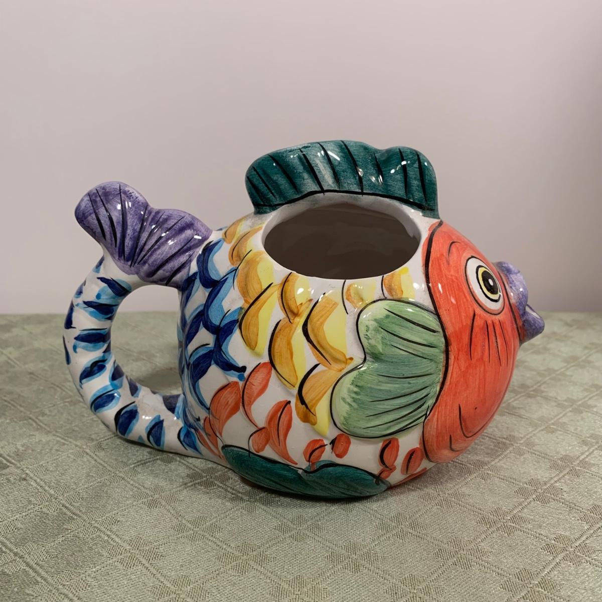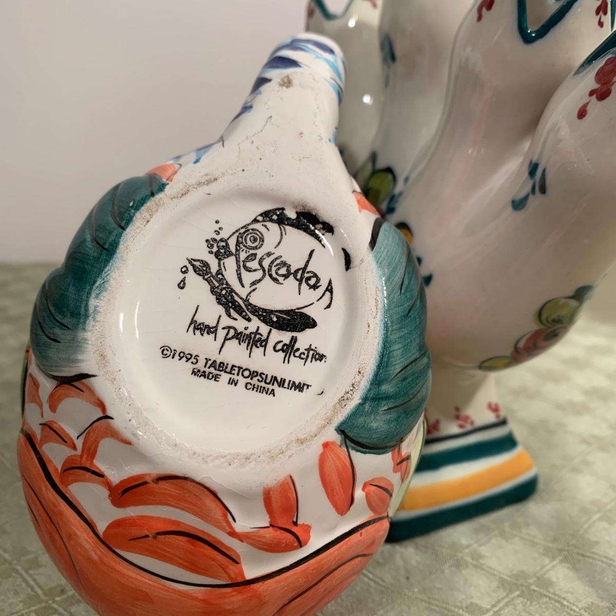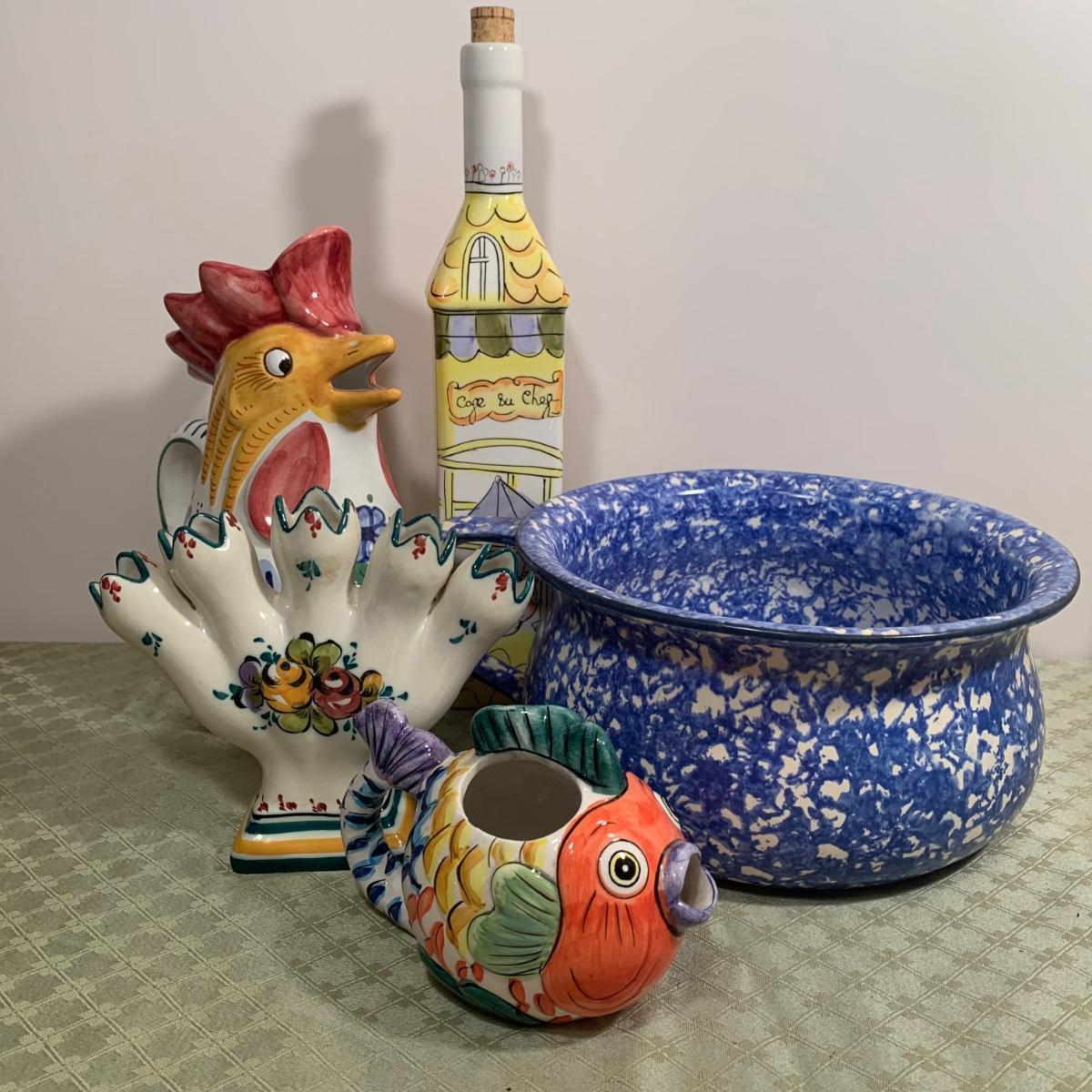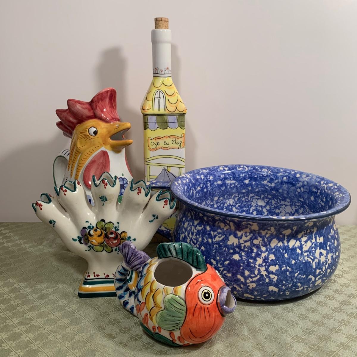 LOT 238R: Stangl Pottery Town And Country Blue Sponge Ware, EPL Alco Baca Hand Painted Finger Vase, Taste Seller Italian Italy Hand Painted Pitcher Pattern, Pescado Hand Painted Pitcher & More
