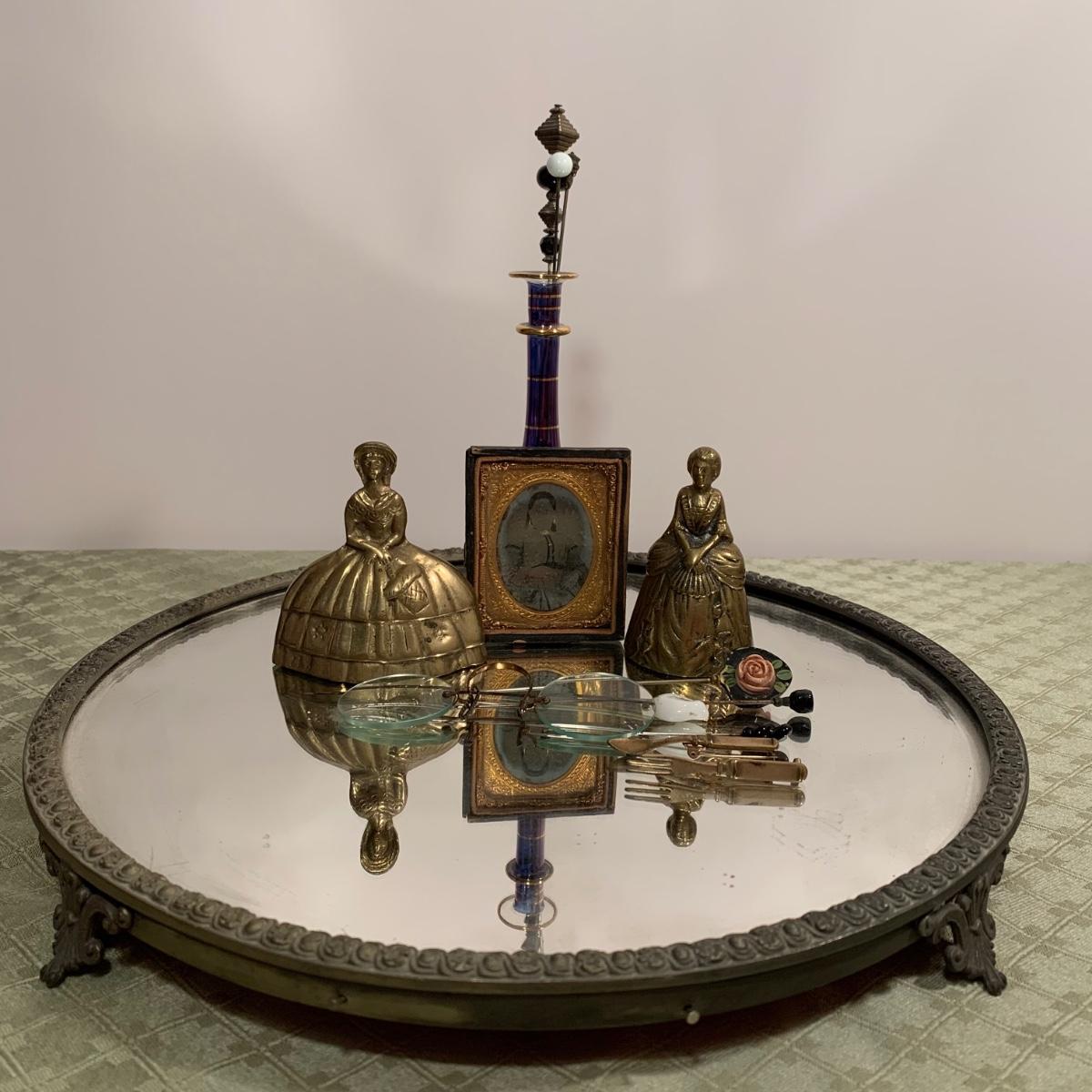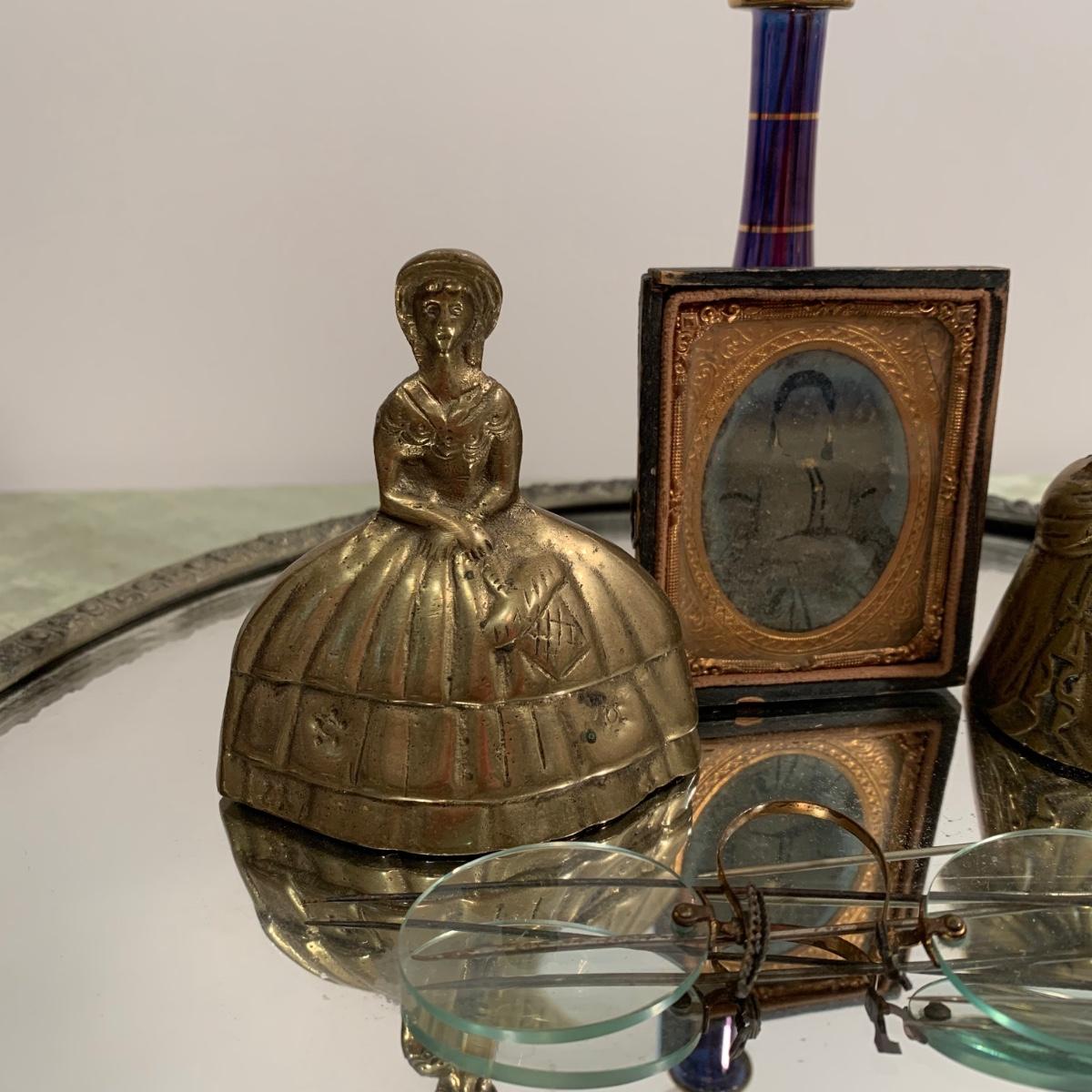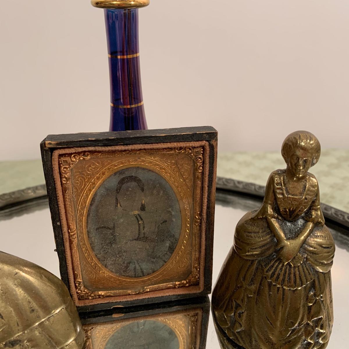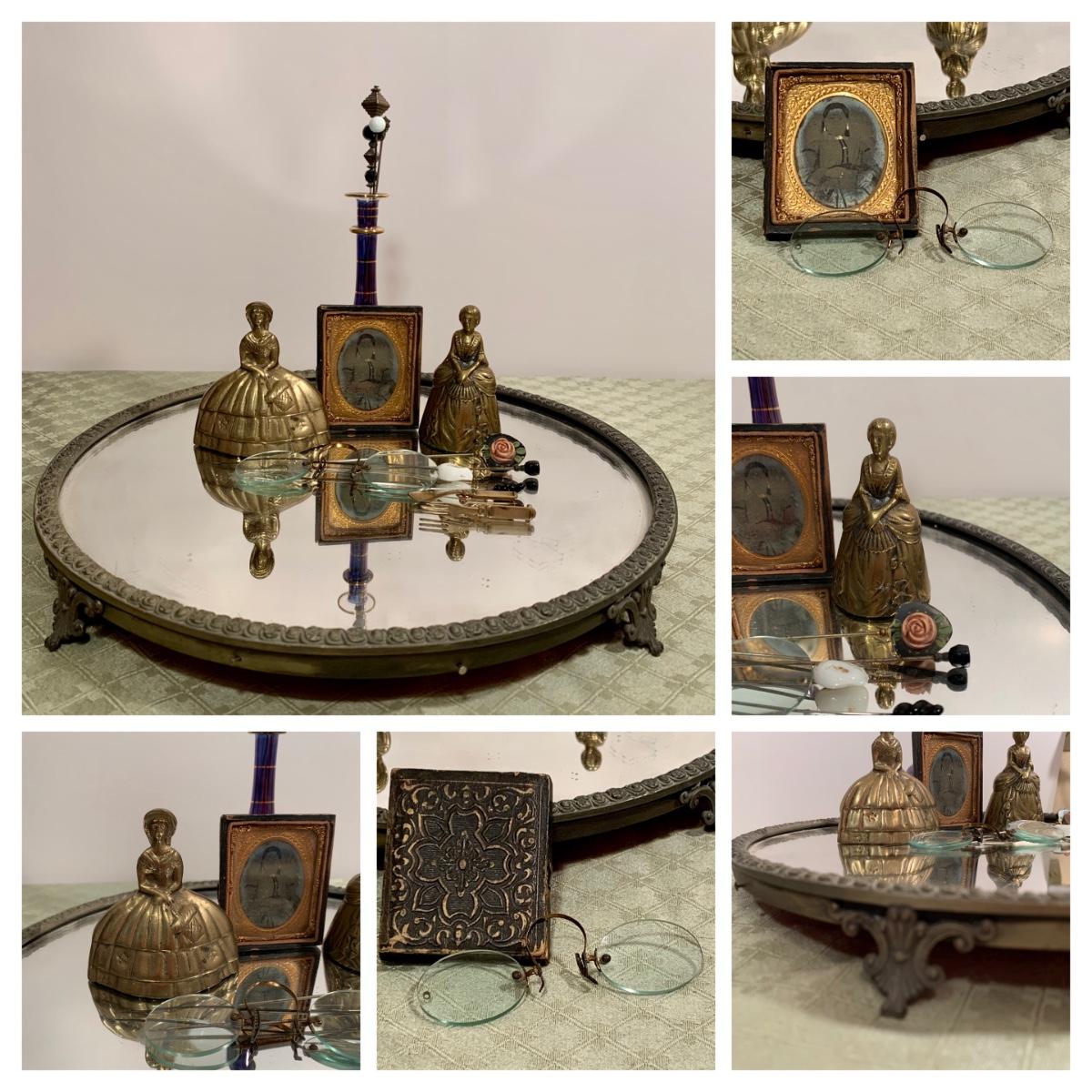 LOT 243R: Antique Daguerreotype Photo, Vintage Round Vanity Tray, Brass Ladies Bells, Glasses, Hat Pin Collection