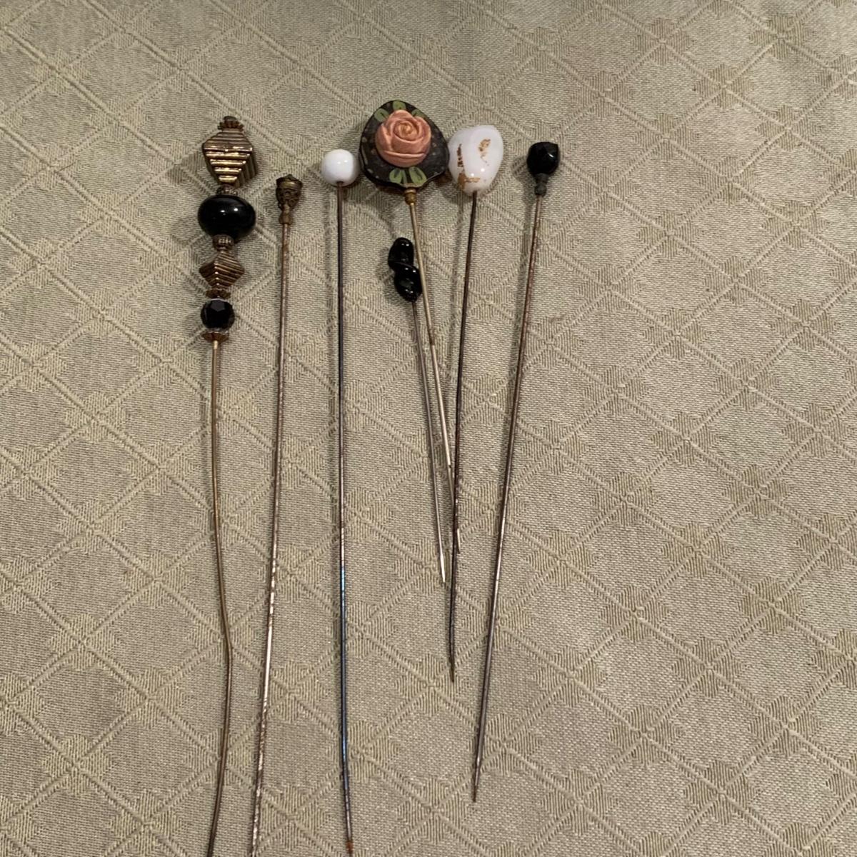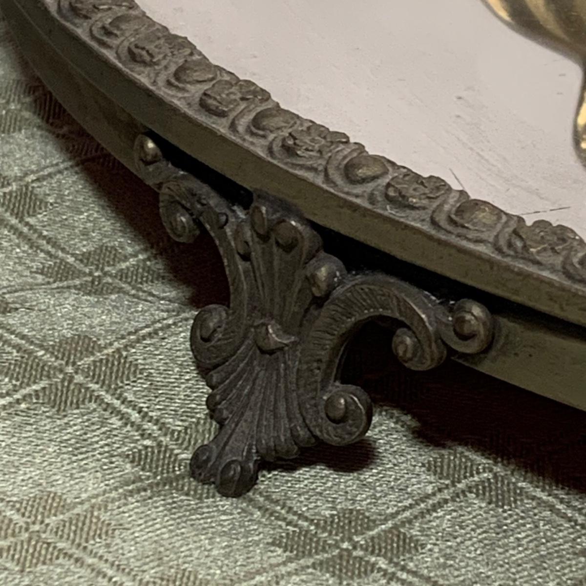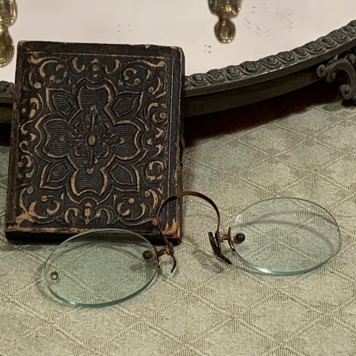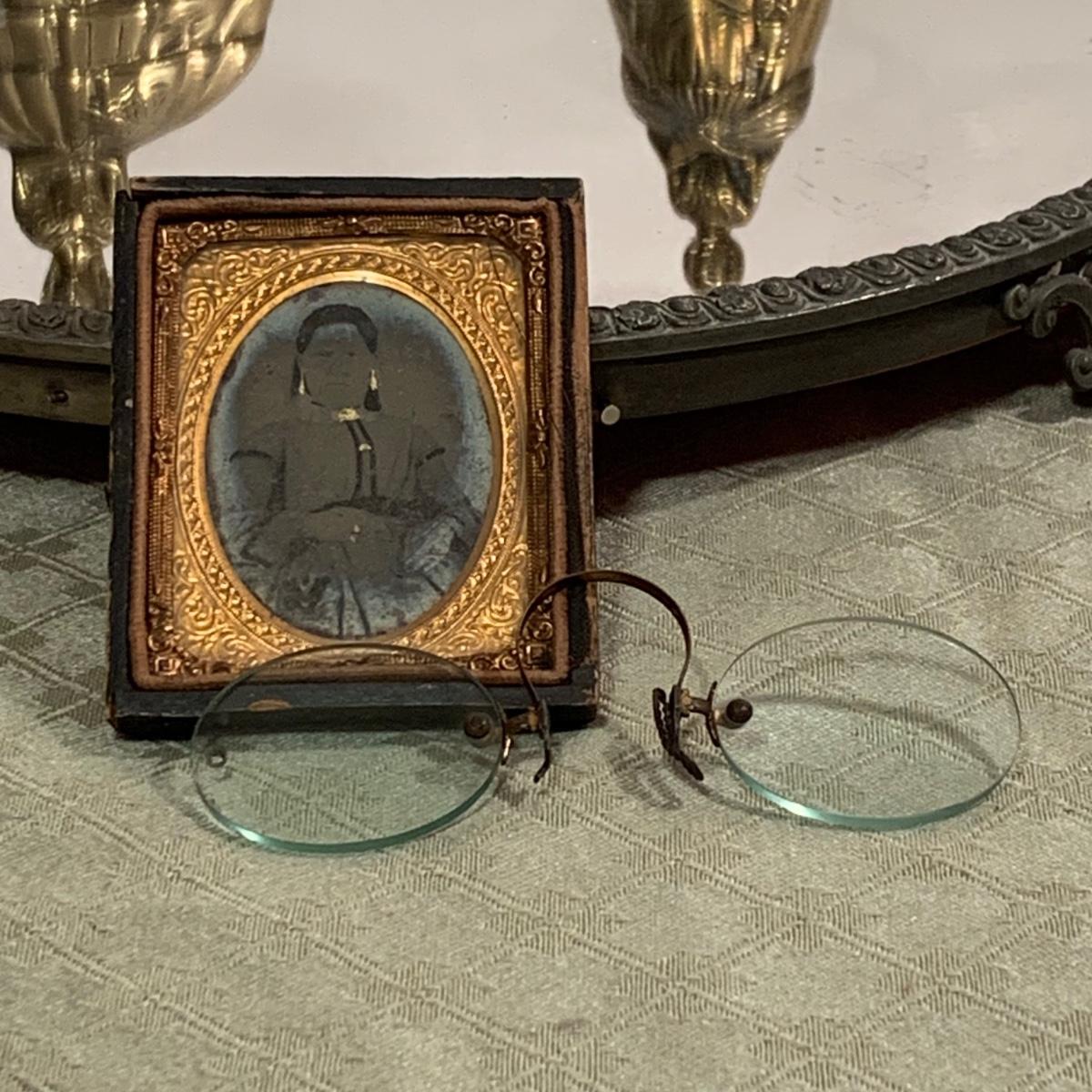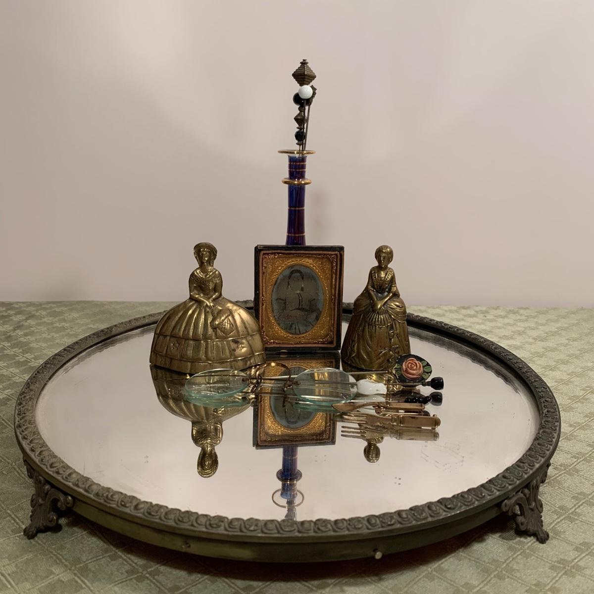 LOT 243R: Antique Daguerreotype Photo, Vintage Round Vanity Tray, Brass Ladies Bells, Glasses, Hat Pin Collection