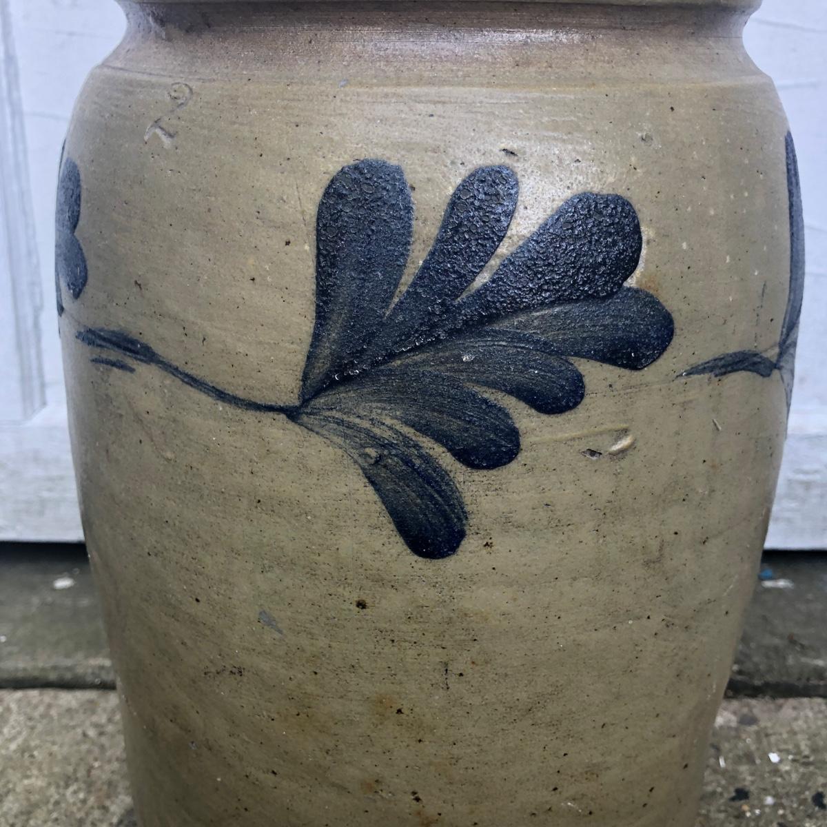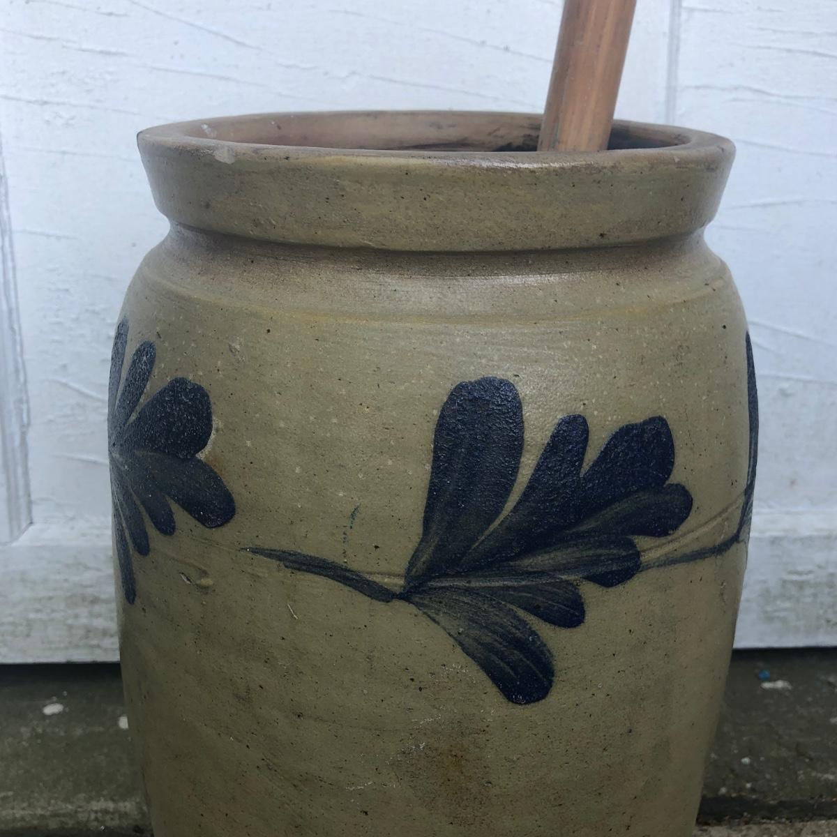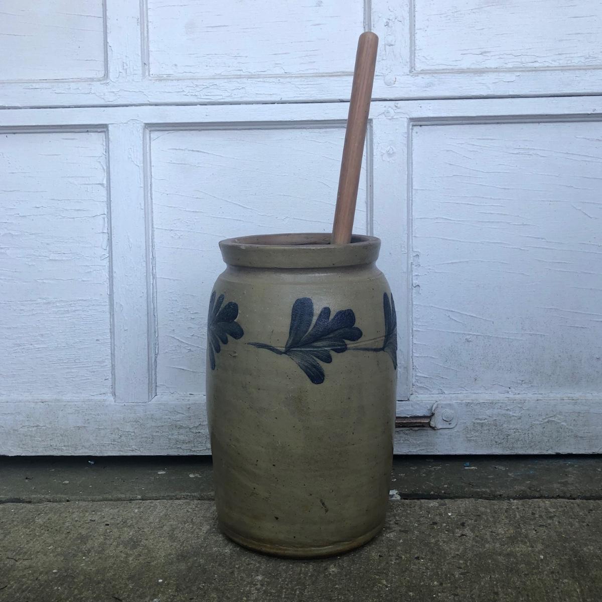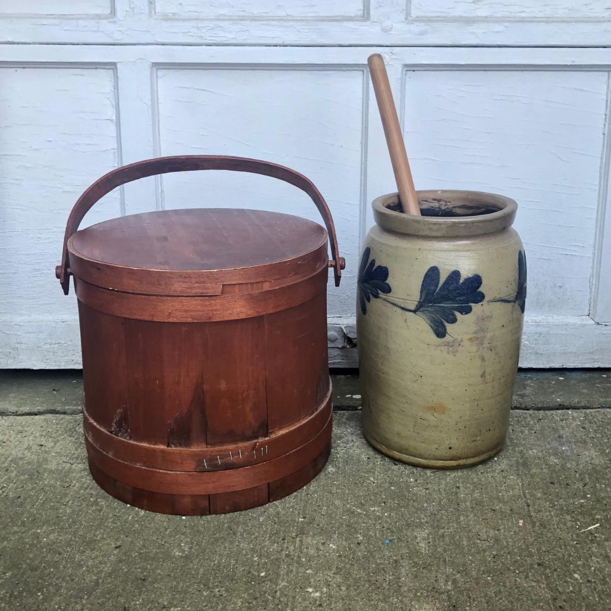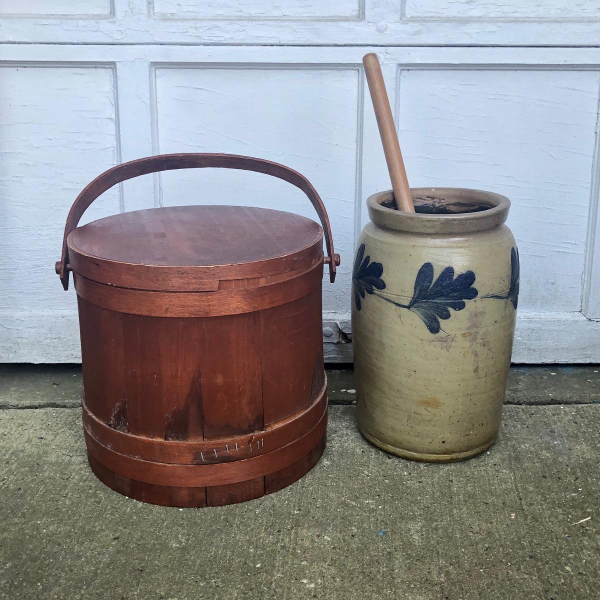 LOT 244M: Cobalt Embellished Stoneware Butter Crock & Antique Wooden Firkin Sugar Bucket