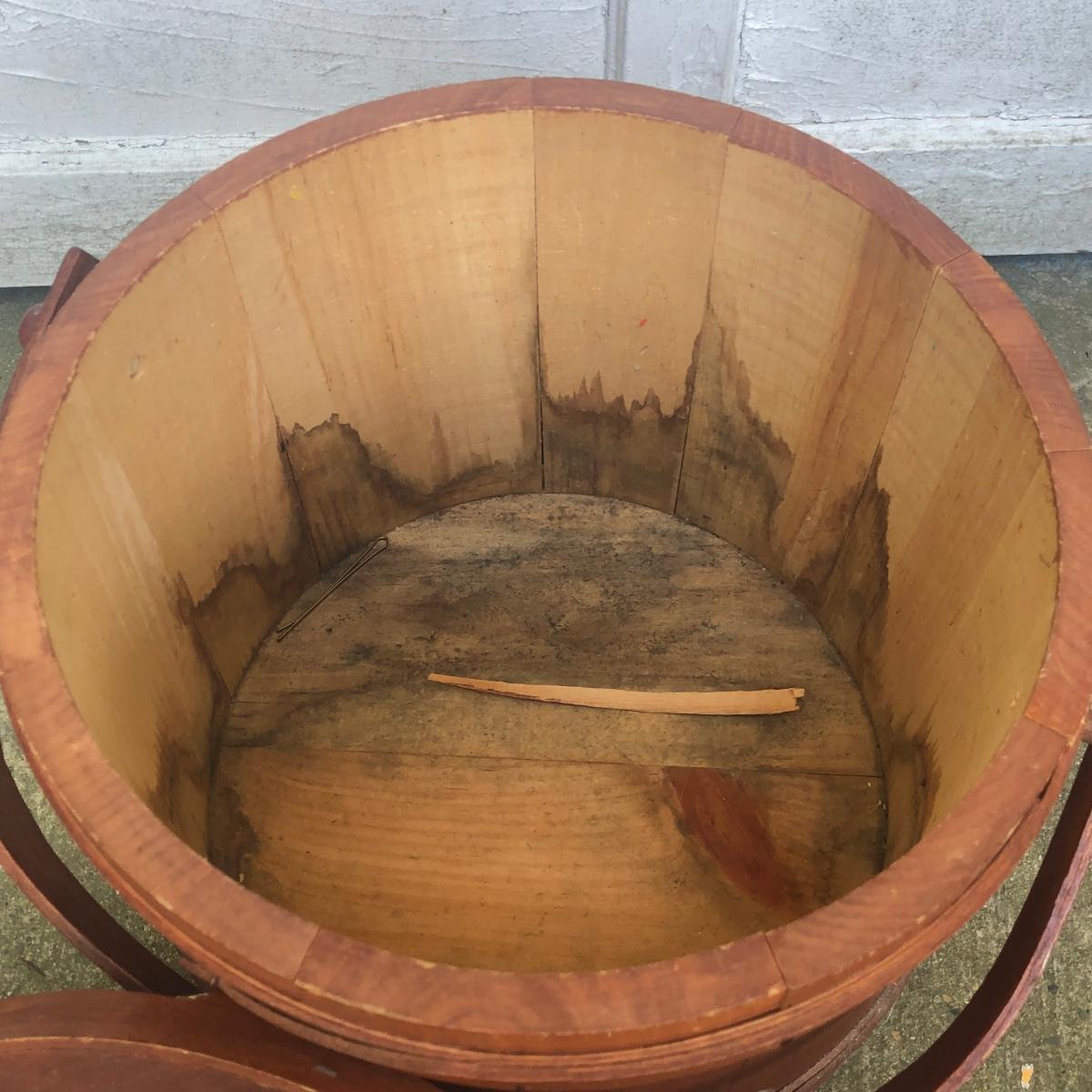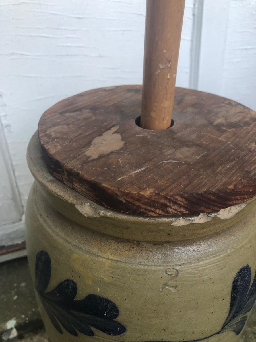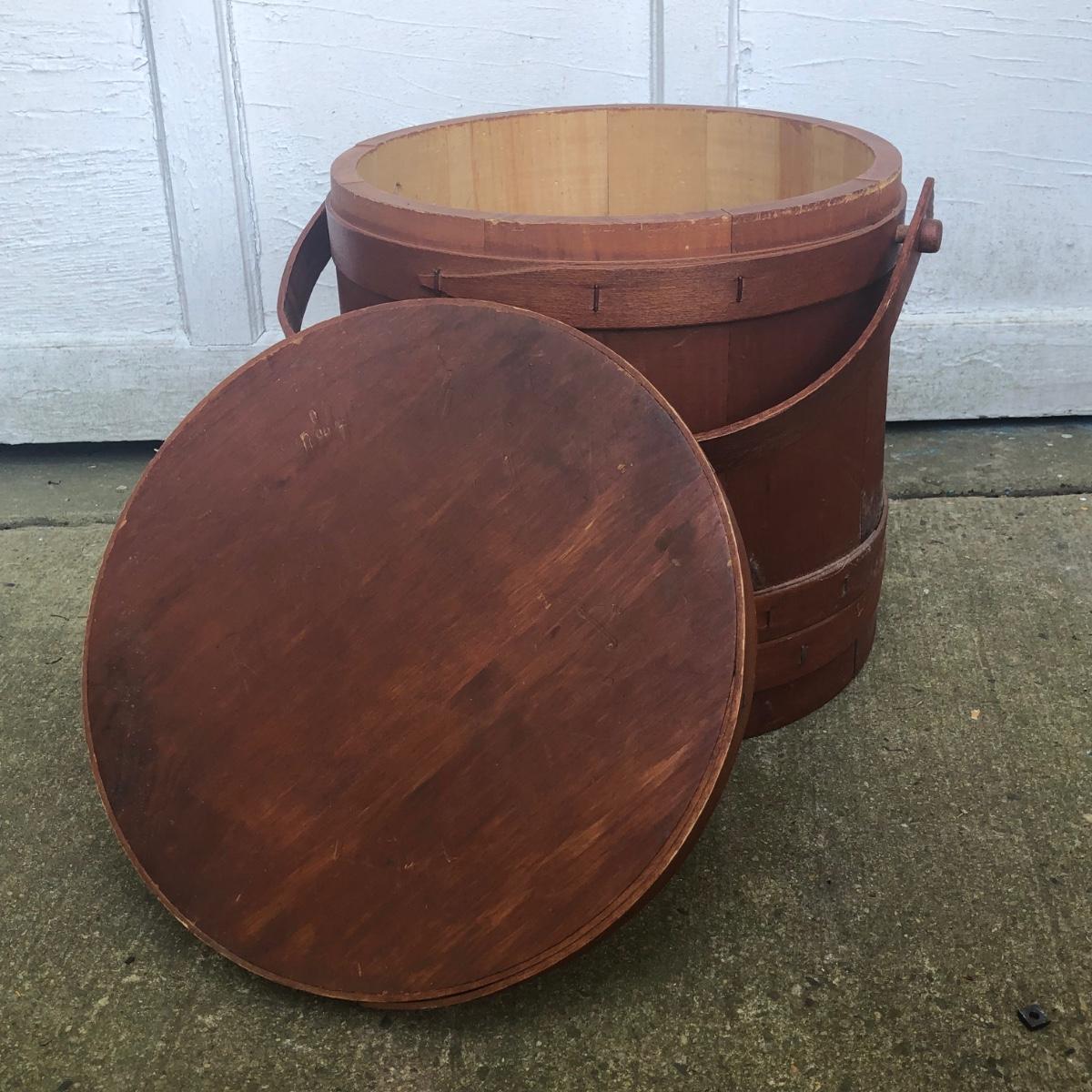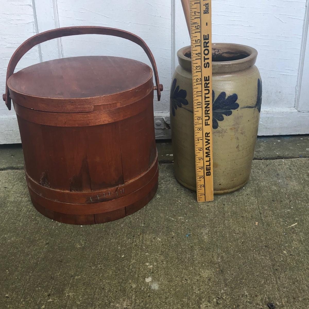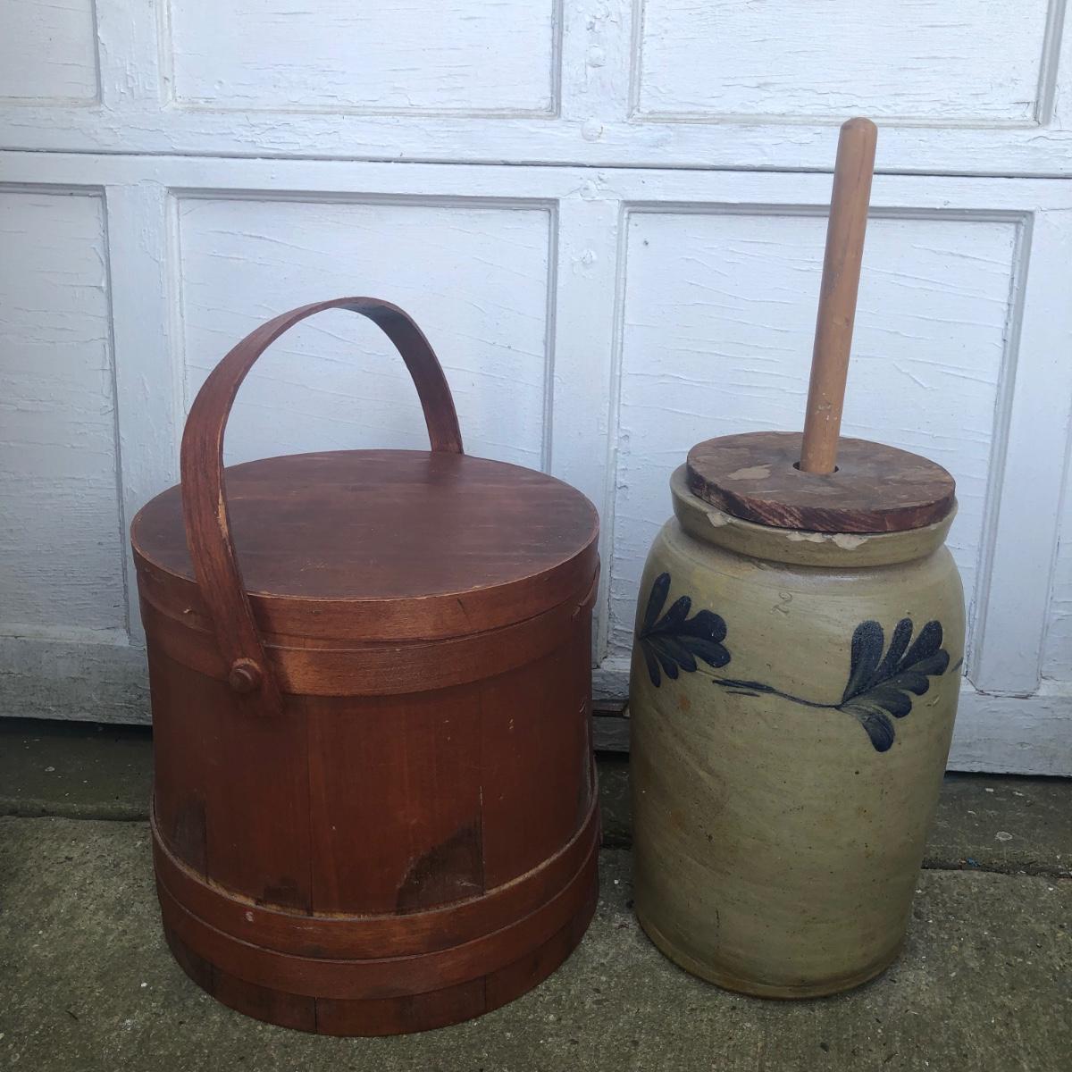 Both have slight condition issues - see photos. Antique Wooden Firkin Sugar Bucket w/ Drop Swing Handle & Pottery Butter Churn