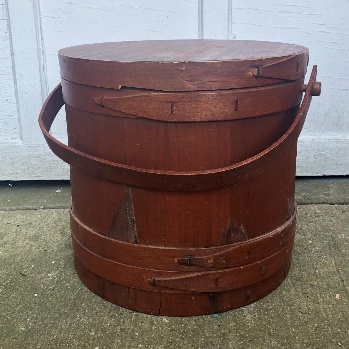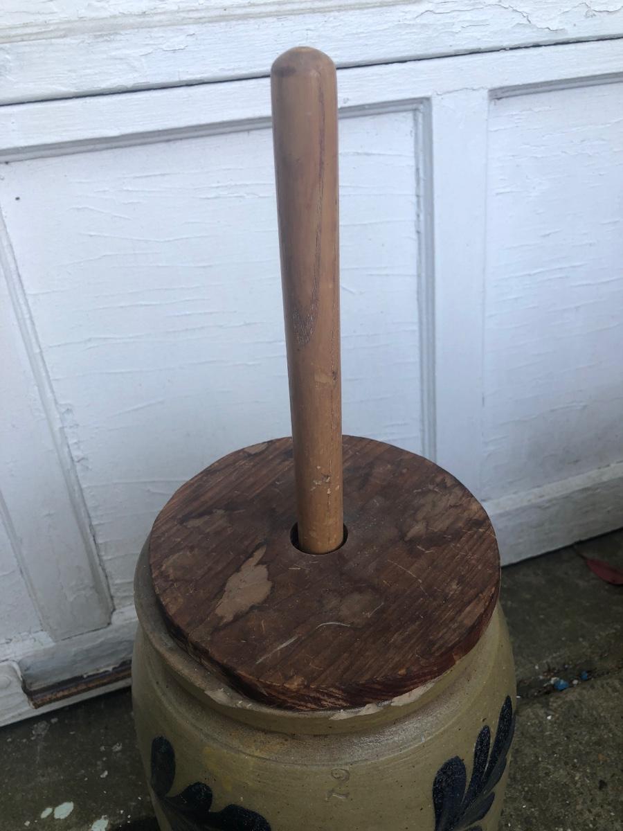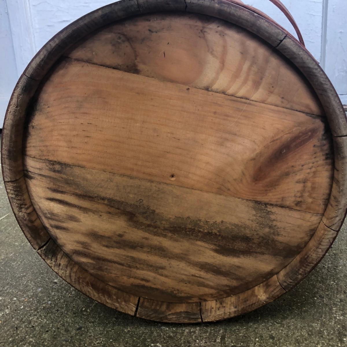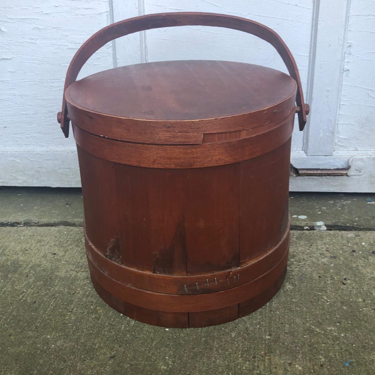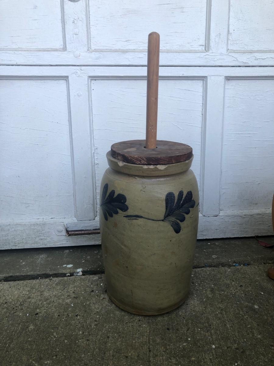 Both have slight condition issues - see photos. Antique Wooden Firkin Sugar Bucket w/ Drop Swing Handle & Pottery Butter Churn