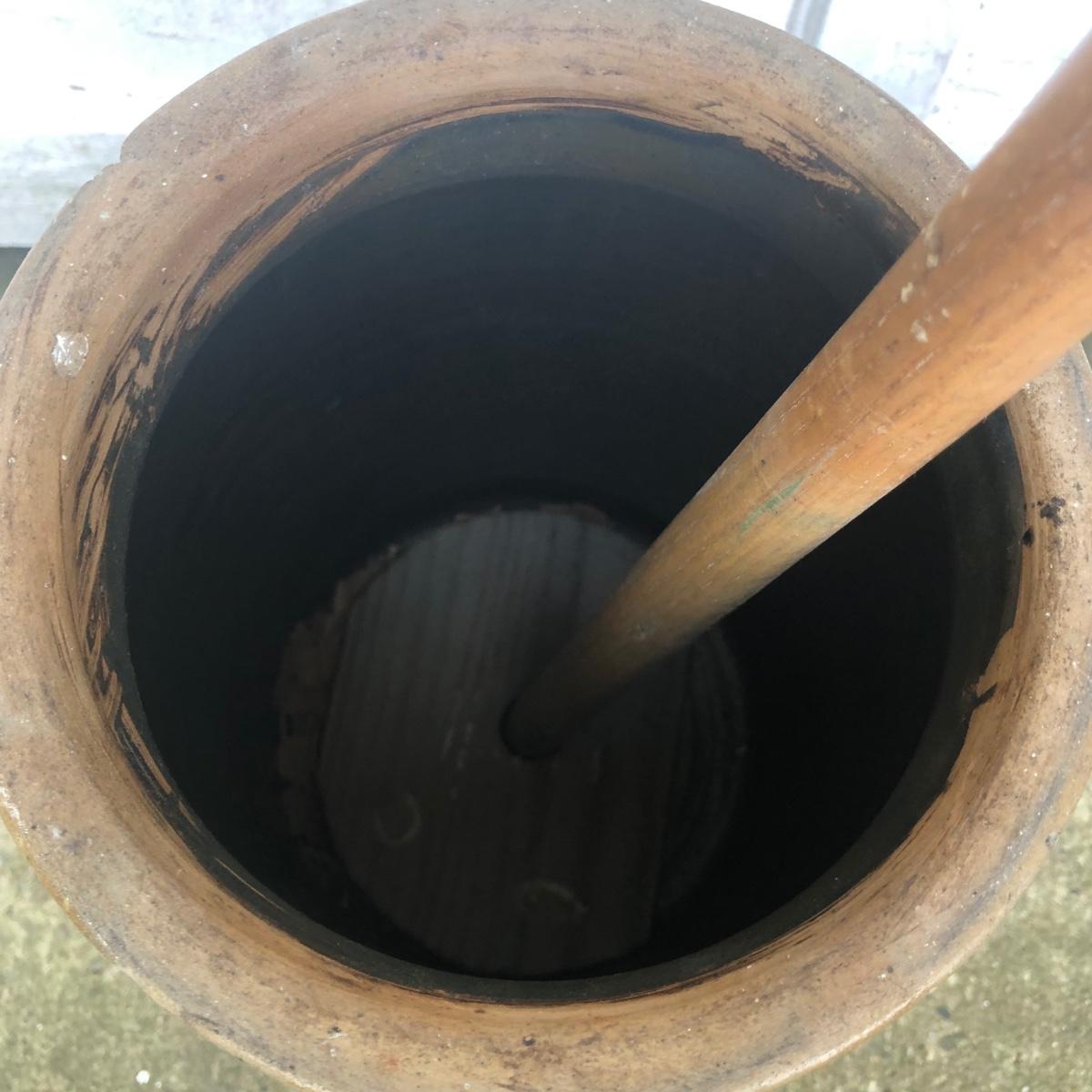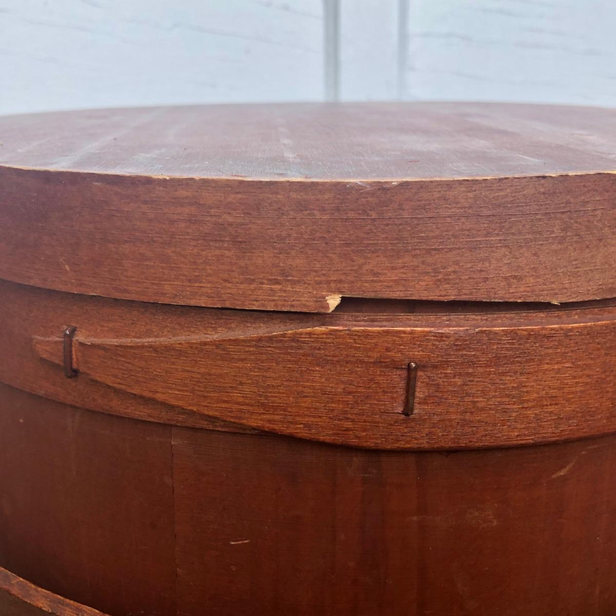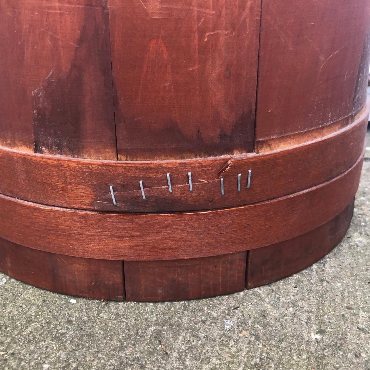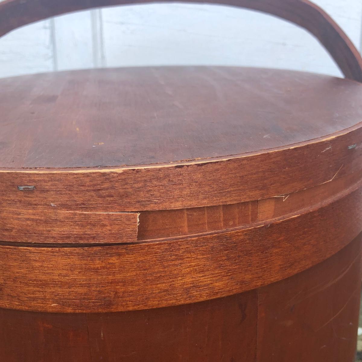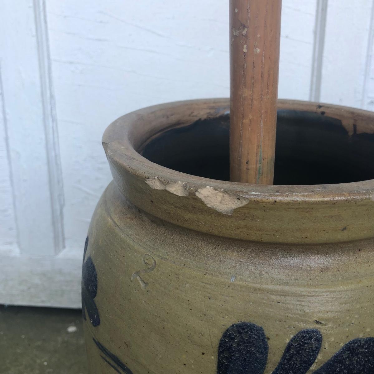 Both have slight condition issues - see photos. Antique Wooden Firkin Sugar Bucket w/ Drop Swing Handle & Pottery Butter Churn