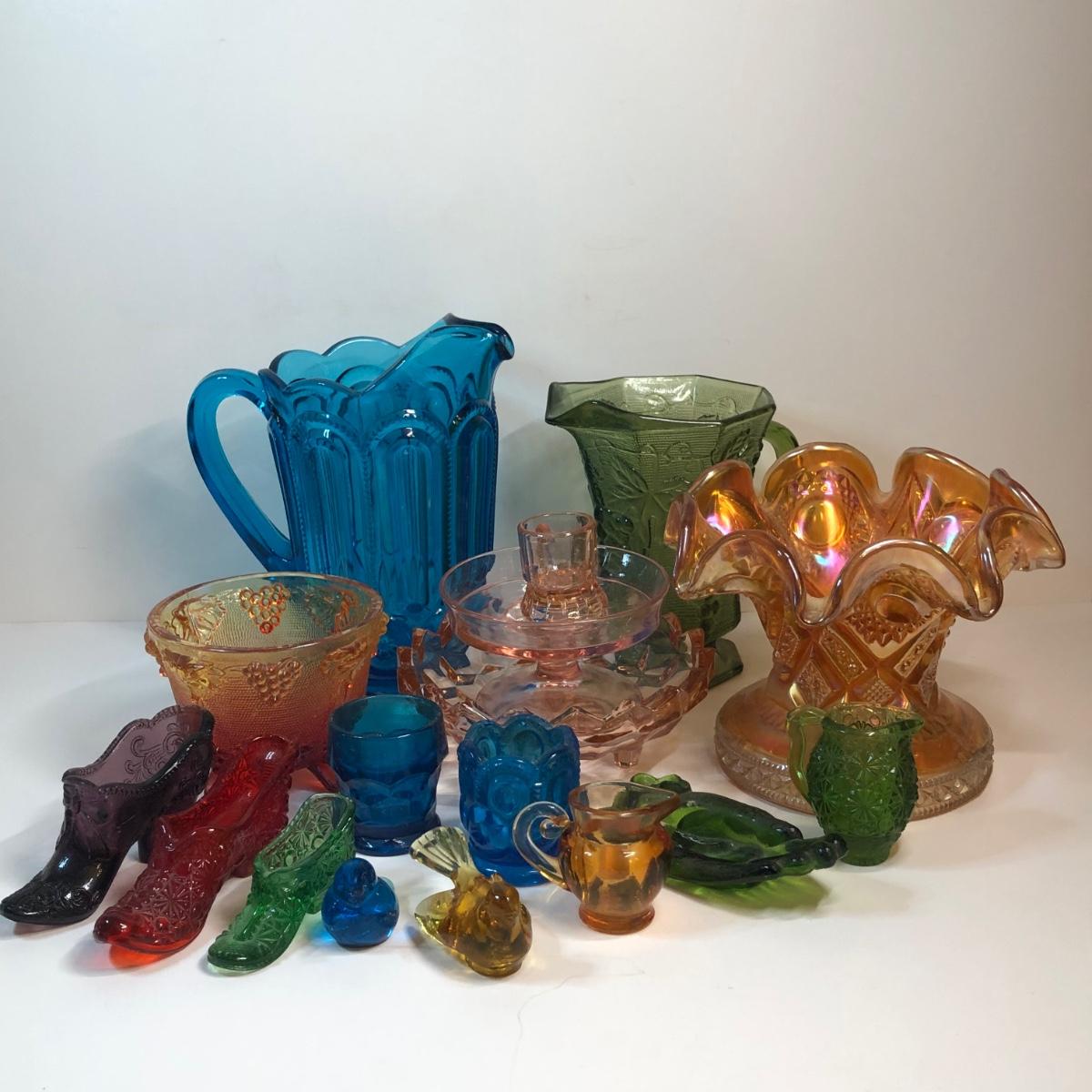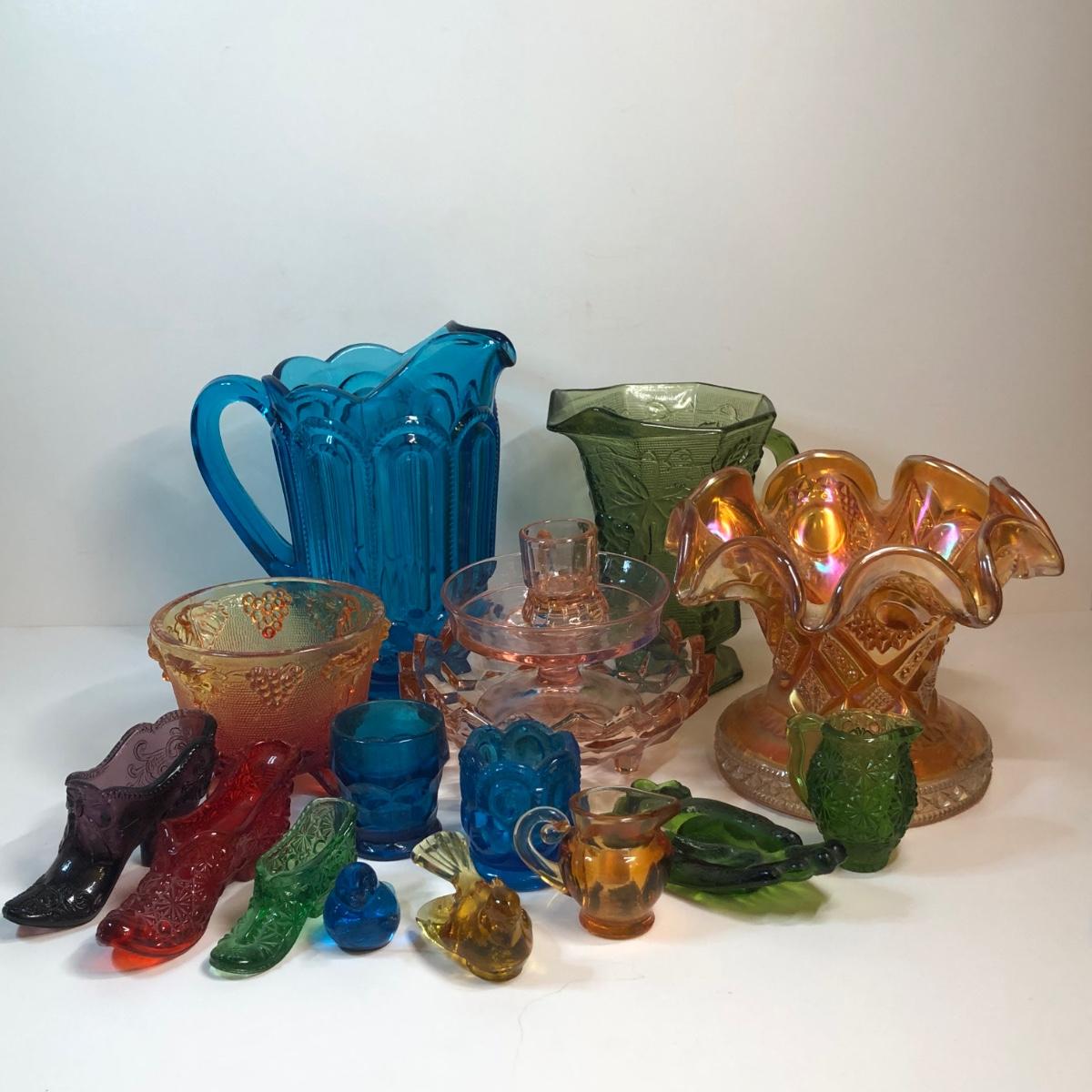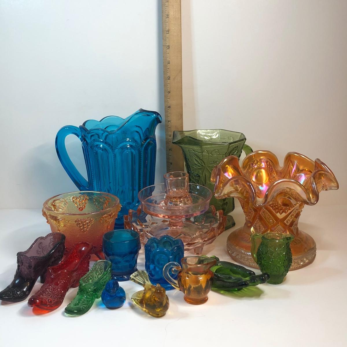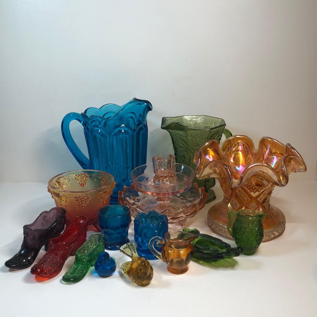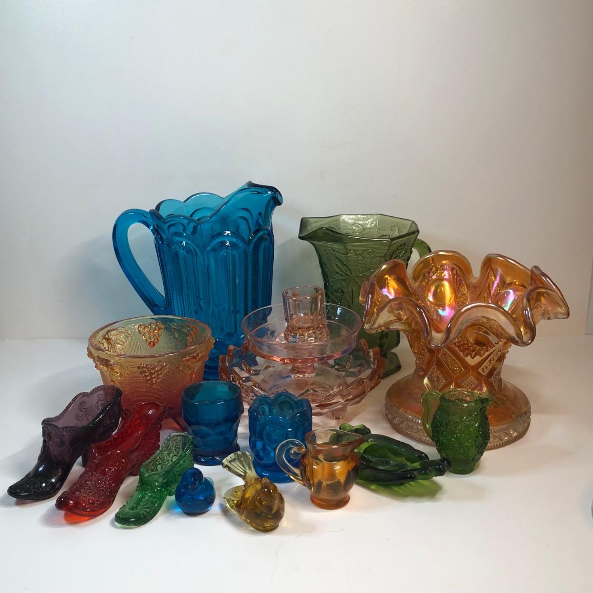 LOT 267M: Colorful Glass Collection - Pitchers, Decorative Bowls, Miniature Shoes & More