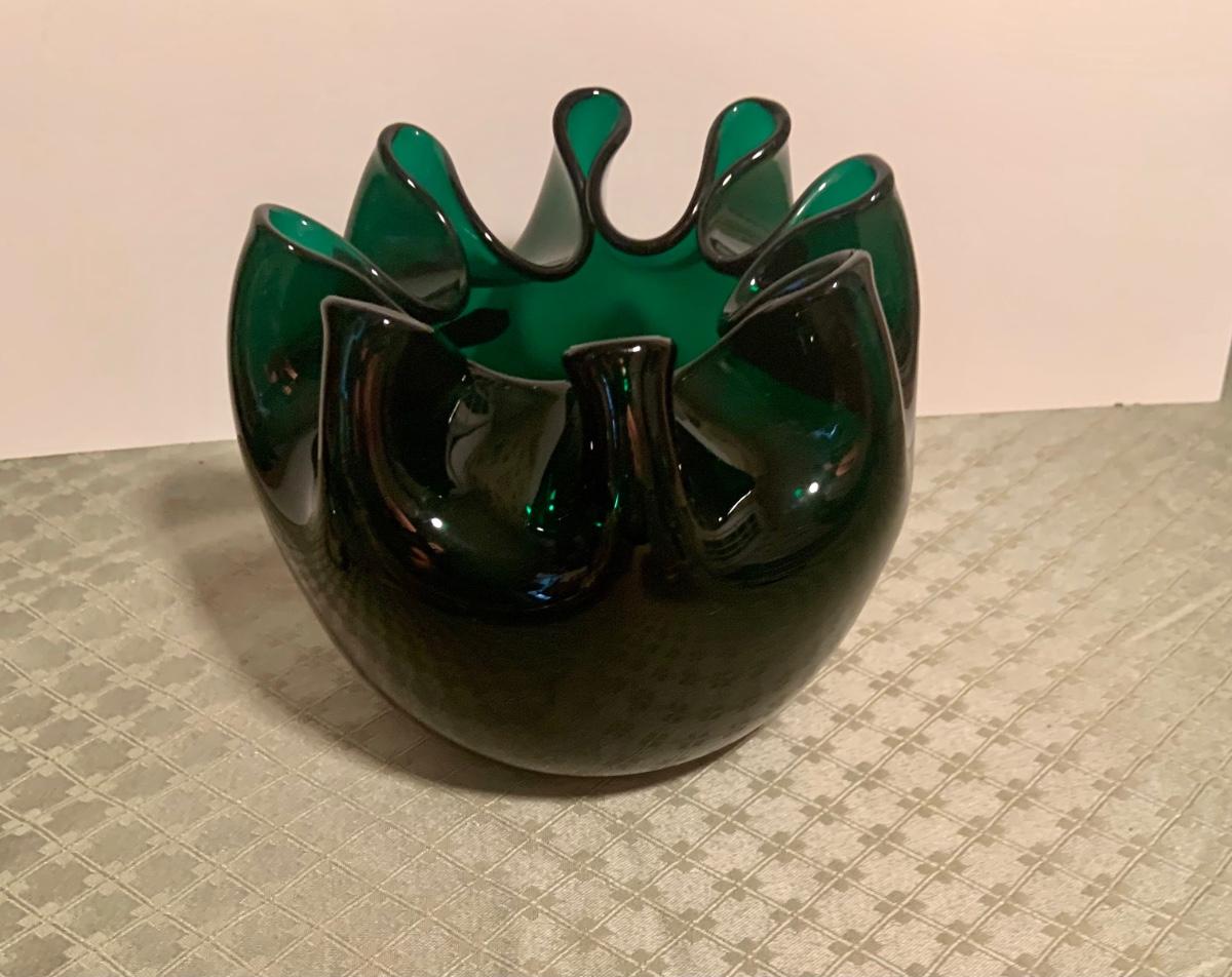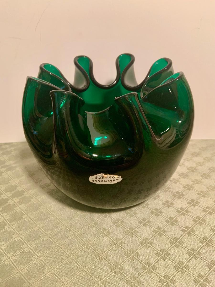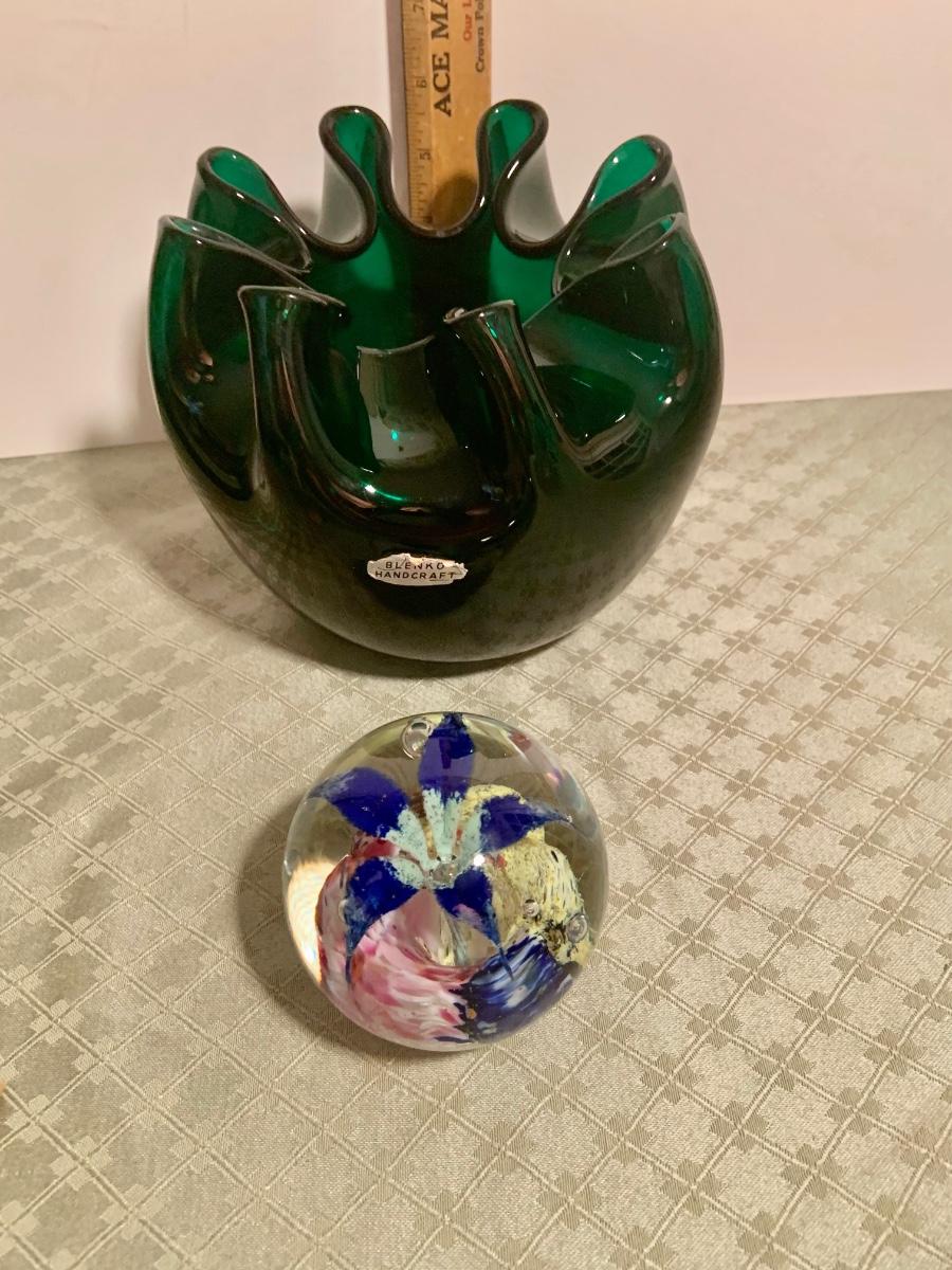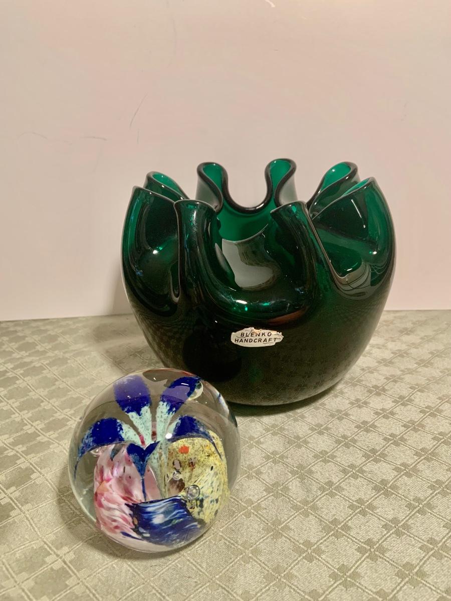 LOT 271G; Art Glass - Blenko Handcrafted Emerald Green Rose Bowl and Glass Orb with Flower