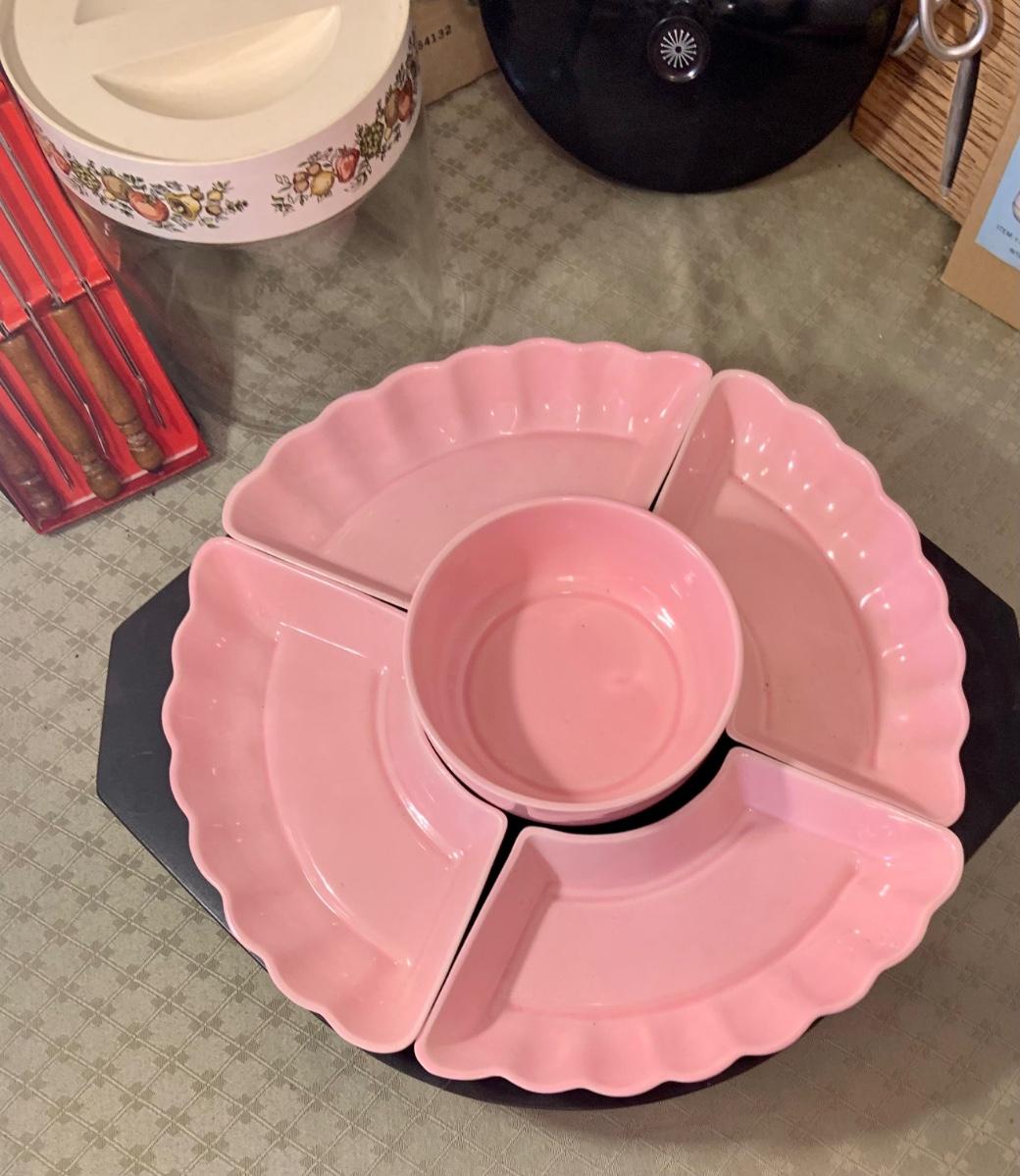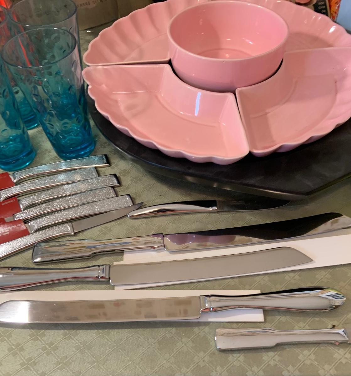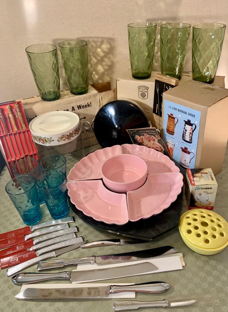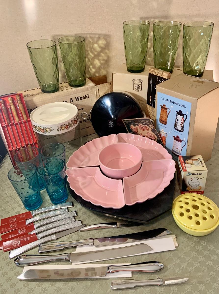 LOT 278G: MCM Kitchen Must Haves Including a Pink Ceramic Lazy Susan, Foundue Set and Dazey Seal a Meal in Original Boxes; Towle Knives and So Much More