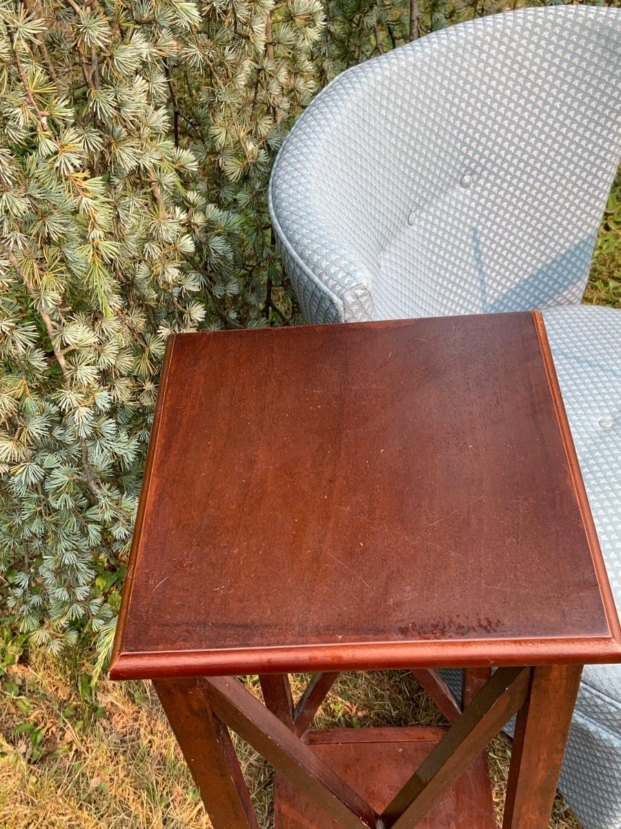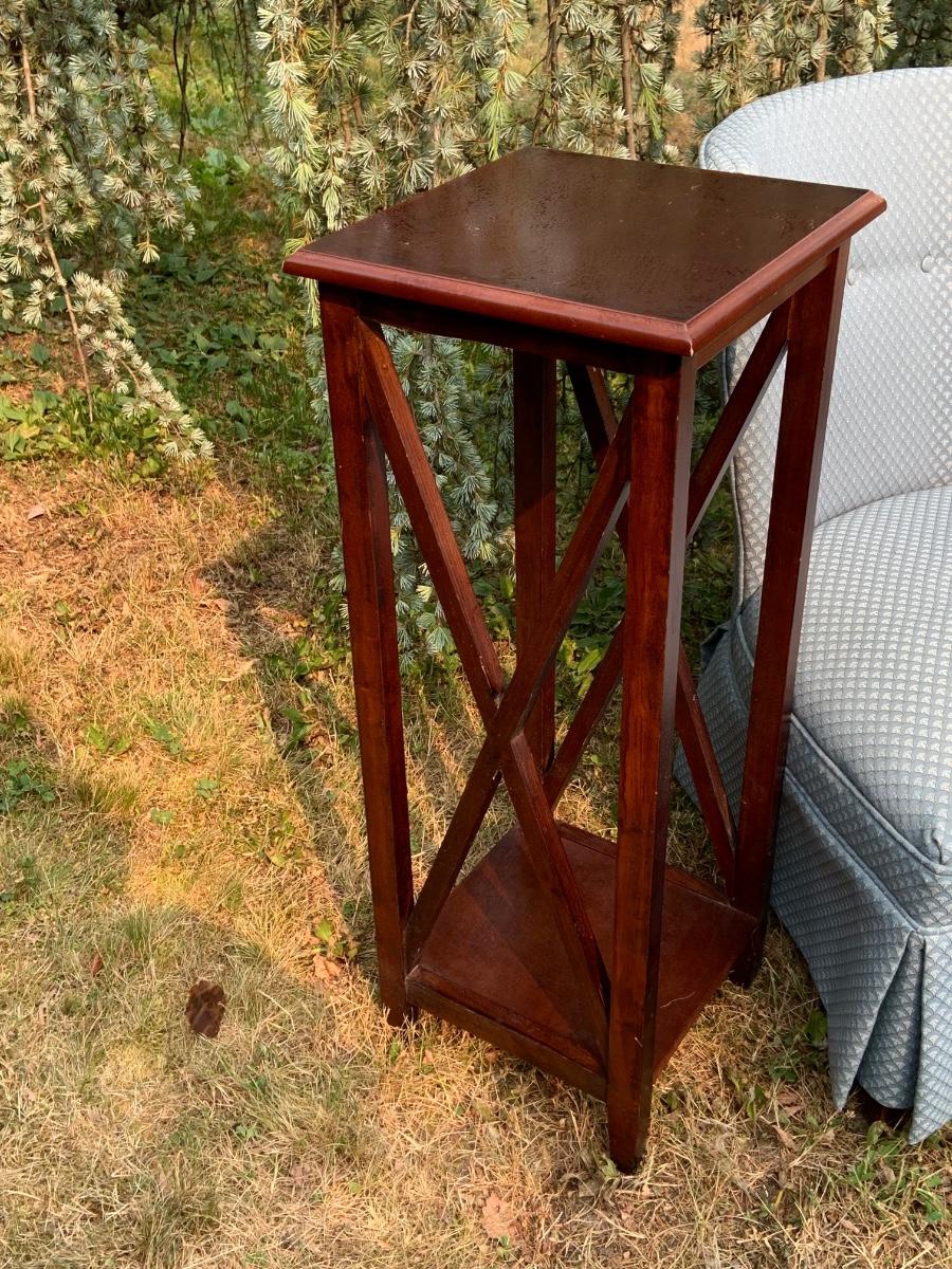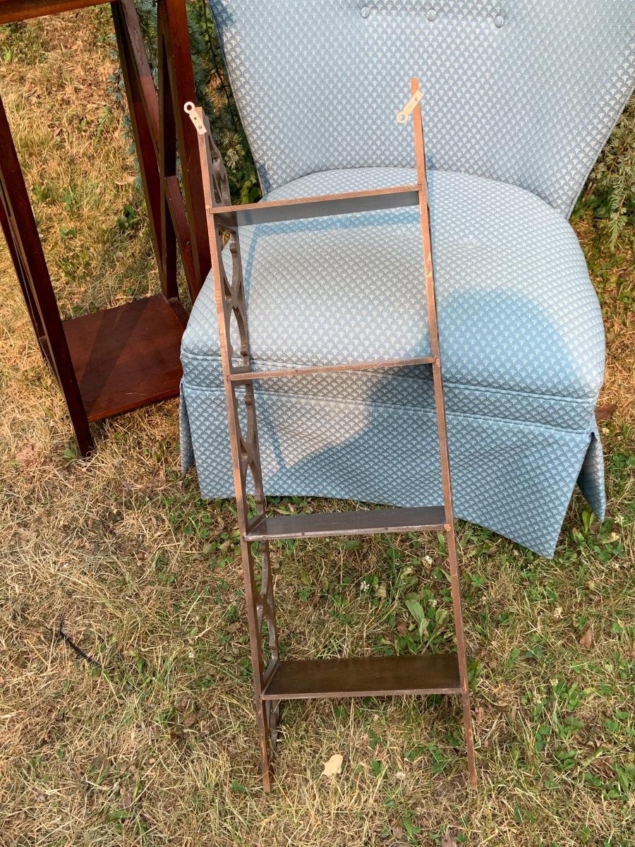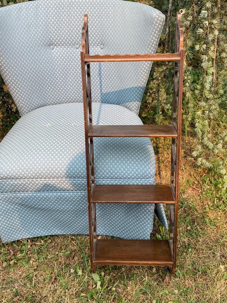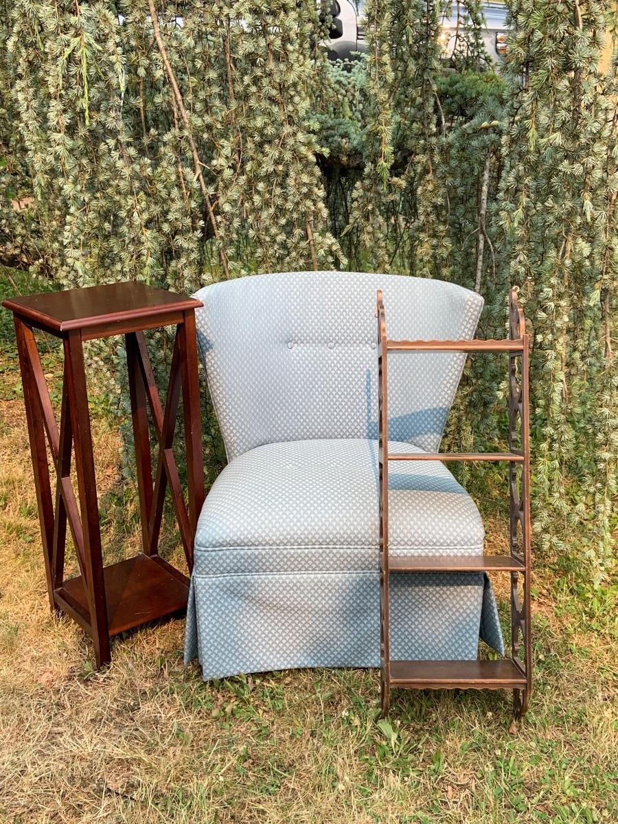 The Chair is approx 23 x 19 x 29" the Shelf is 11 x 5 x 33" and the Table is 12 x 12 x 31" Please see all pictures as they are the best representation of the items. The pictures show condition, measurements if taken, and what is included in the lot. Due to the large amount that we photograph and the time frame, we are not always able to take measurements. All items unless noted, are pre-owned and have been used. If you purchased furniture, you must bring help. We do not allow one person to carry large furniture out on their own. Bring help, tools and a truck for the safety of our client’s homes, and your personal safety. Any damages that result to the property including walls, and floors due to moving of the furniture will be charged to the buyer. Company policy. Thank you.