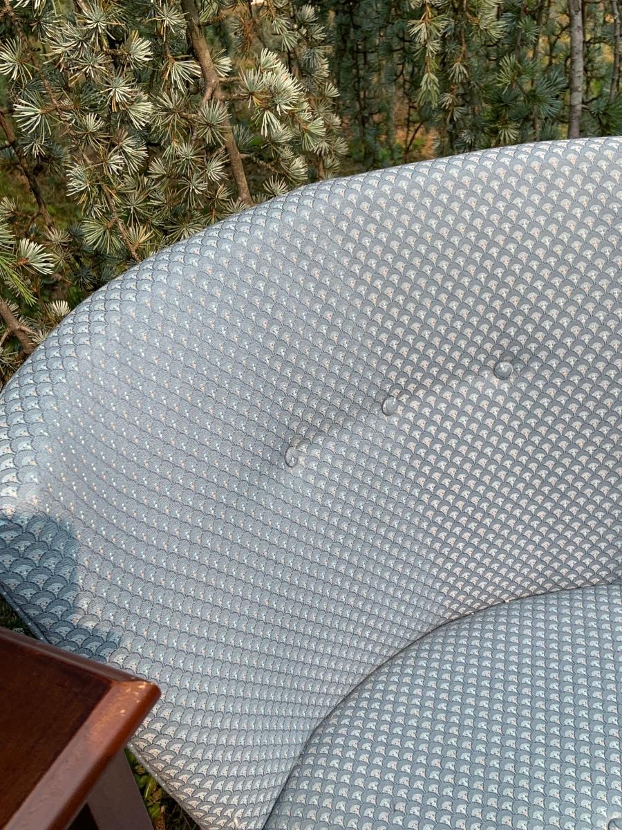 LOT:288G: Mid- Century Blue Cocktail Chair with Vintage Wall Shelf and Contemorary Lamp Table.