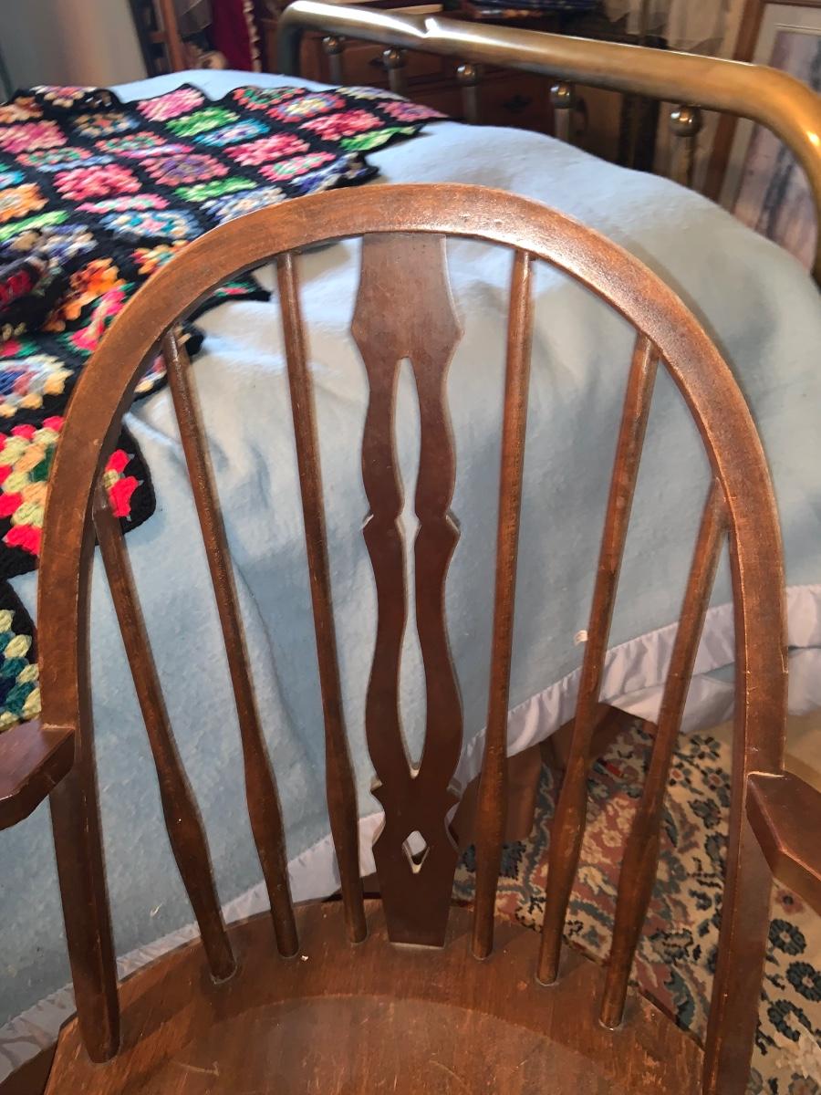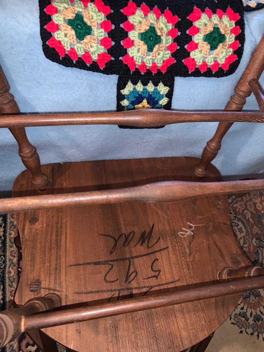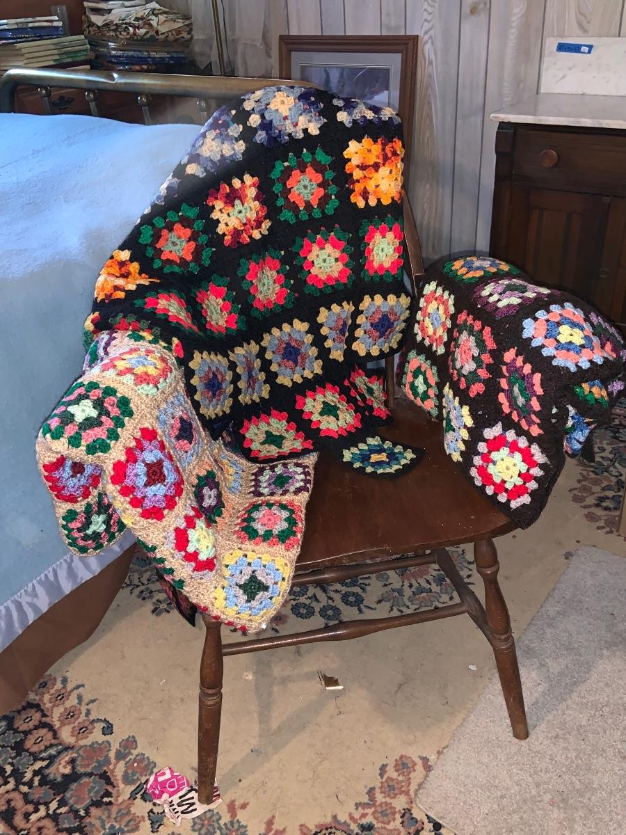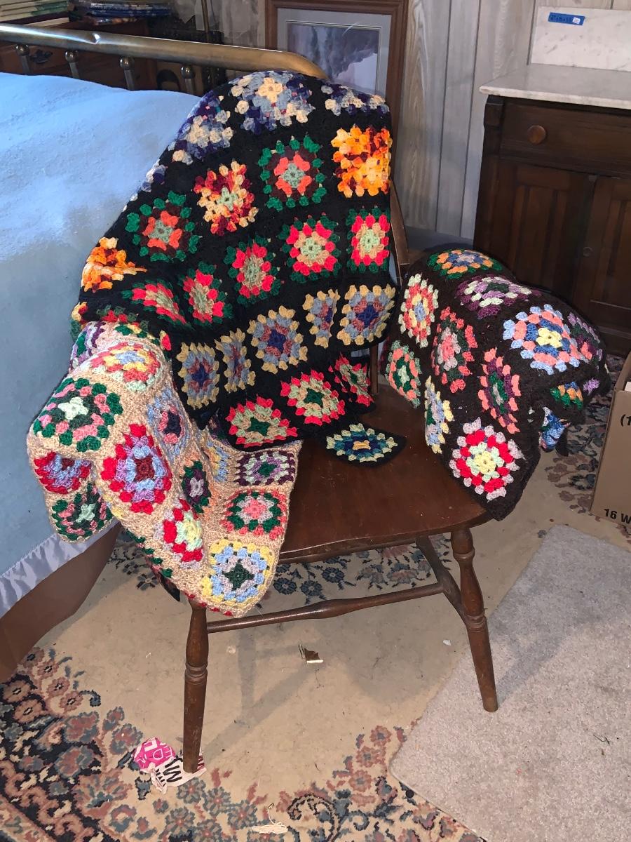 LOT:297G: Vintage Wooden Windsor Chair with 3 Granny Square Crocheted Throws/ Baby Blankets