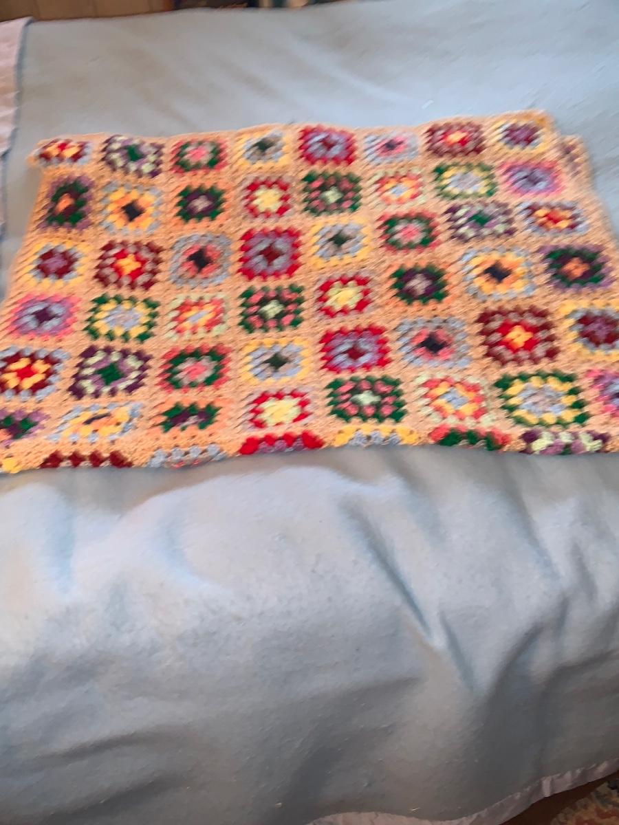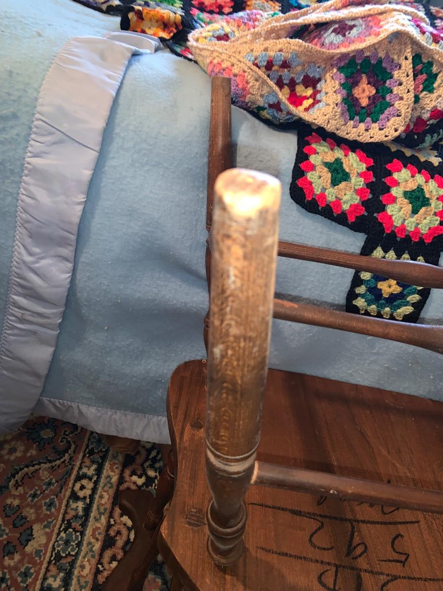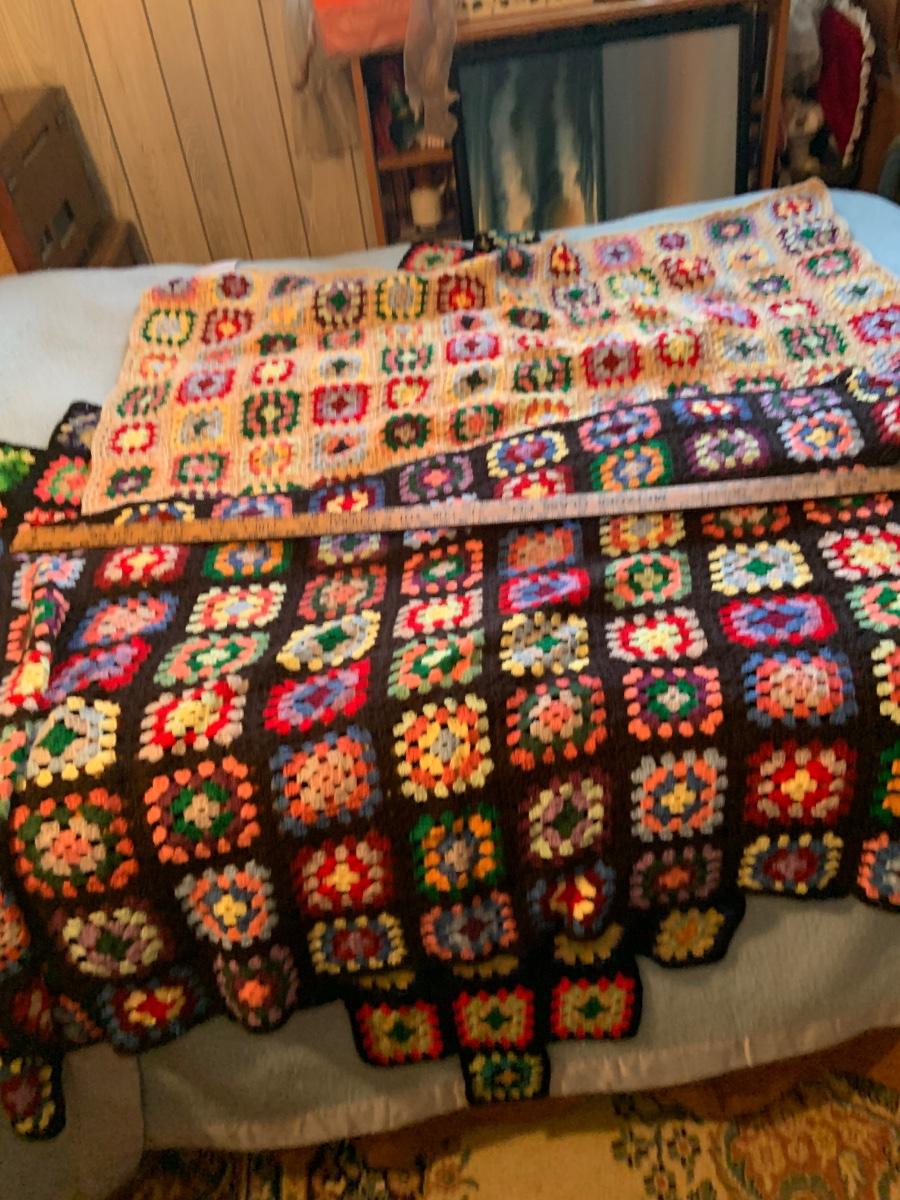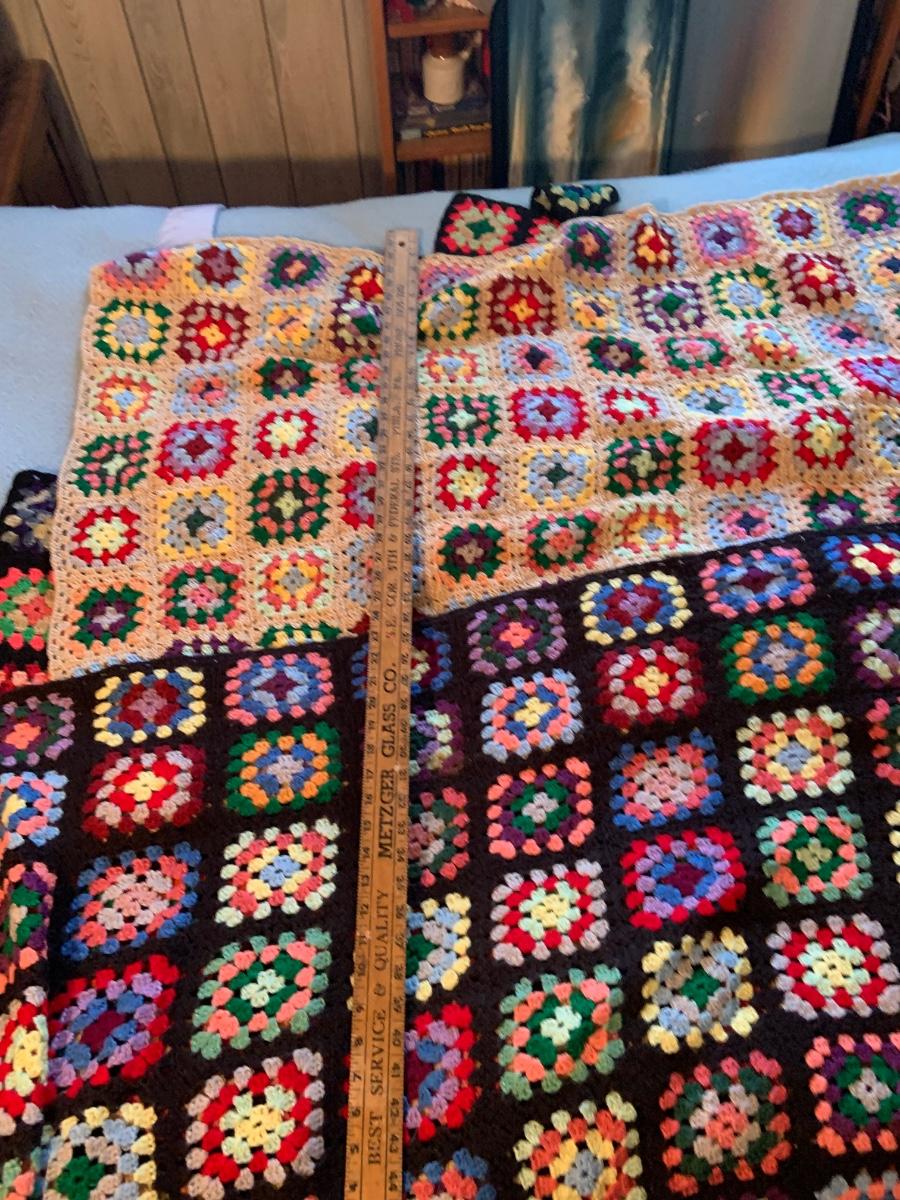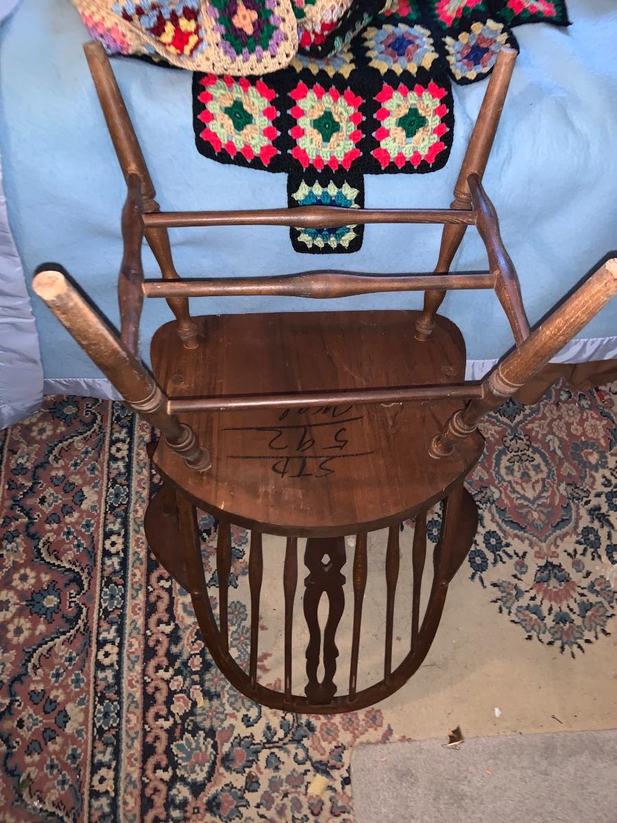 LOT:297G: Vintage Wooden Windsor Chair with 3 Granny Square Crocheted Throws/ Baby Blankets