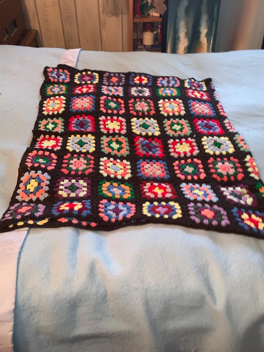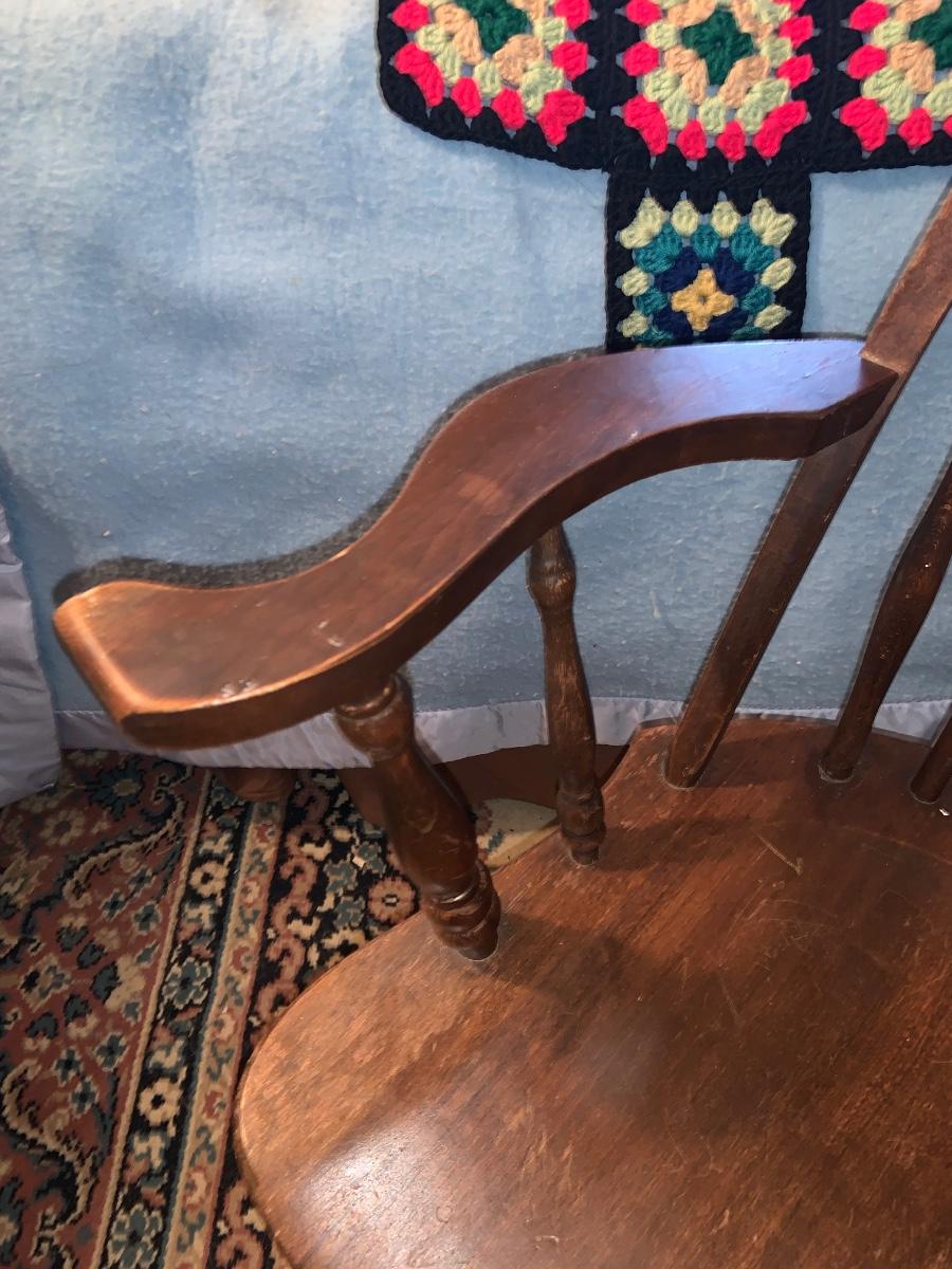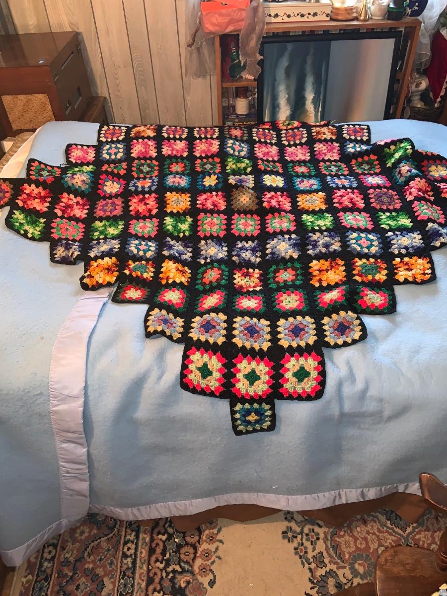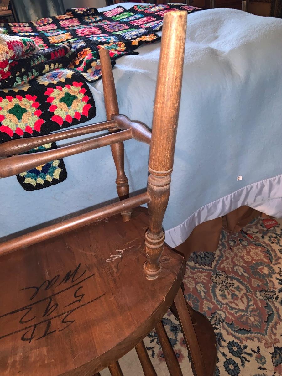 LOT:297G: Vintage Wooden Windsor Chair with 3 Granny Square Crocheted Throws/ Baby Blankets