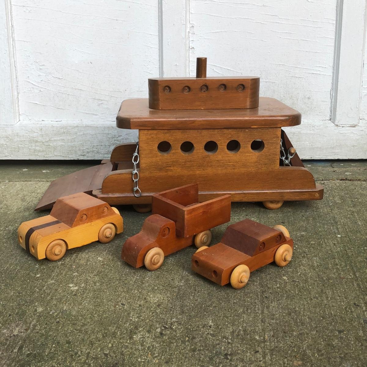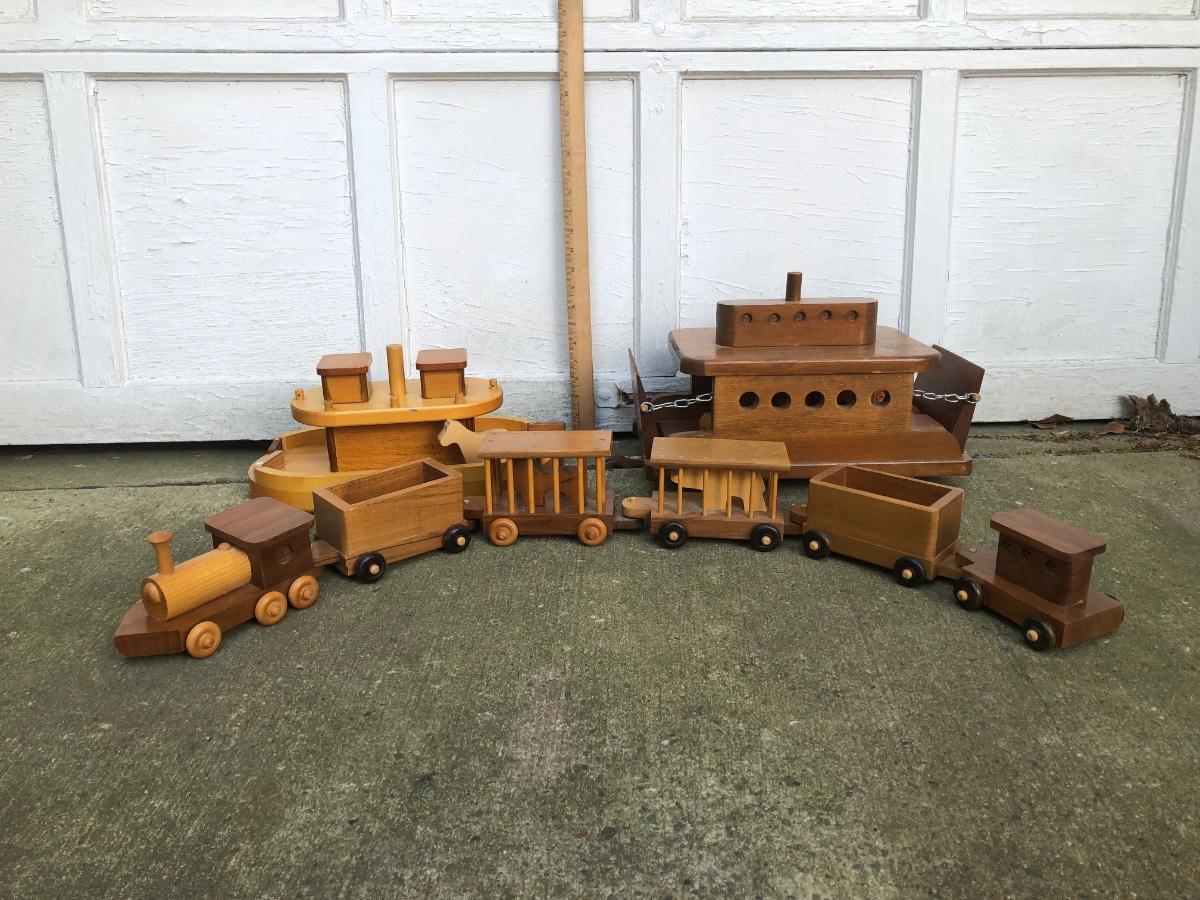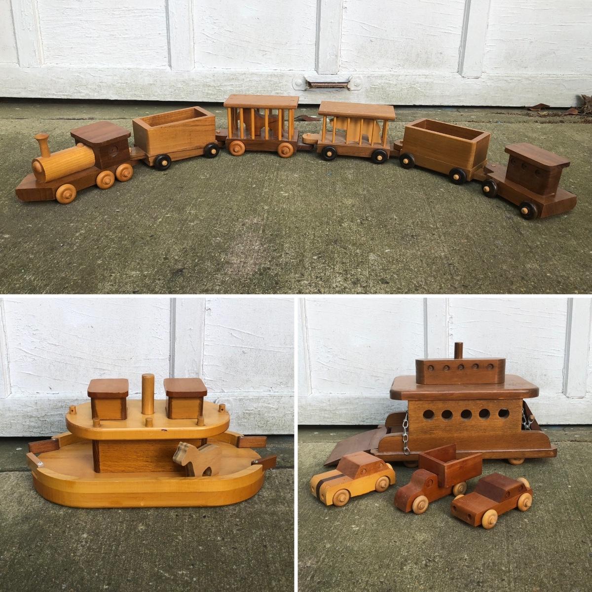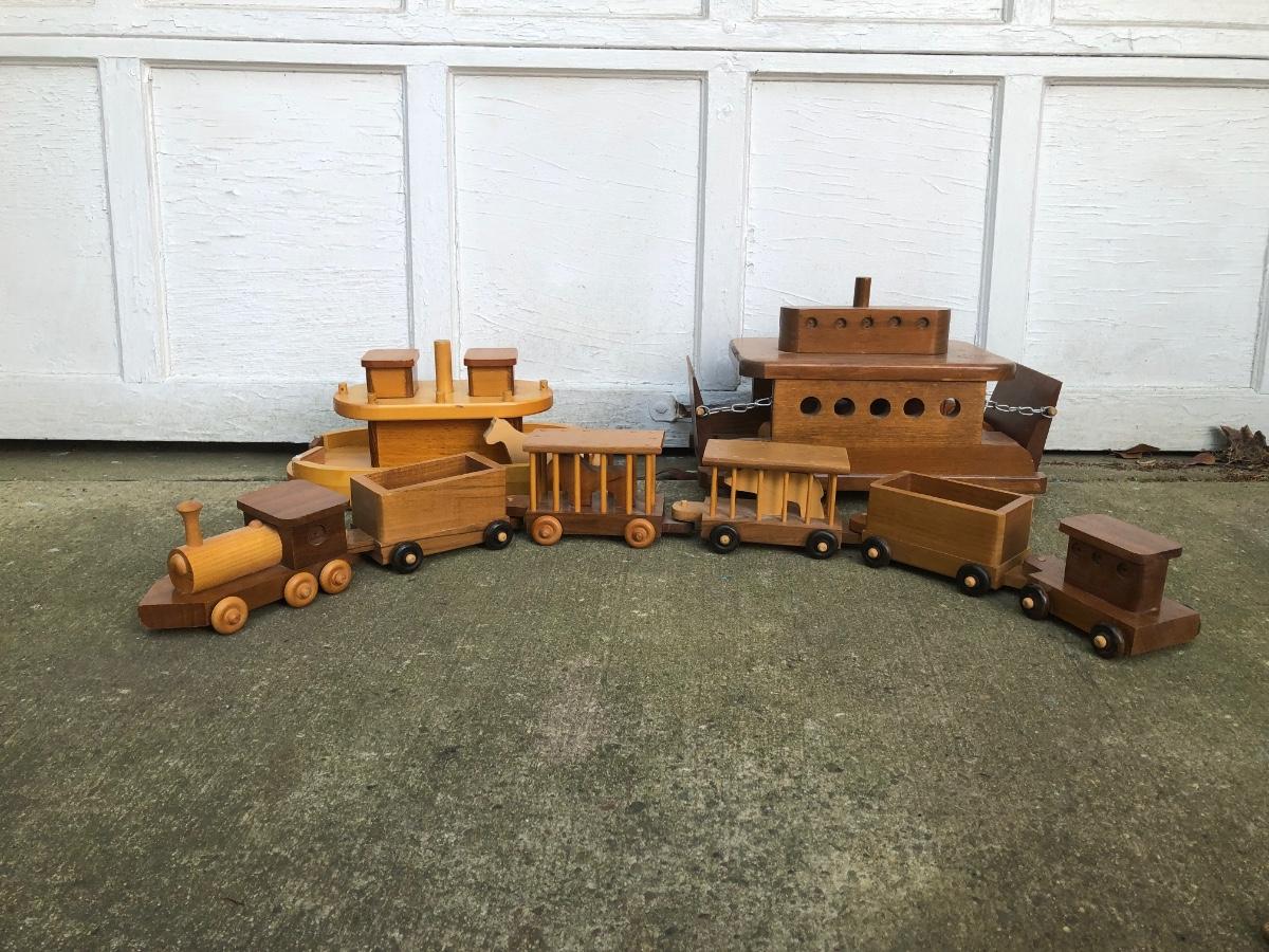 LOT 303M: Wooden Toy Collection - Ship, Car Barge & Train Set