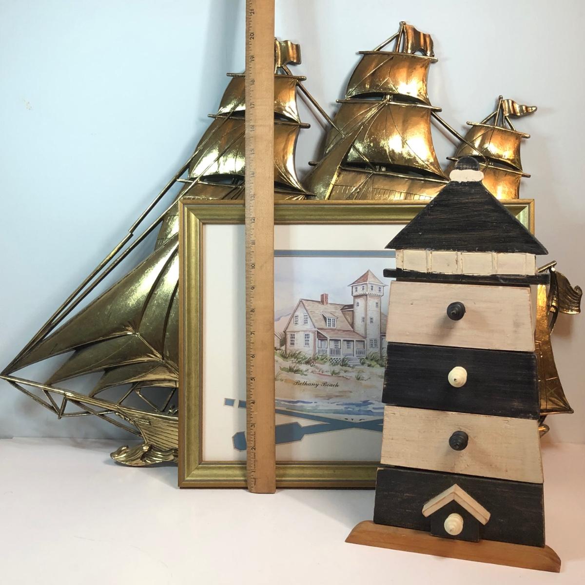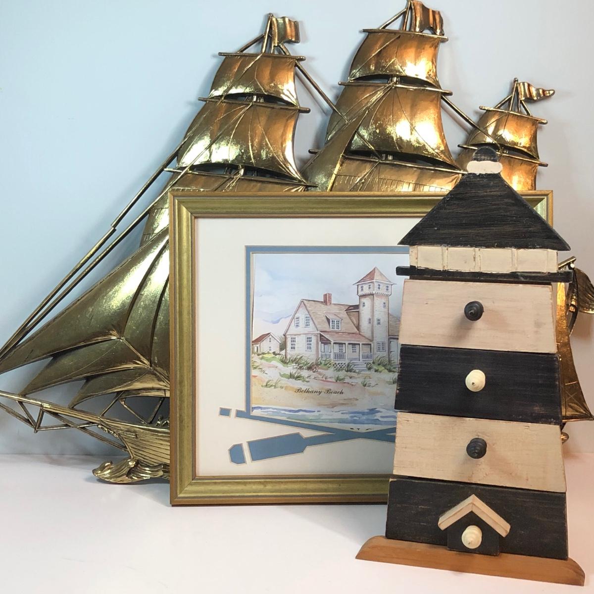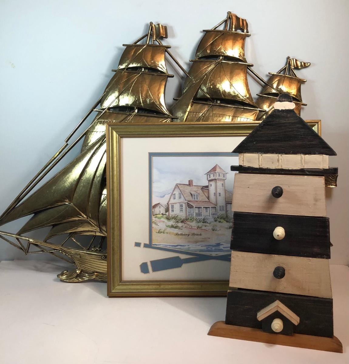 LOT 312M: Donna Elias "Heroes of the American Coast" Print, Ship Wall Hanging & Lighthouse Box w/ Drawers