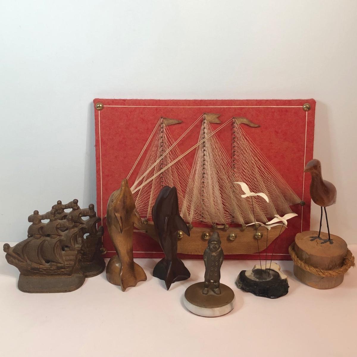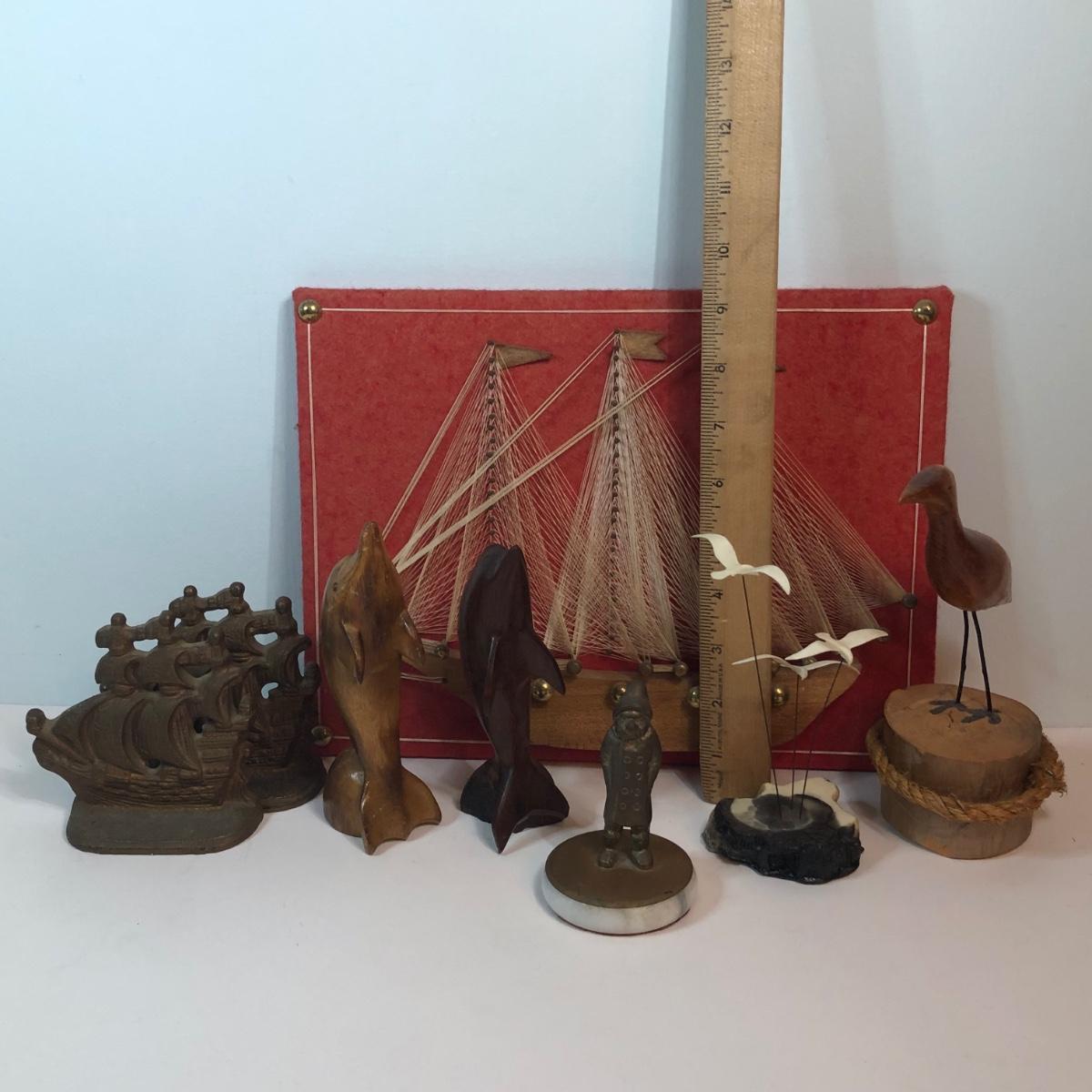 LOT 317M: Vintage Ship String Art, Wooden Dolphins, Bird Statues & Metal Ship Bookends