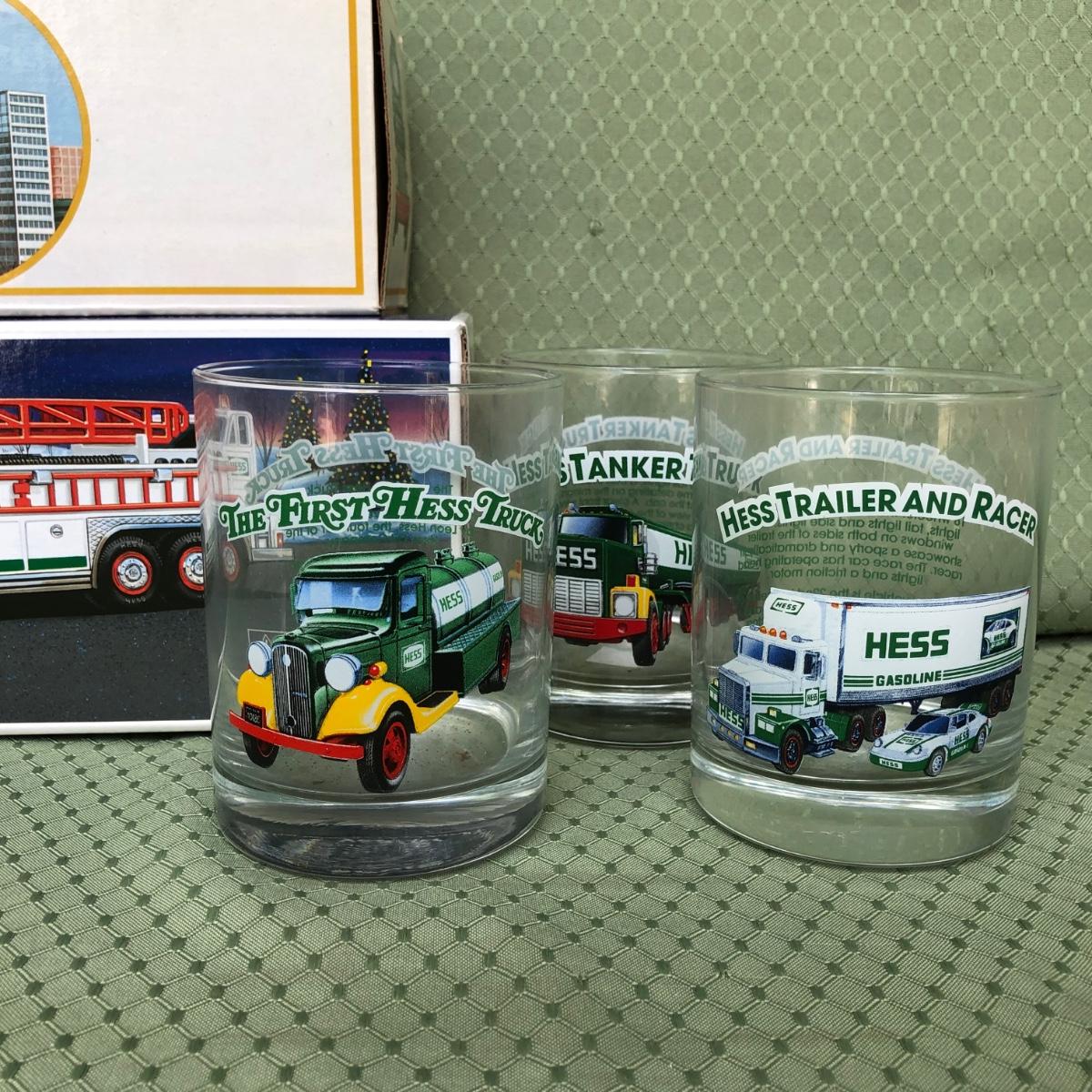 Glasses commemorate the First Hess Truck, the Hess Tanker Truck, and the Hess Trailer & Racers.