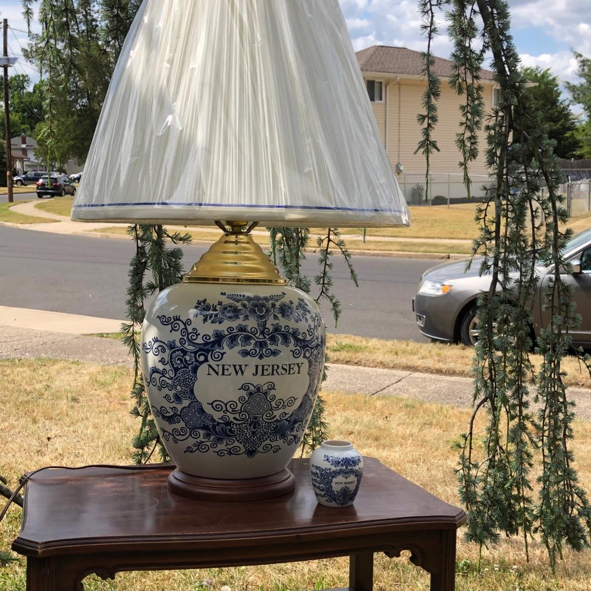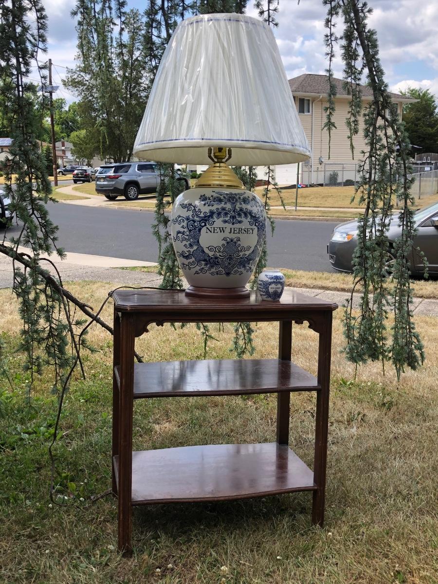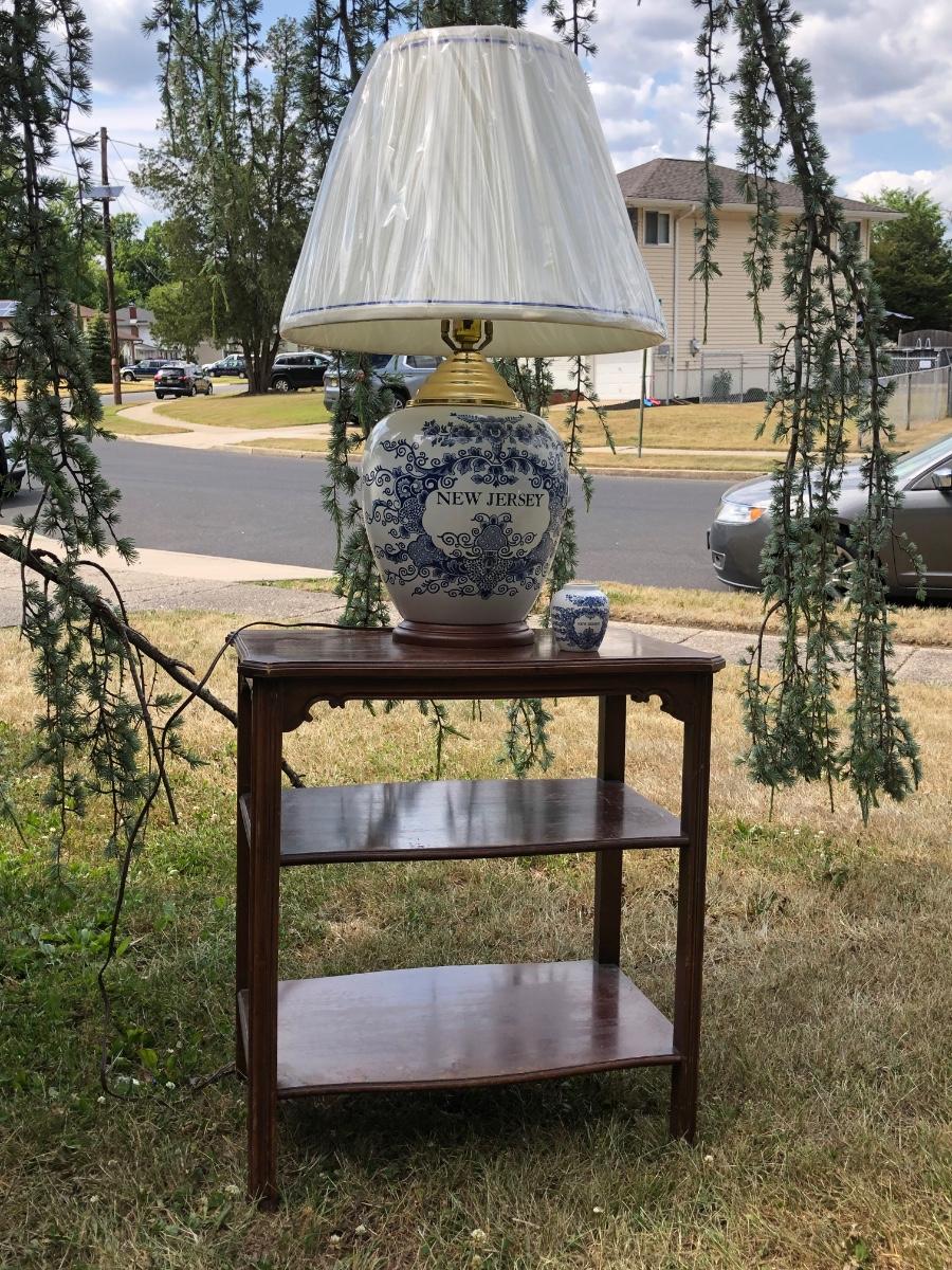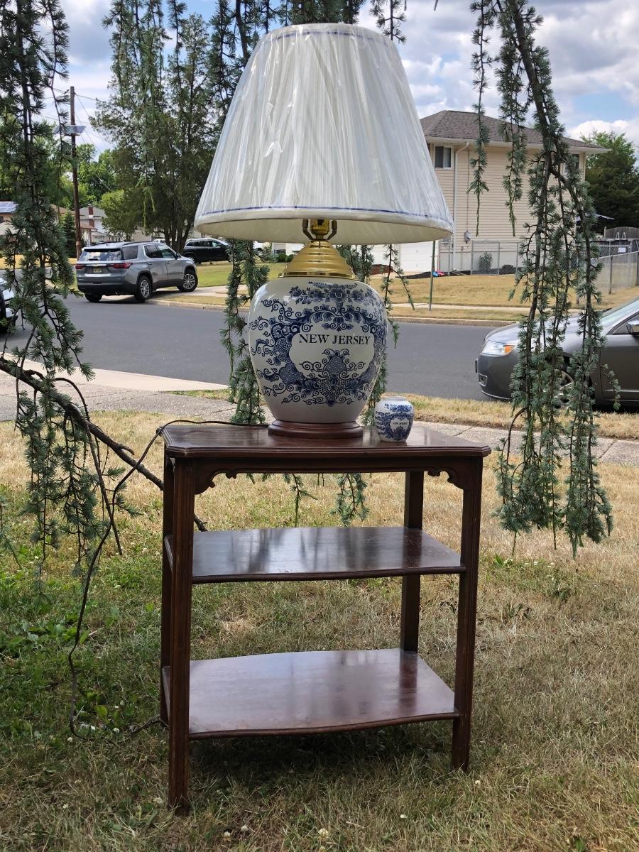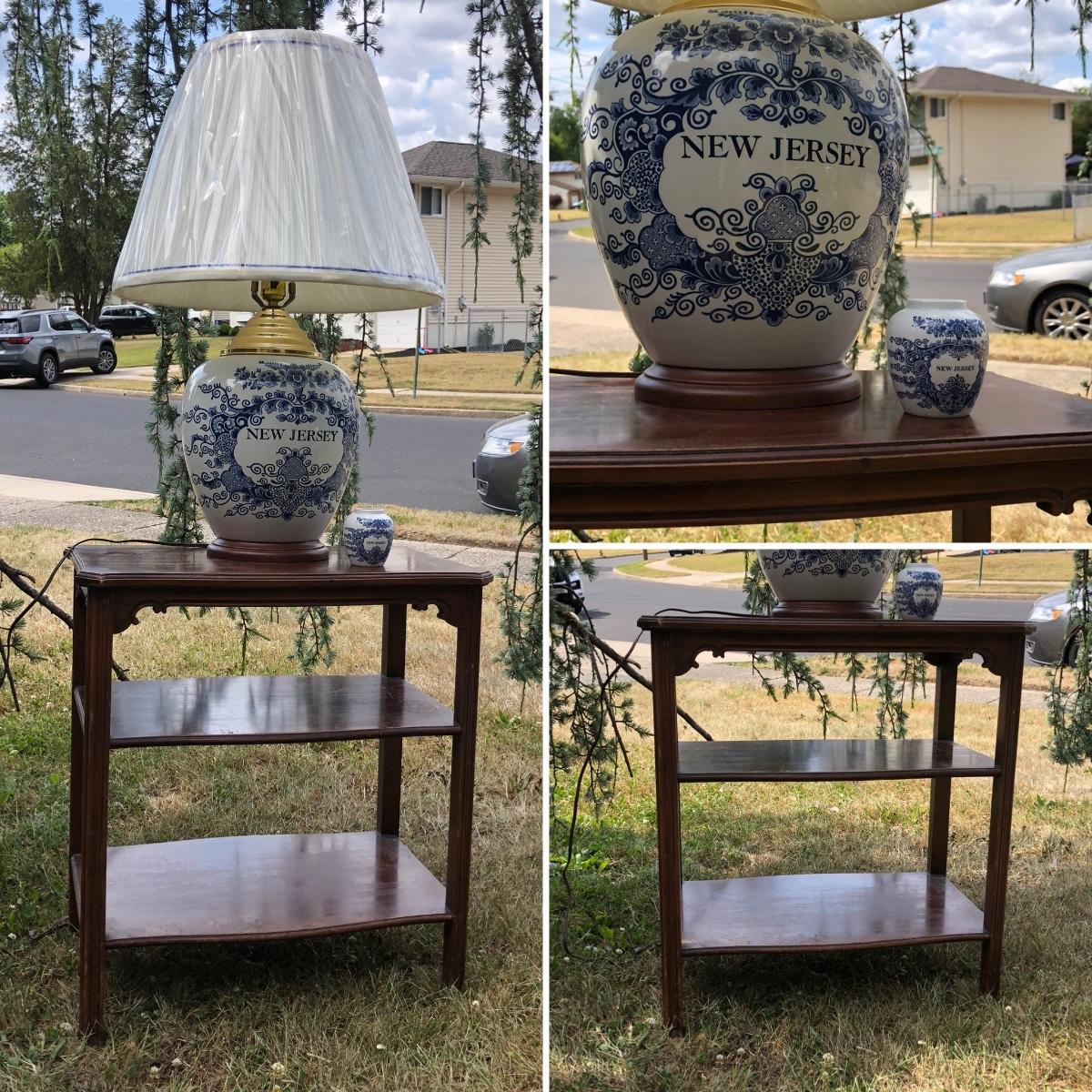 LOT 333M: Blue & White New Jersey Lamp w/ Delft New Jersey Mini Jar & Wooden Accent Table