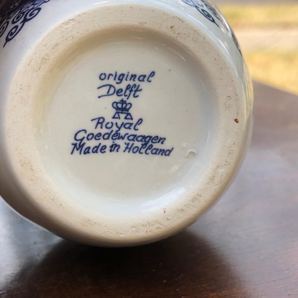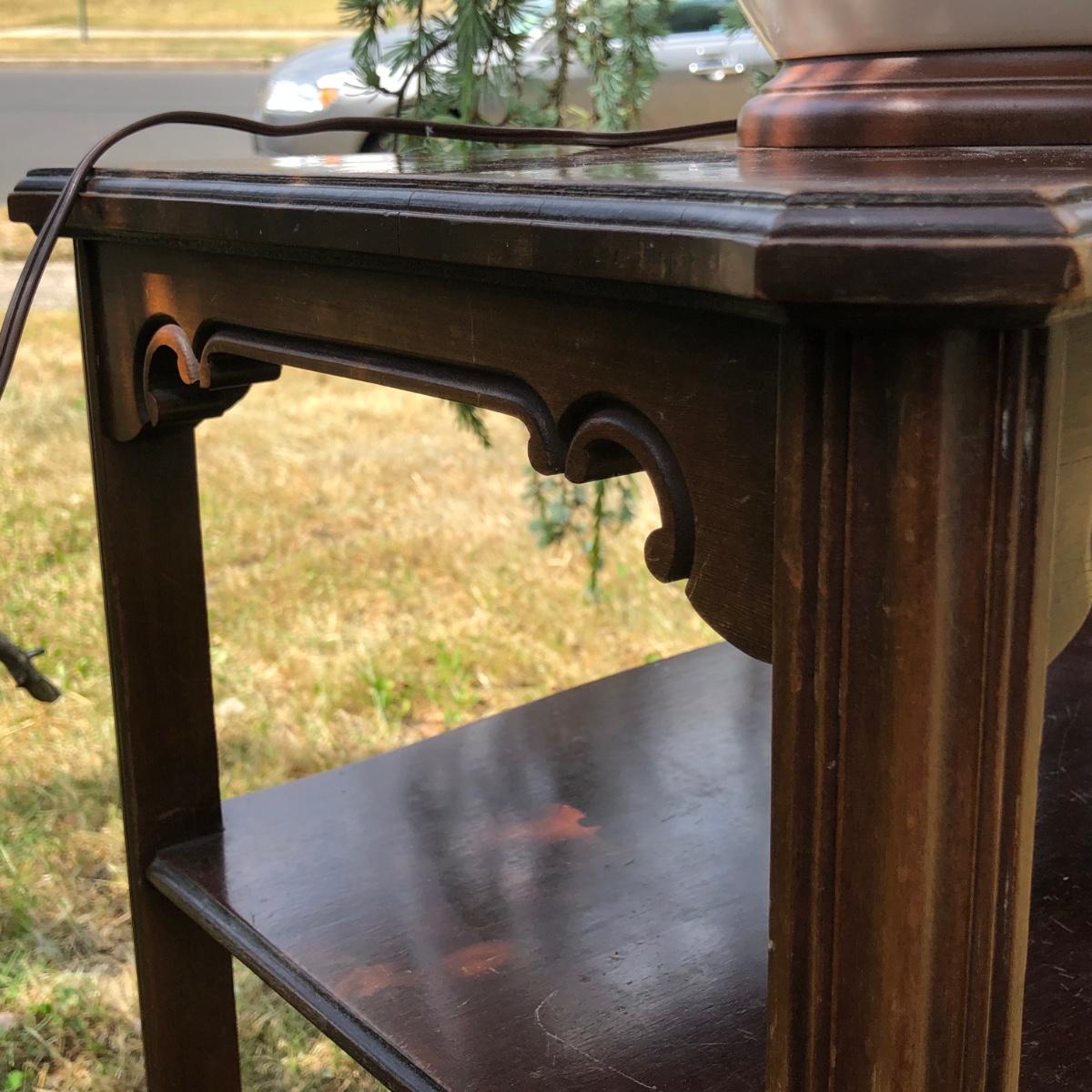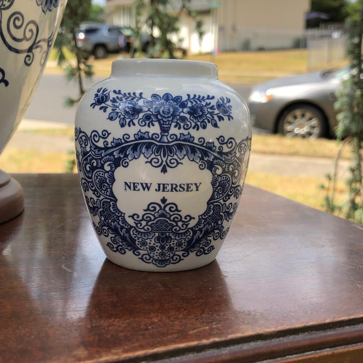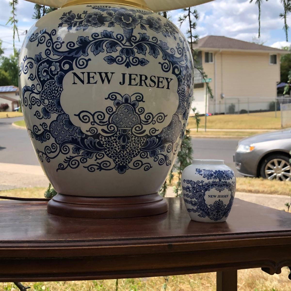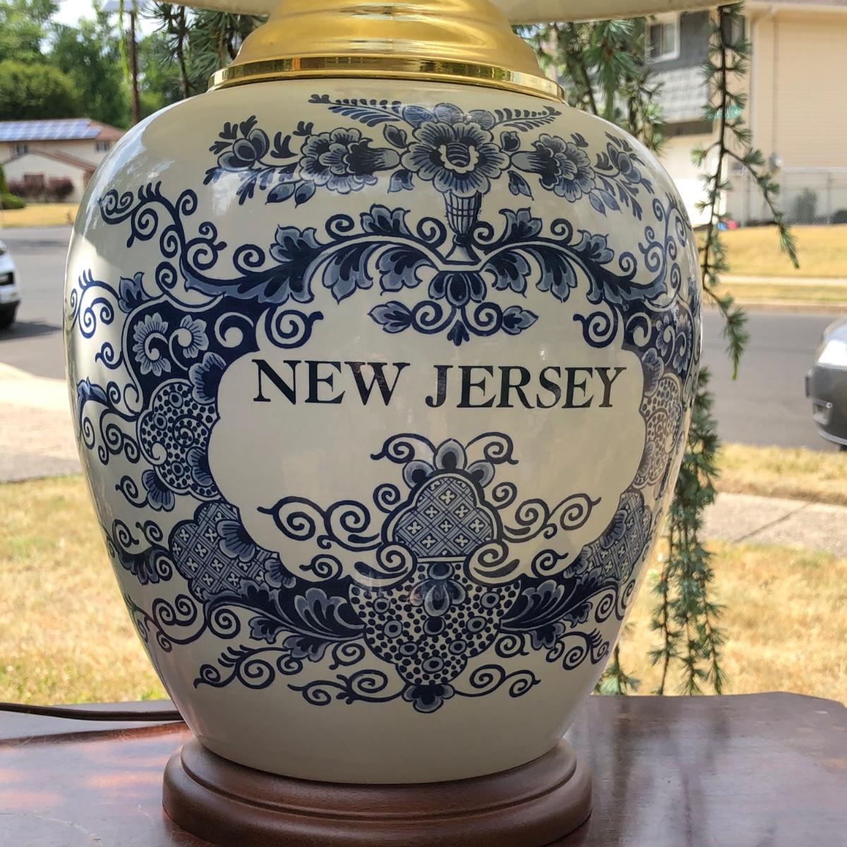 LOT 333M: Blue & White New Jersey Lamp w/ Delft New Jersey Mini Jar & Wooden Accent Table