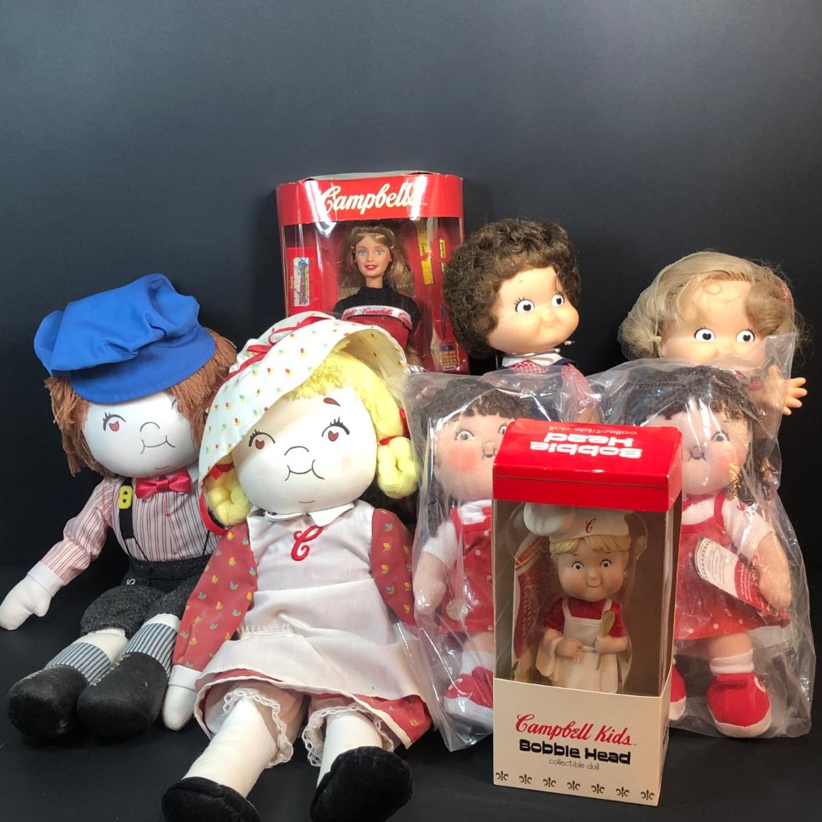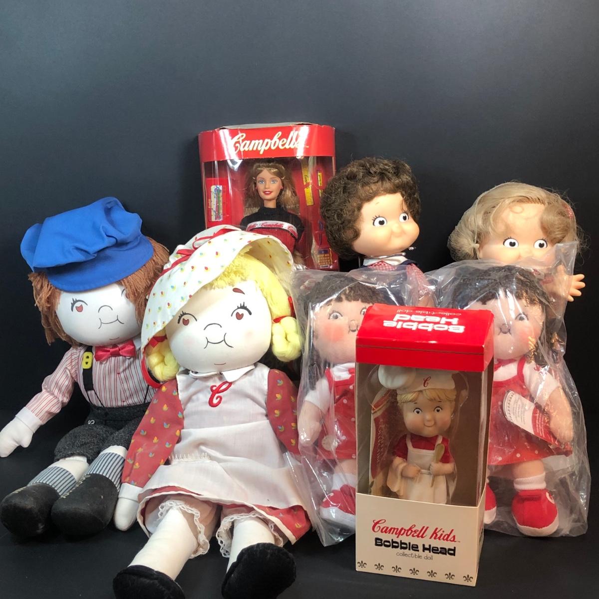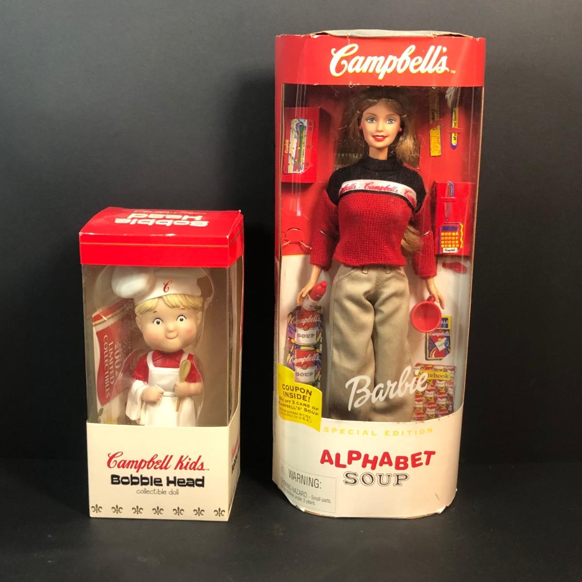 LOT 335M: Campell's Soup Toy Collection - Cloth Dolls, Barbie in Package, Bobblehead