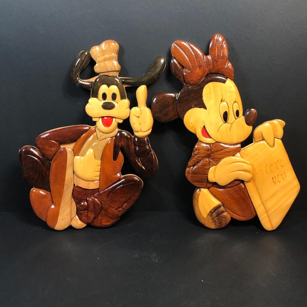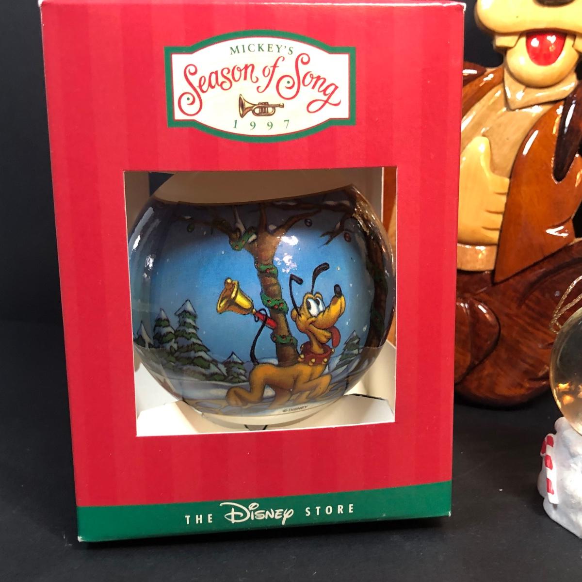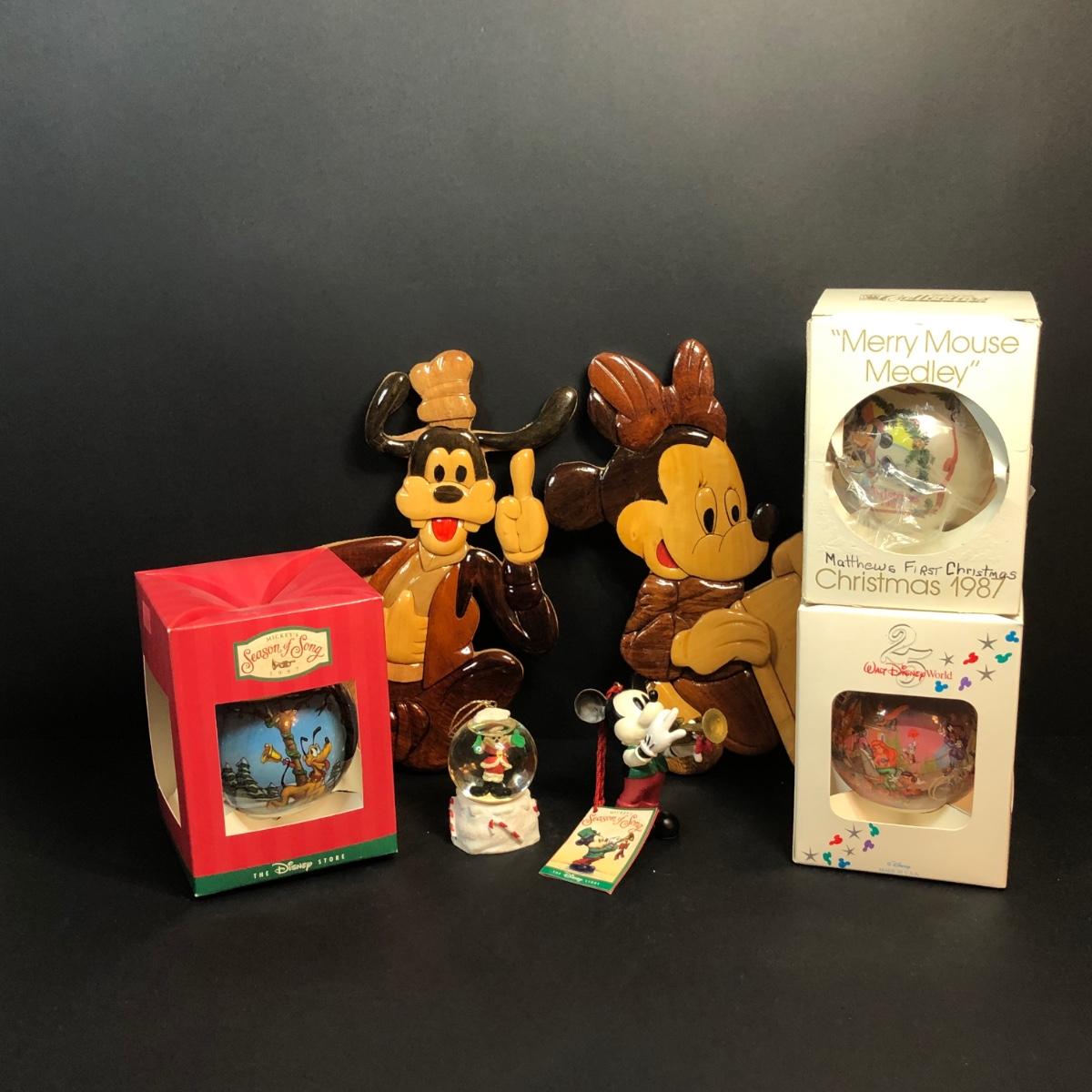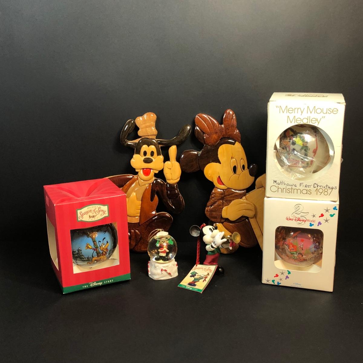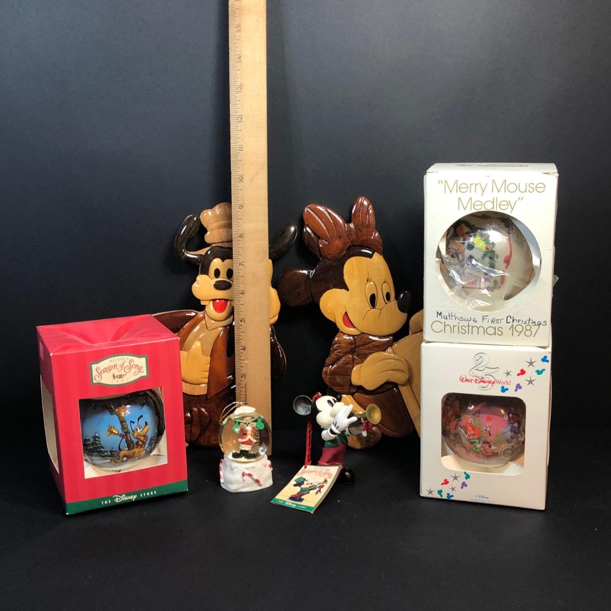 LOT 339M: Wooden Goofy & Minnie Wall Hangings, Mickey w/ Horn Ornament & Disney Christmas Bulbs