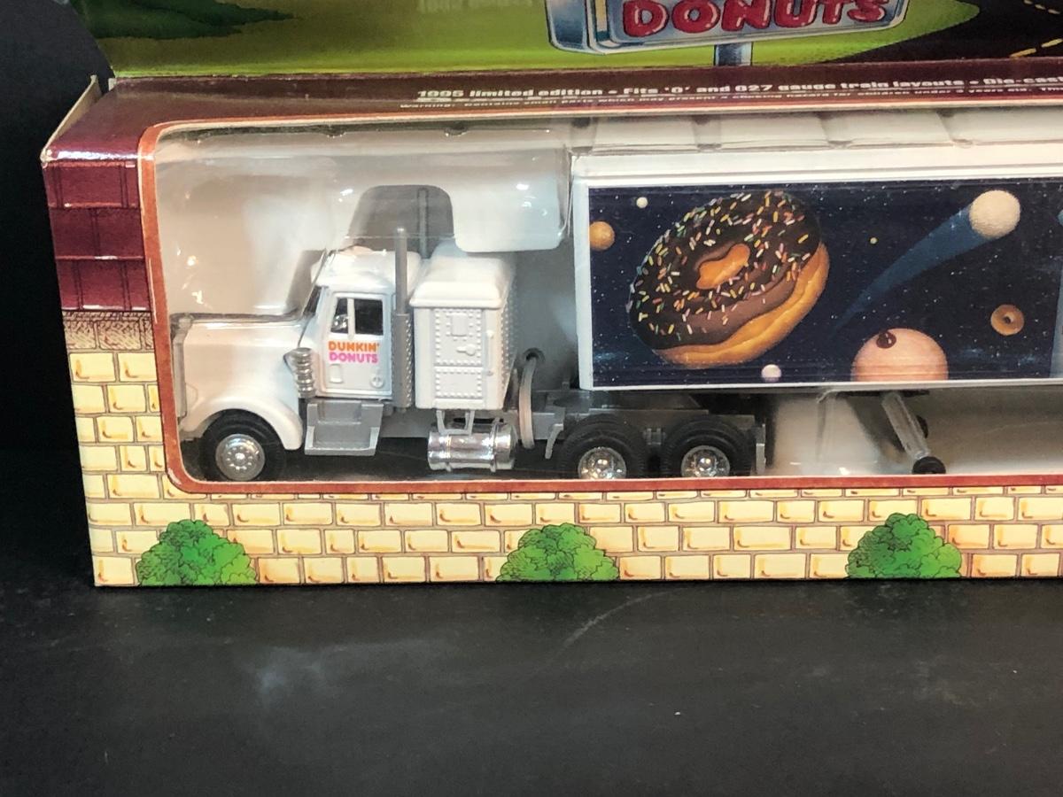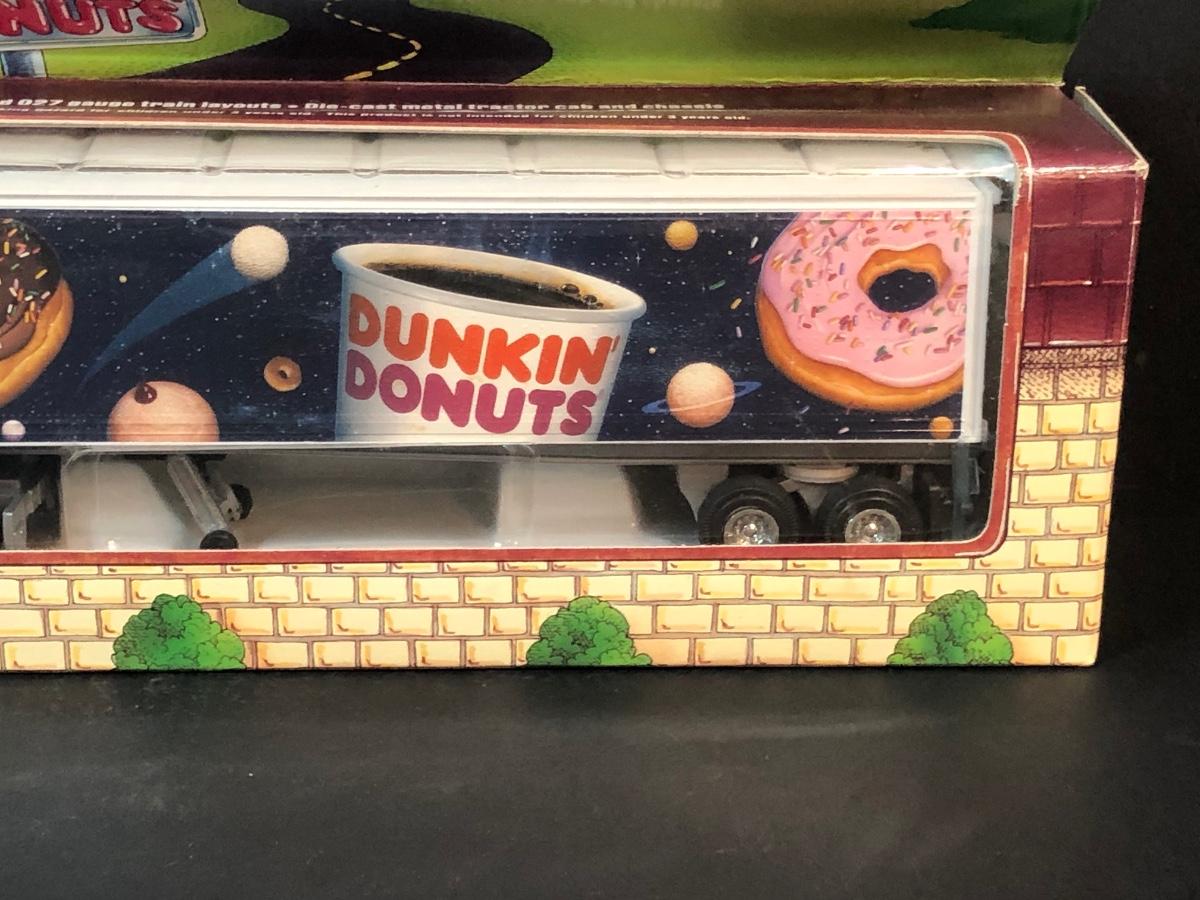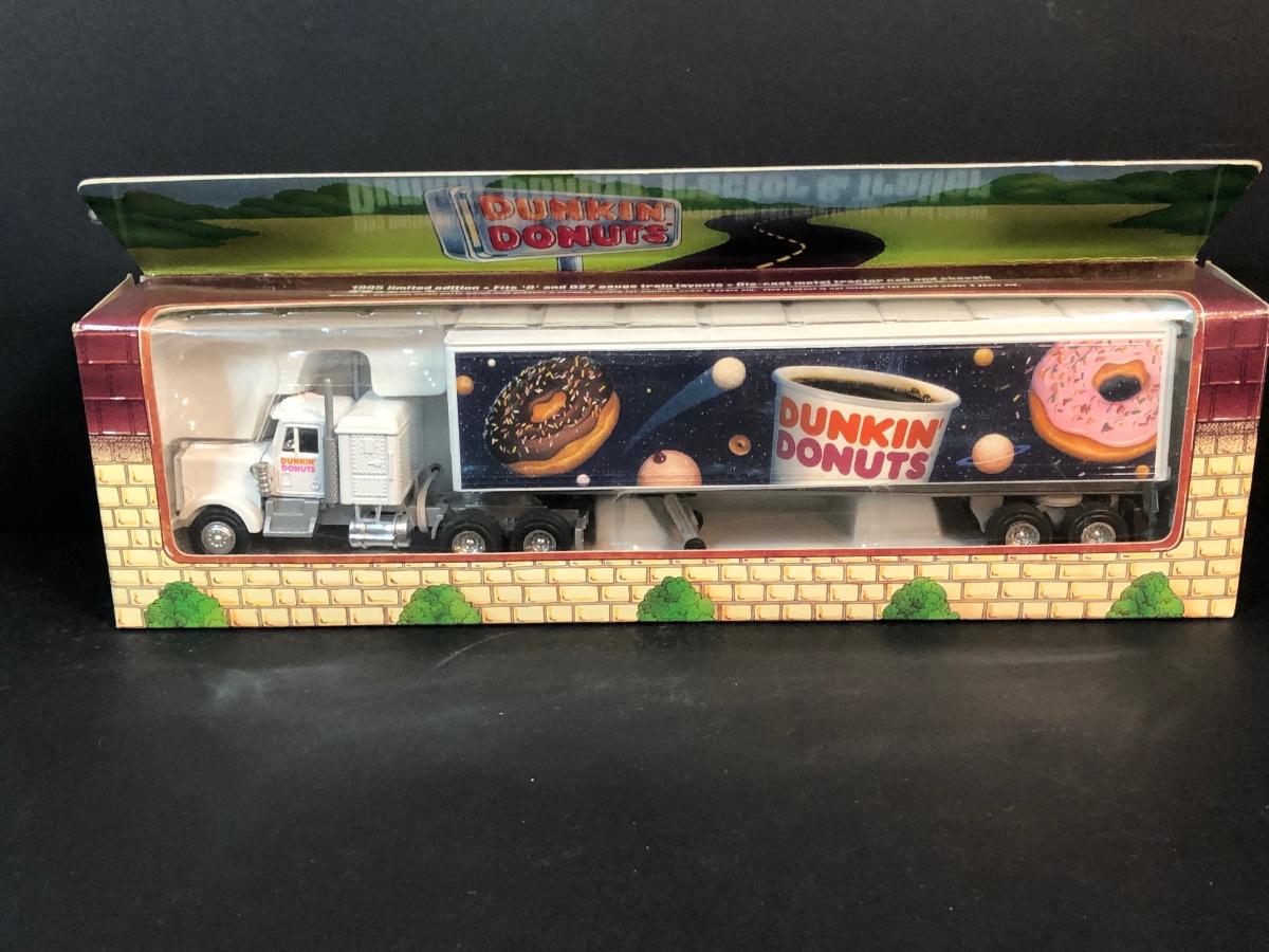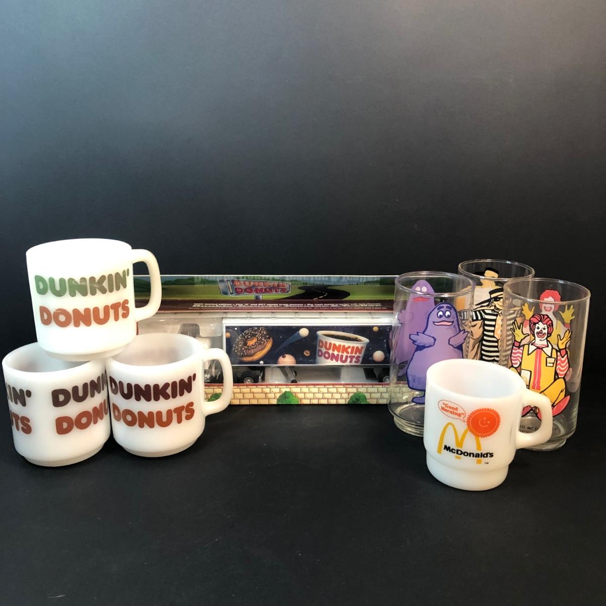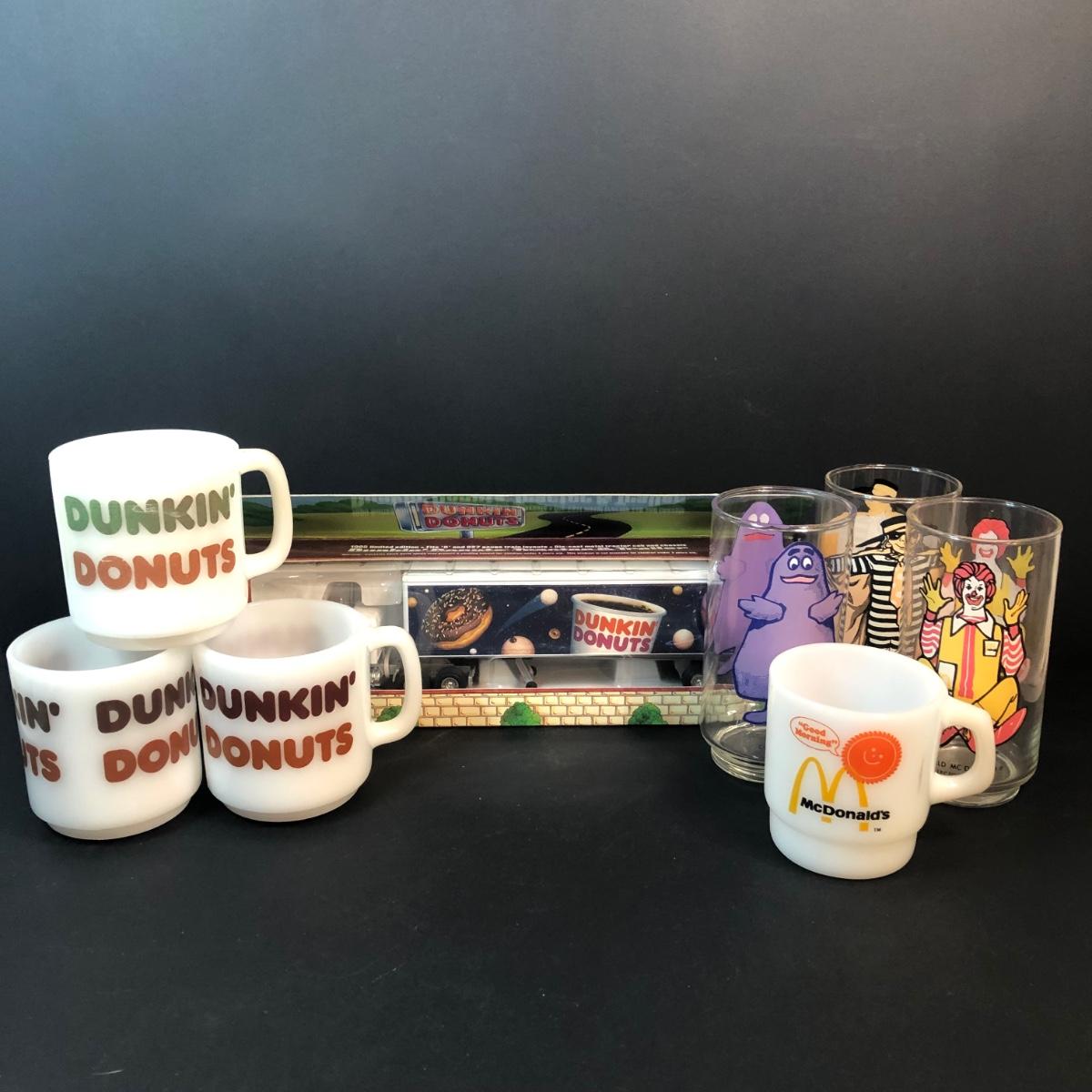 LOT 347M: 1995 Die-Cast Dunkin' Donuts Tractor & Trailer, 3 Glassbake Dunkin Donuts Mugs, Fireking McDonald's Mug, & Ronald McDonald Collection Character Glasses
