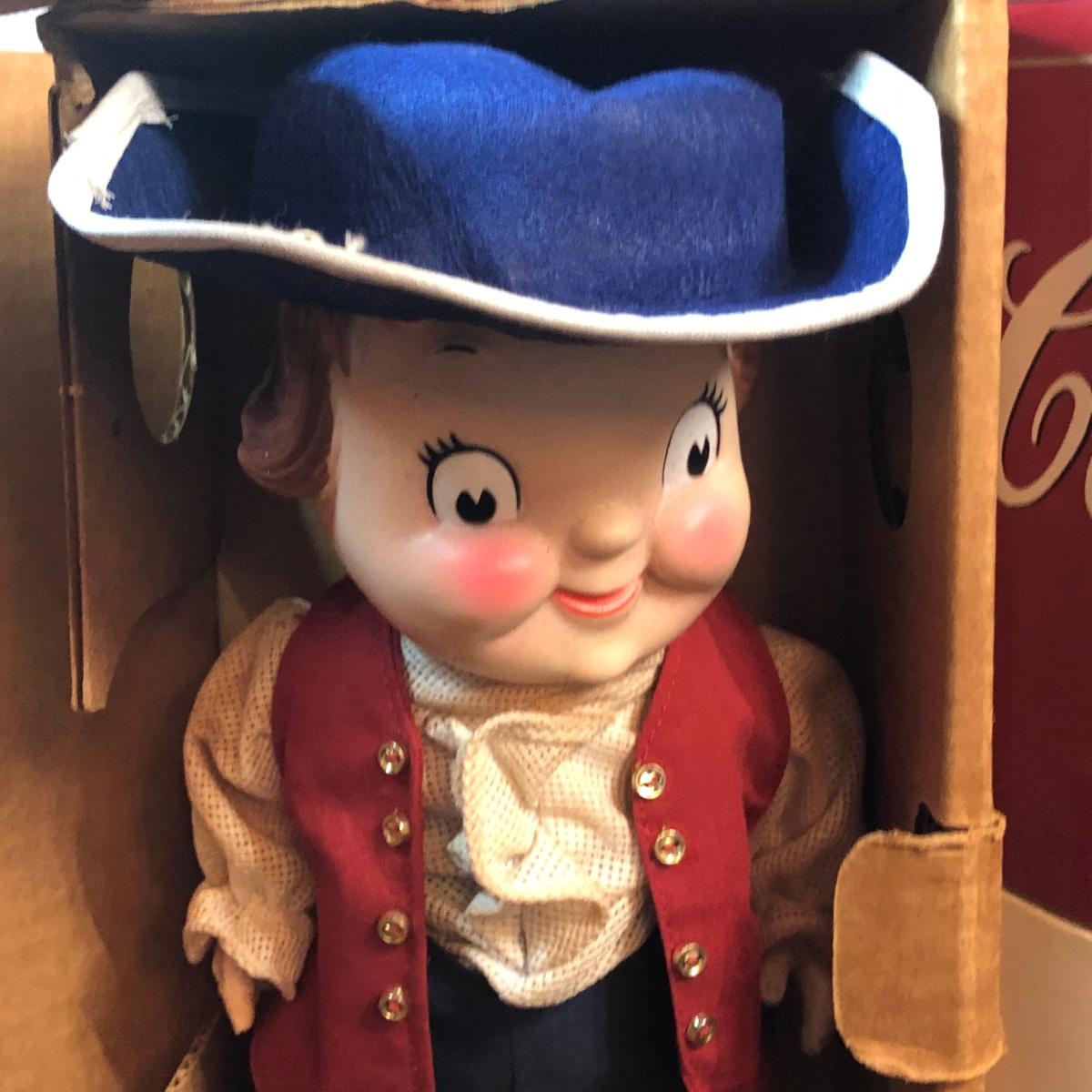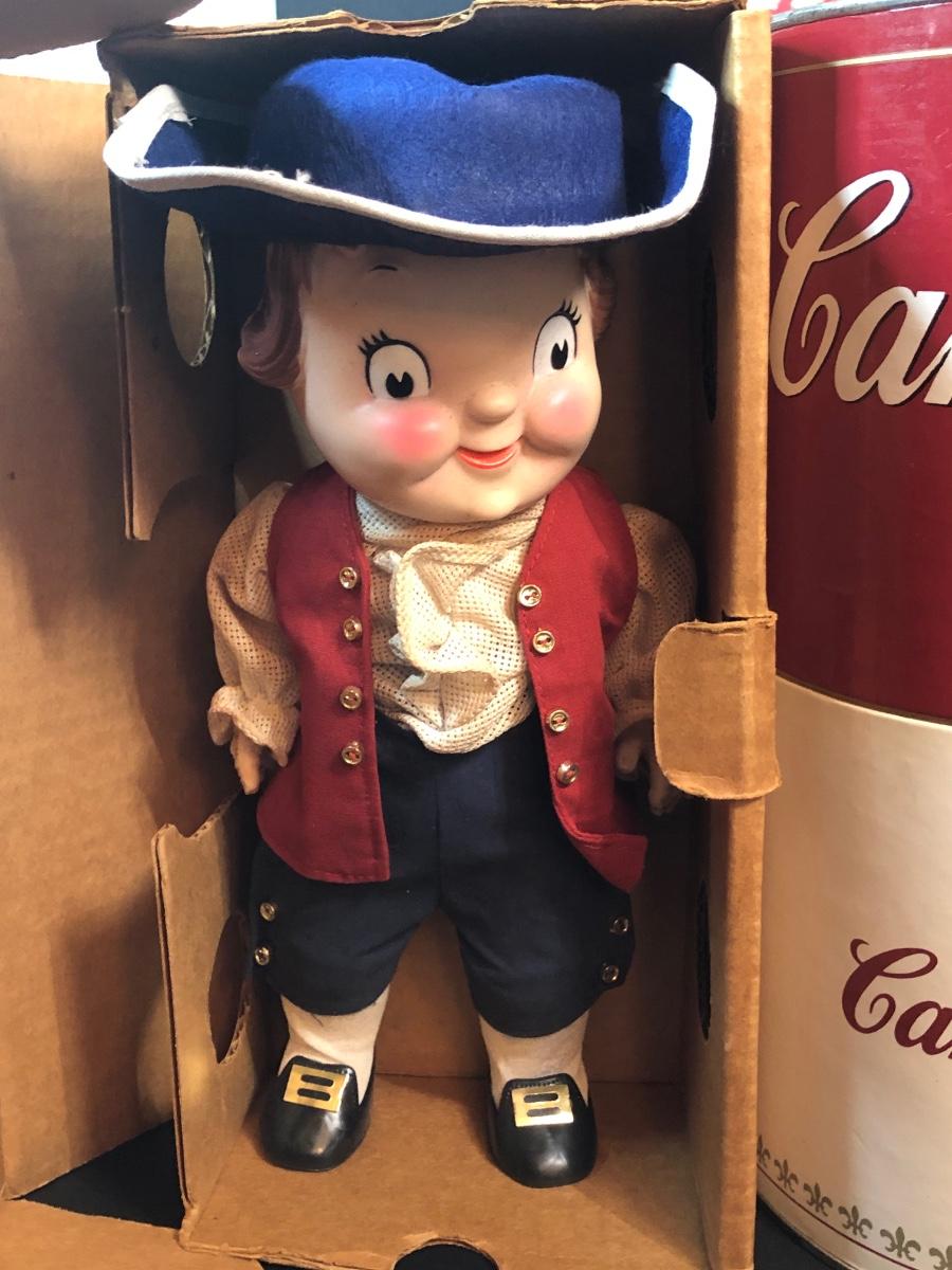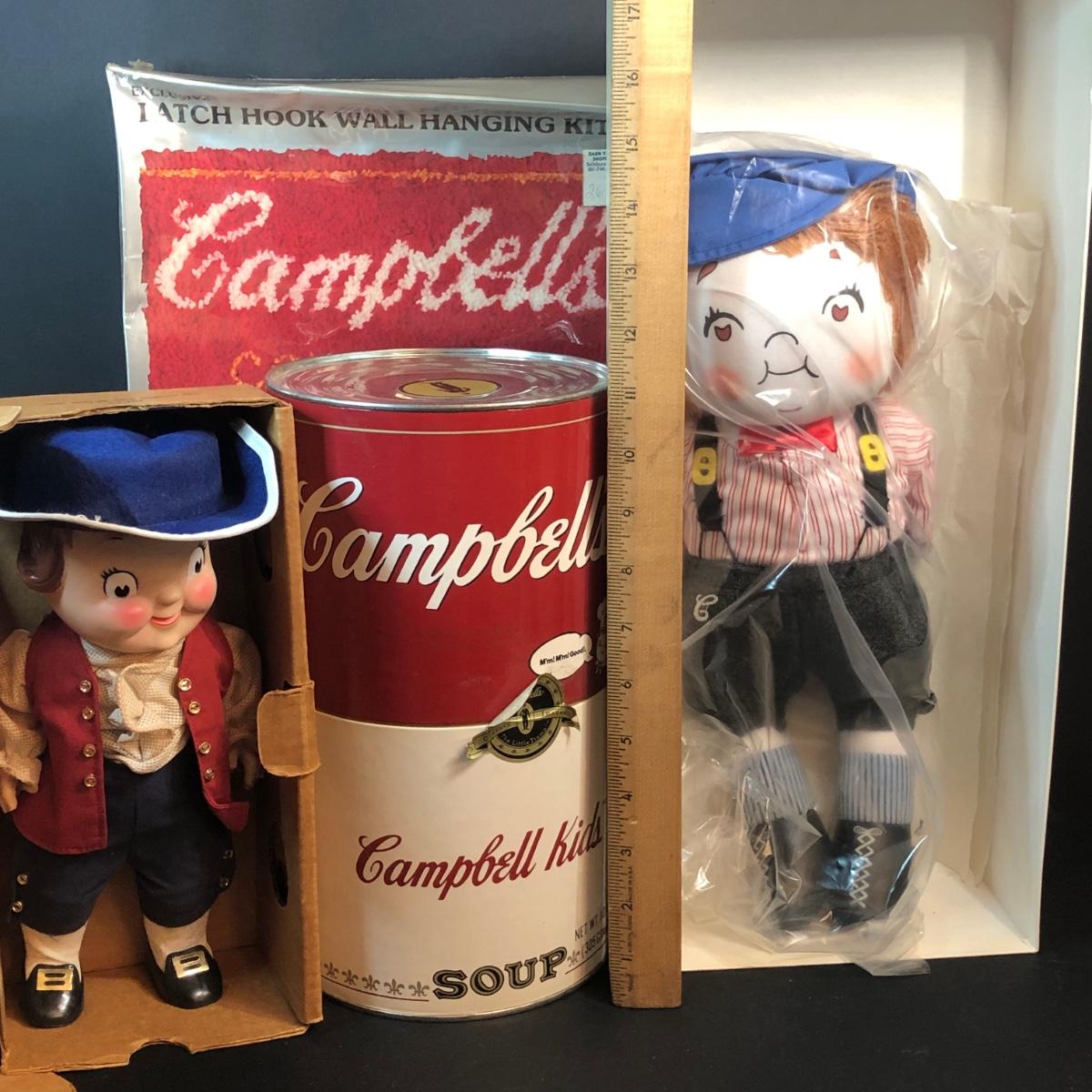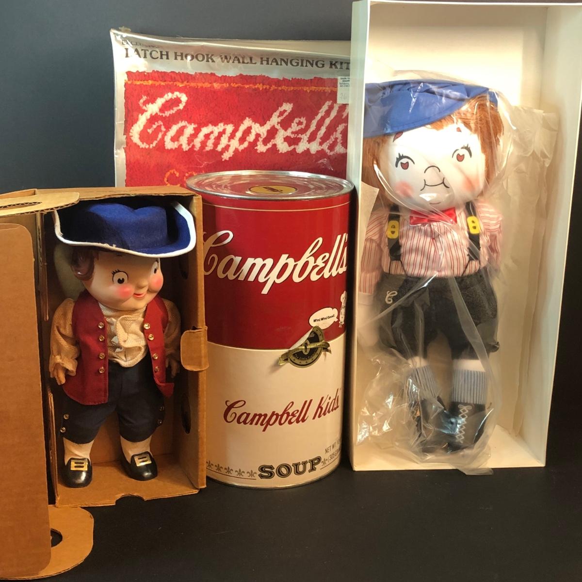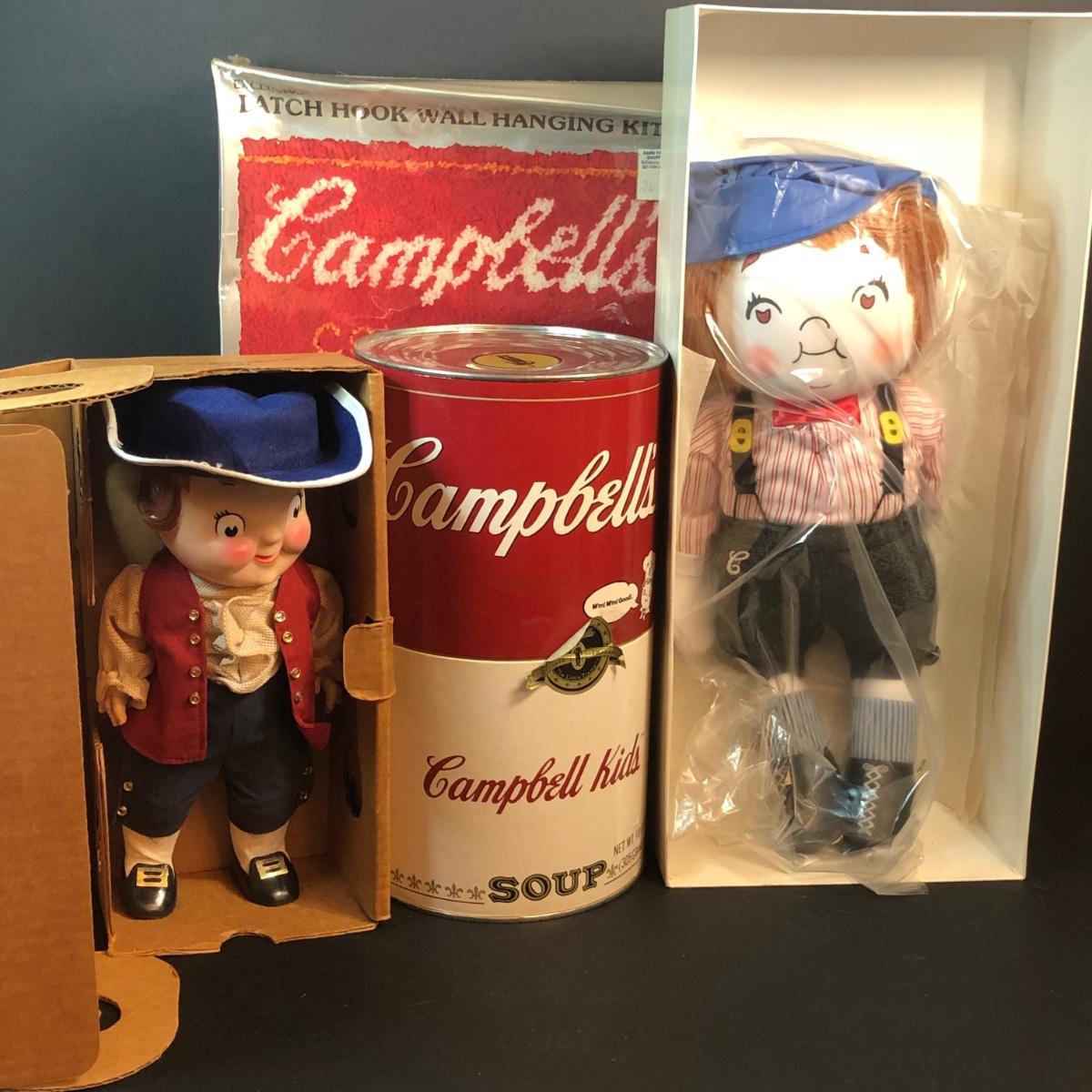 LOT 350M: Campbell's Soup - Charlie Chaplin Porcelain Doll, Colonial Boy Vinyl Doll, Cloth Boy Doll & Latch Hook Kit