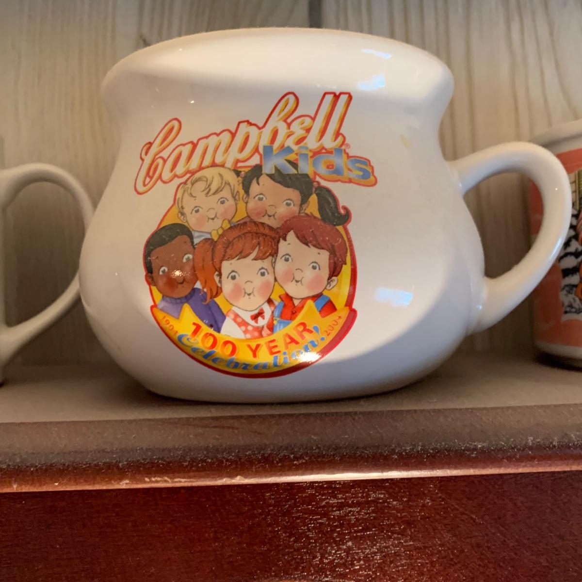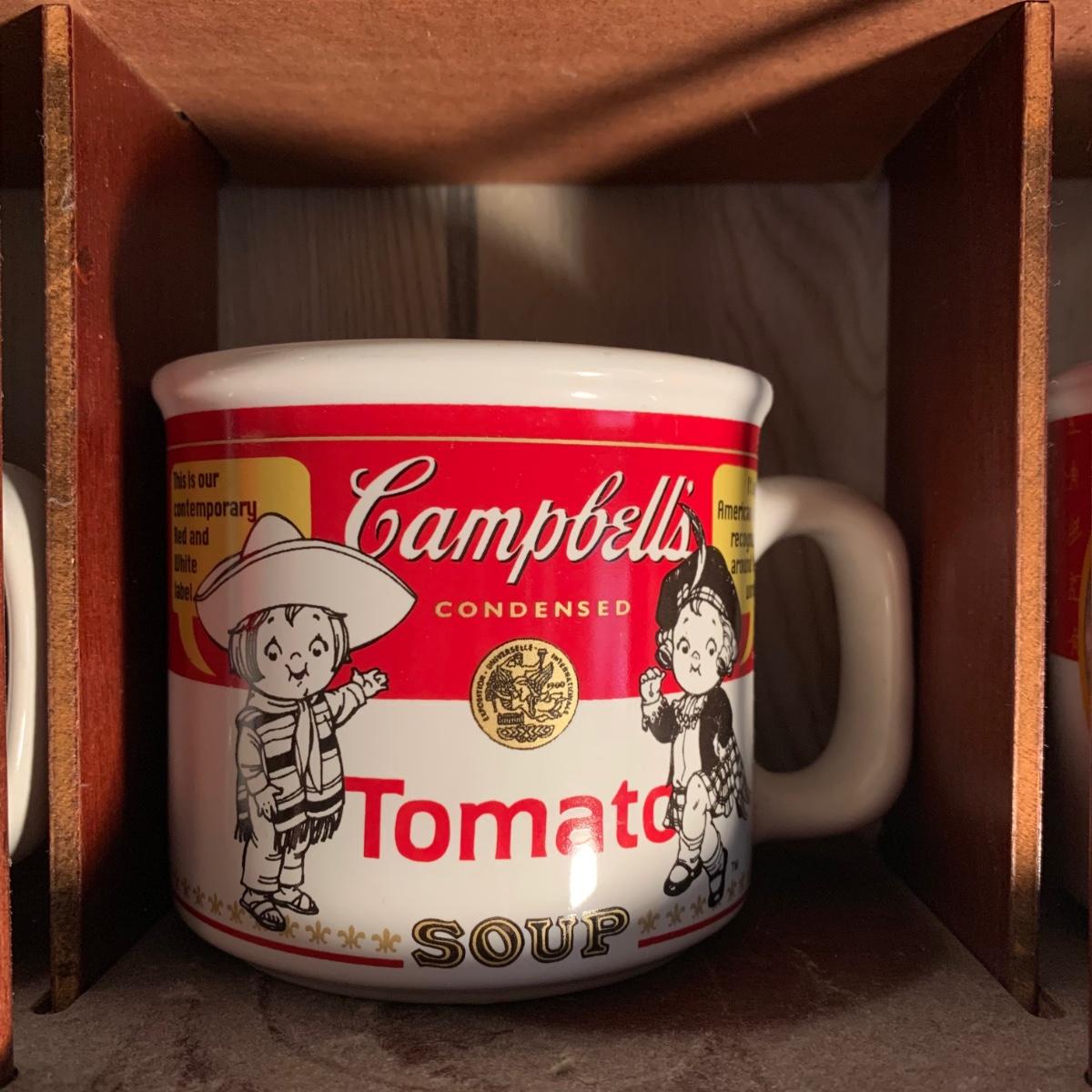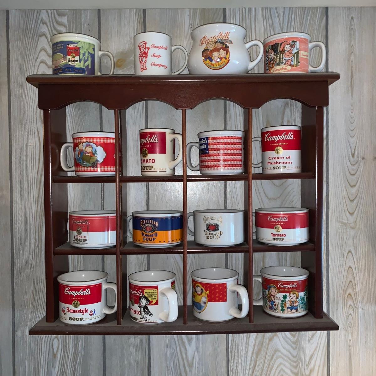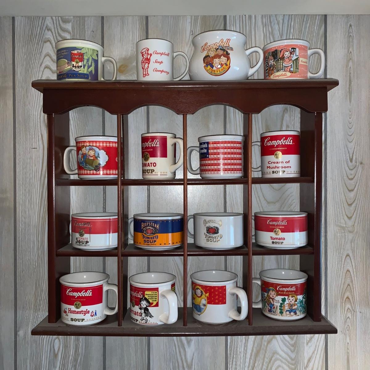LOT 362R: Campbell's Soup Mugs, Mugs & Wooden Display Shelf