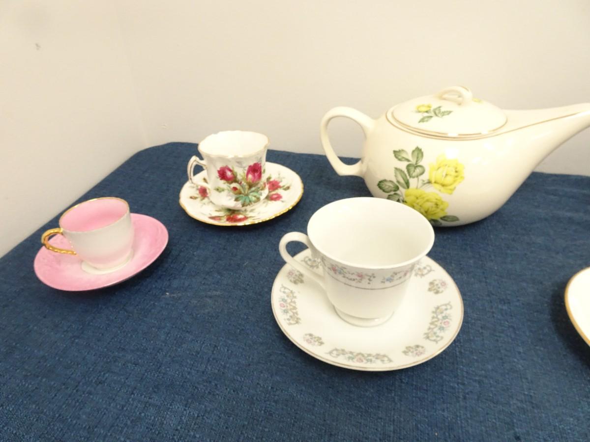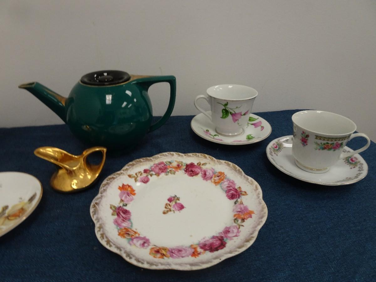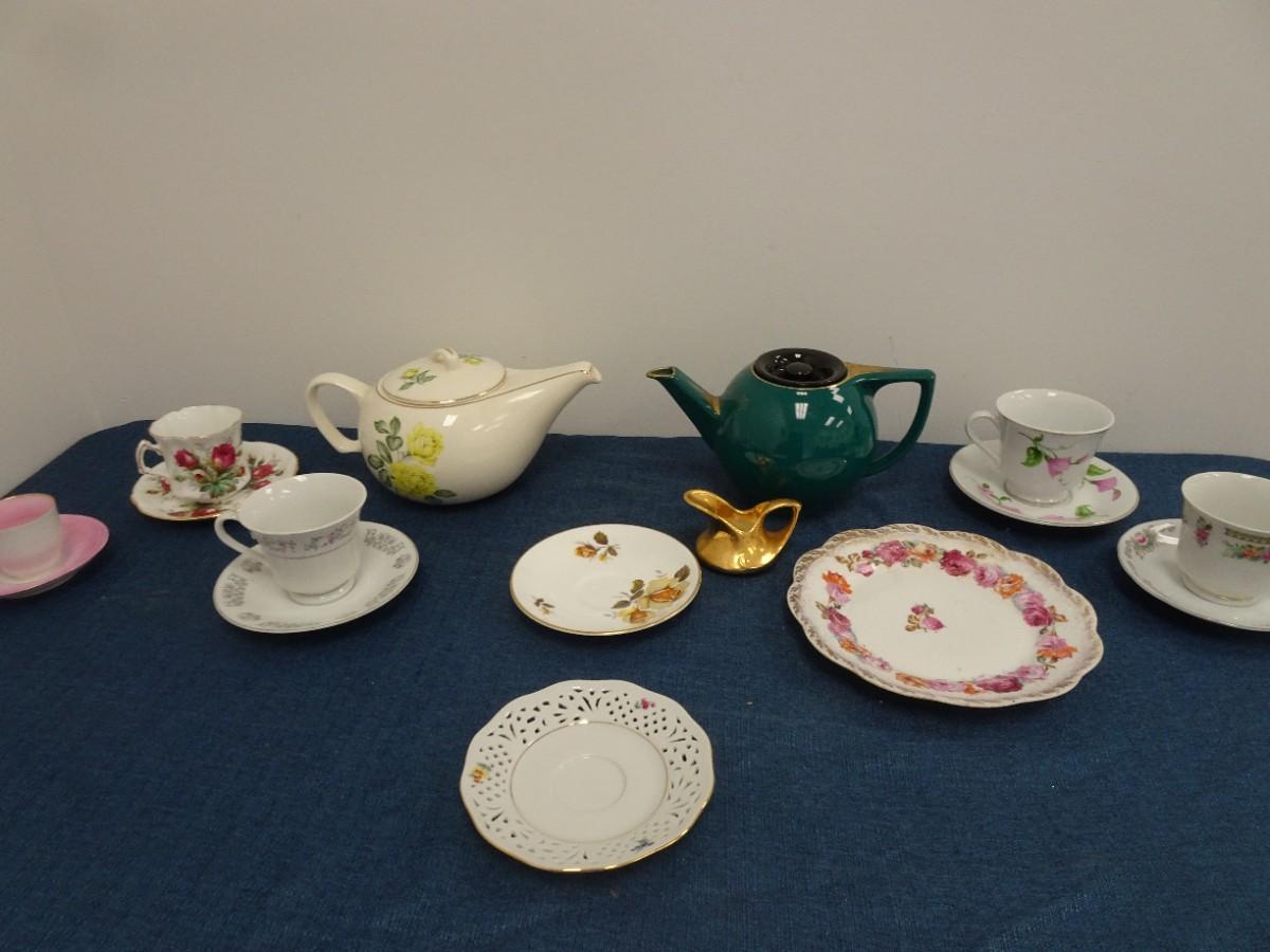 LOT 879. COLLECTION OF TEA POTS, CUPS AND PLATES