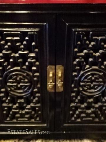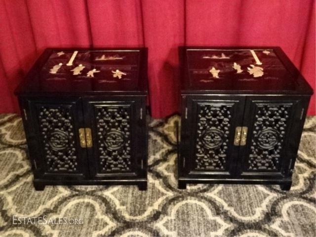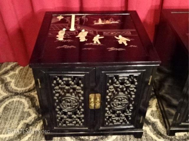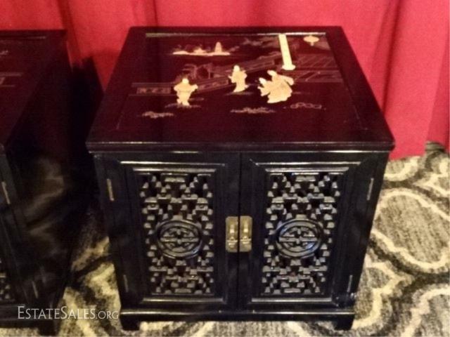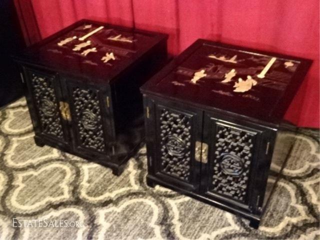 LOT 87B: PAIR CHINESE BLACK LACQUER TABLES, CARVED STONE FIGURES, 2 DOOR CABINETS WITH BRASS PULLS, VERY GOOD CONDITION, 22" X 22" X 22", SKU3369.06