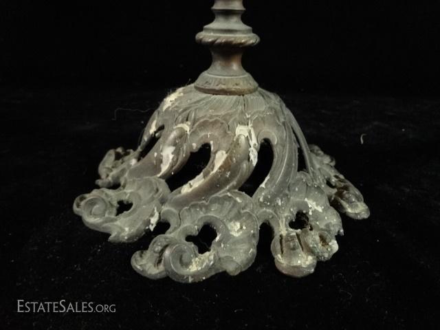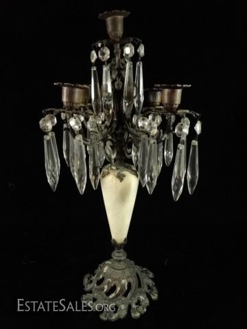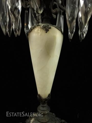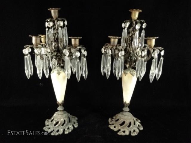 LOT 87D: PAIR 5 LIGHT CANDLEABRAS, MARBLE & BRONZE WITH CRYSTAL DROPS, APPROX 18" X 8", SOME WAX RESIDUE