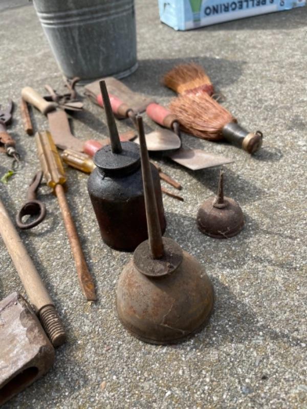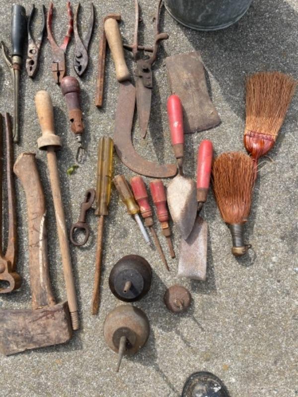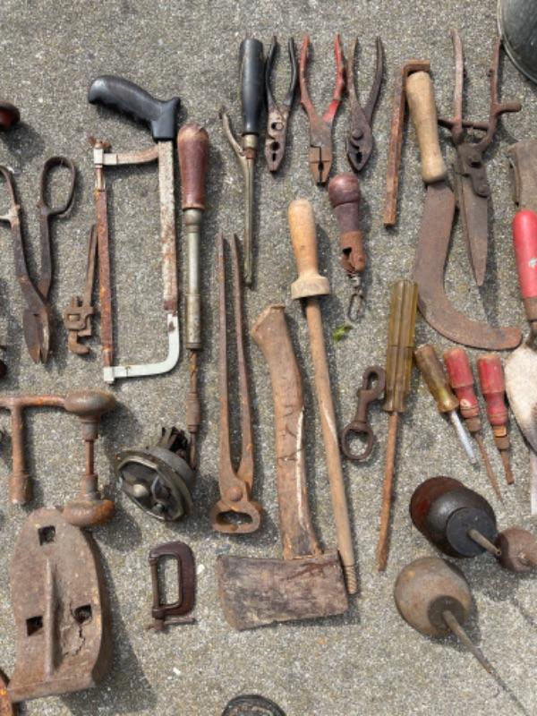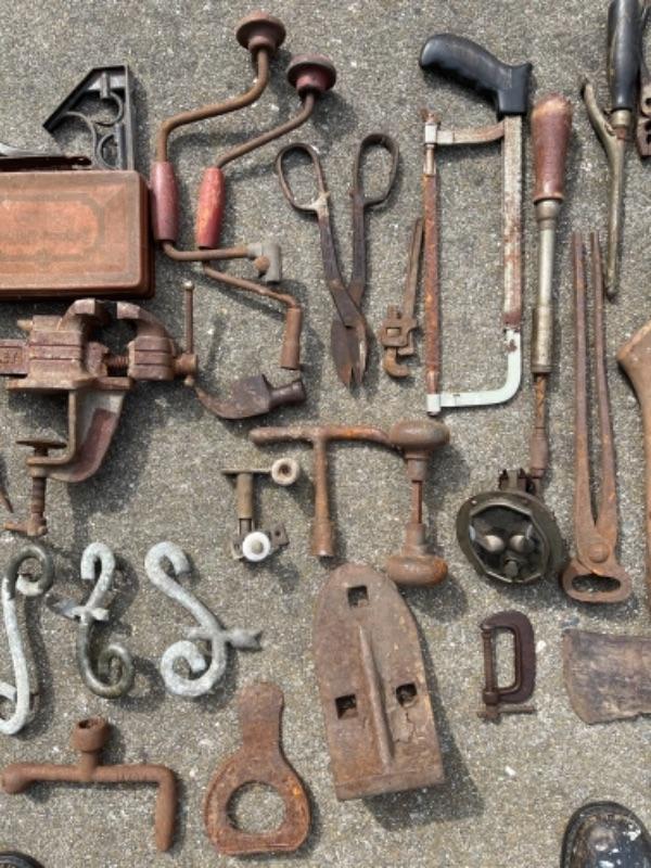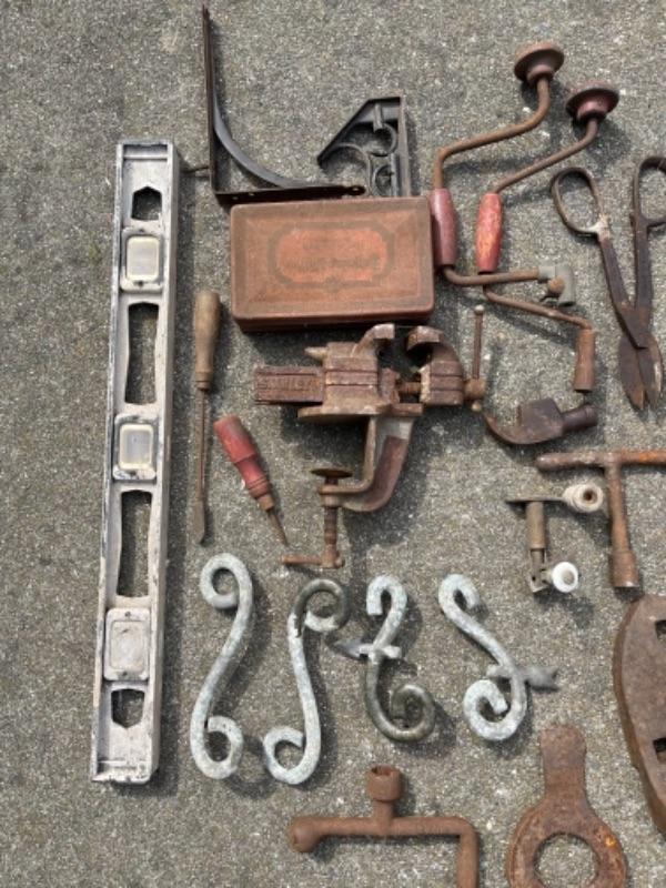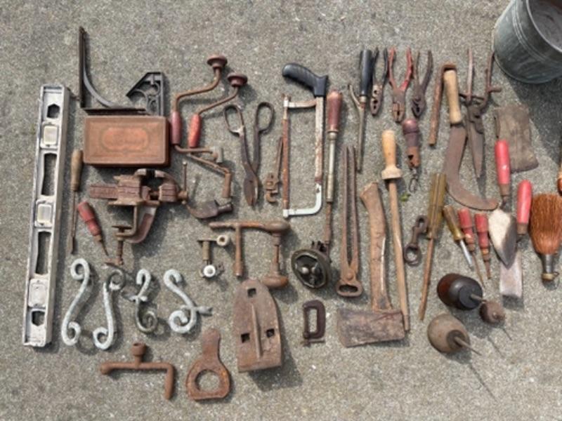 Lot 87K. Vintage tools“”leveler, hand drills, door knobs, pail, brackets, screw drivers, anvils, oil can, etc.--$75