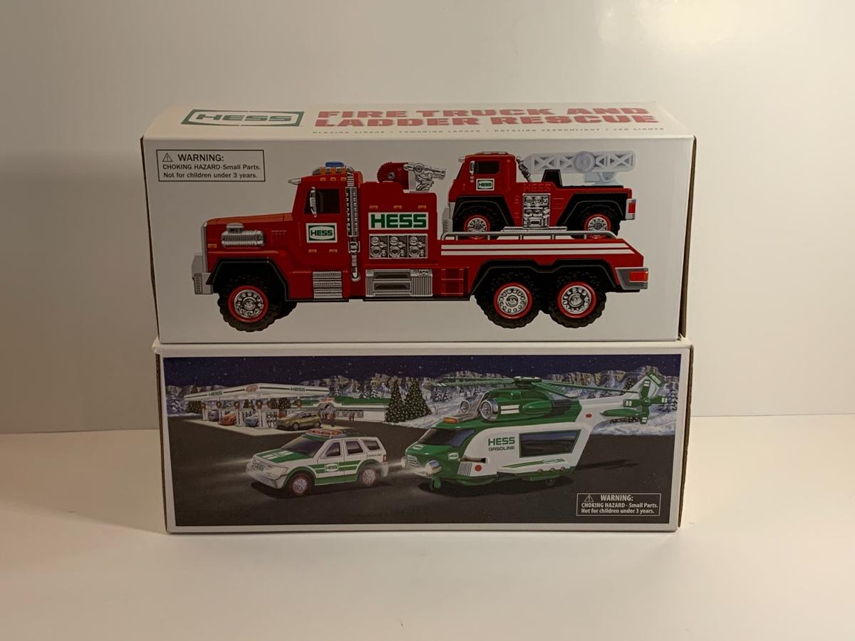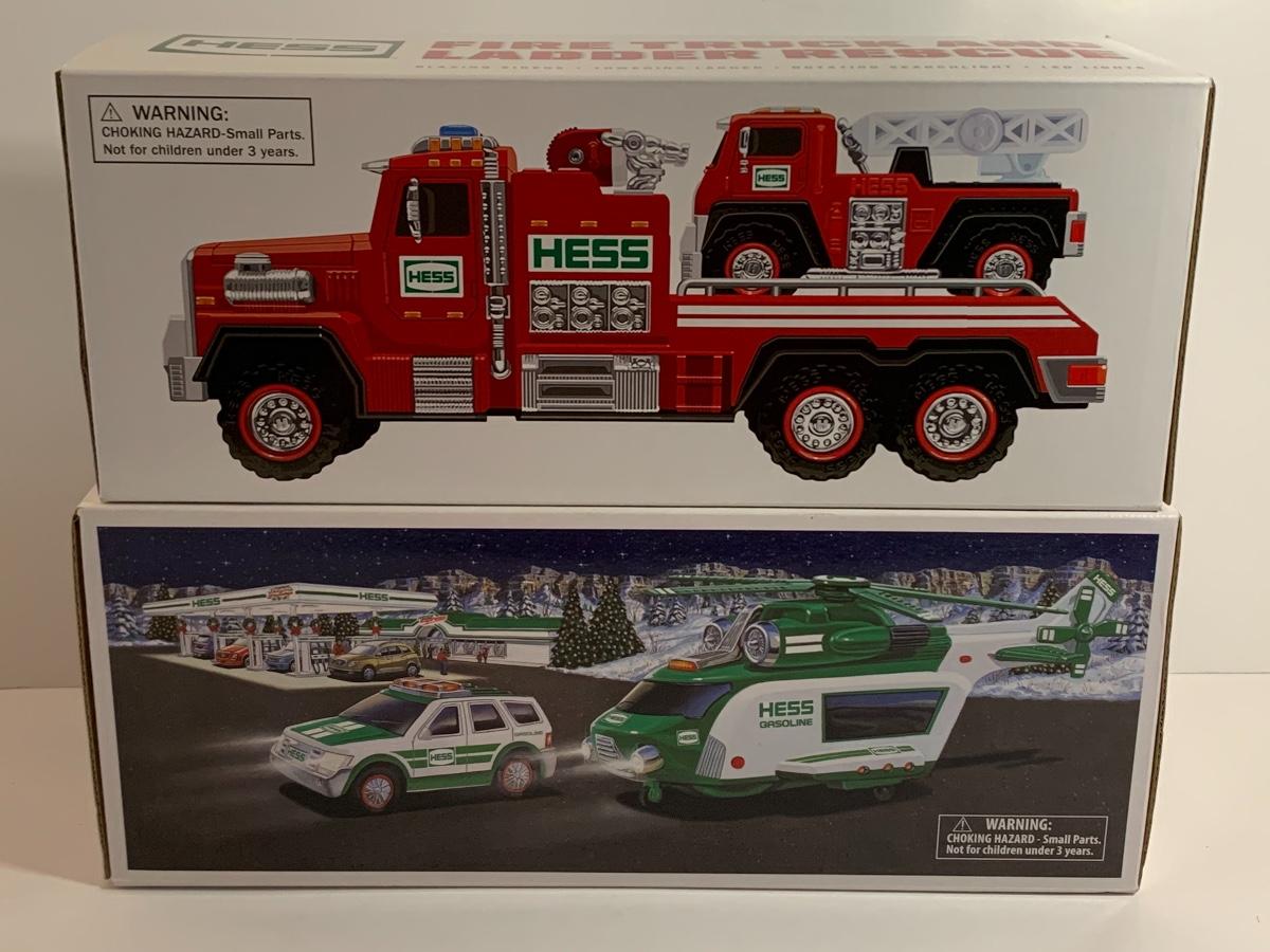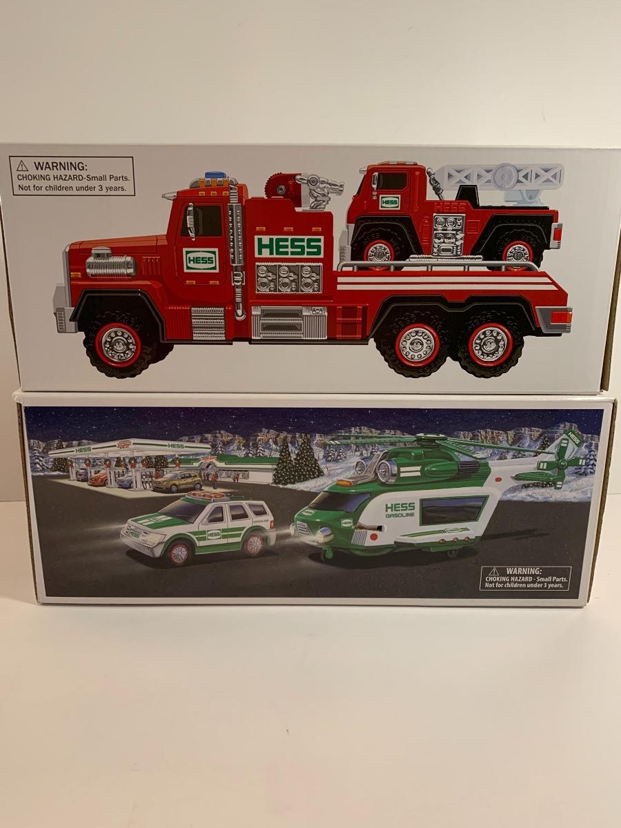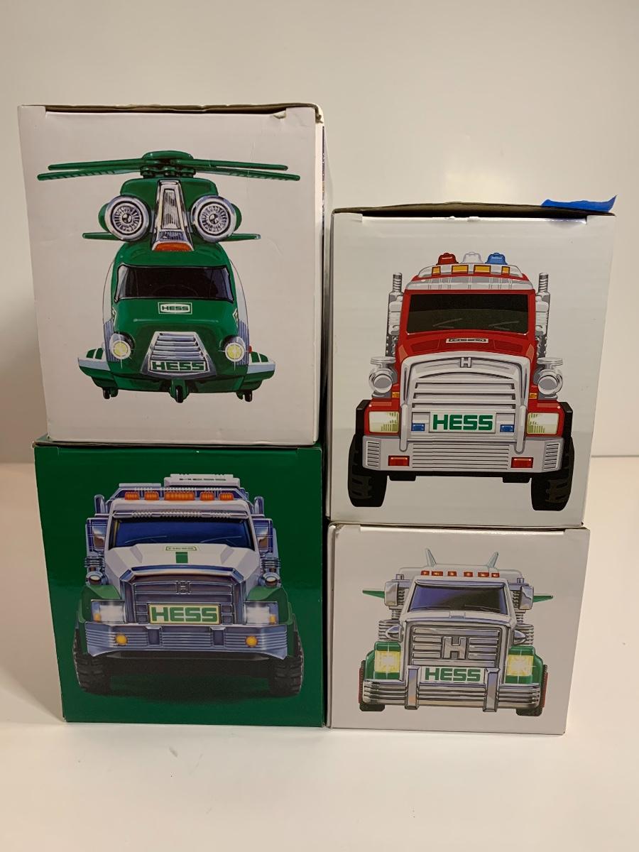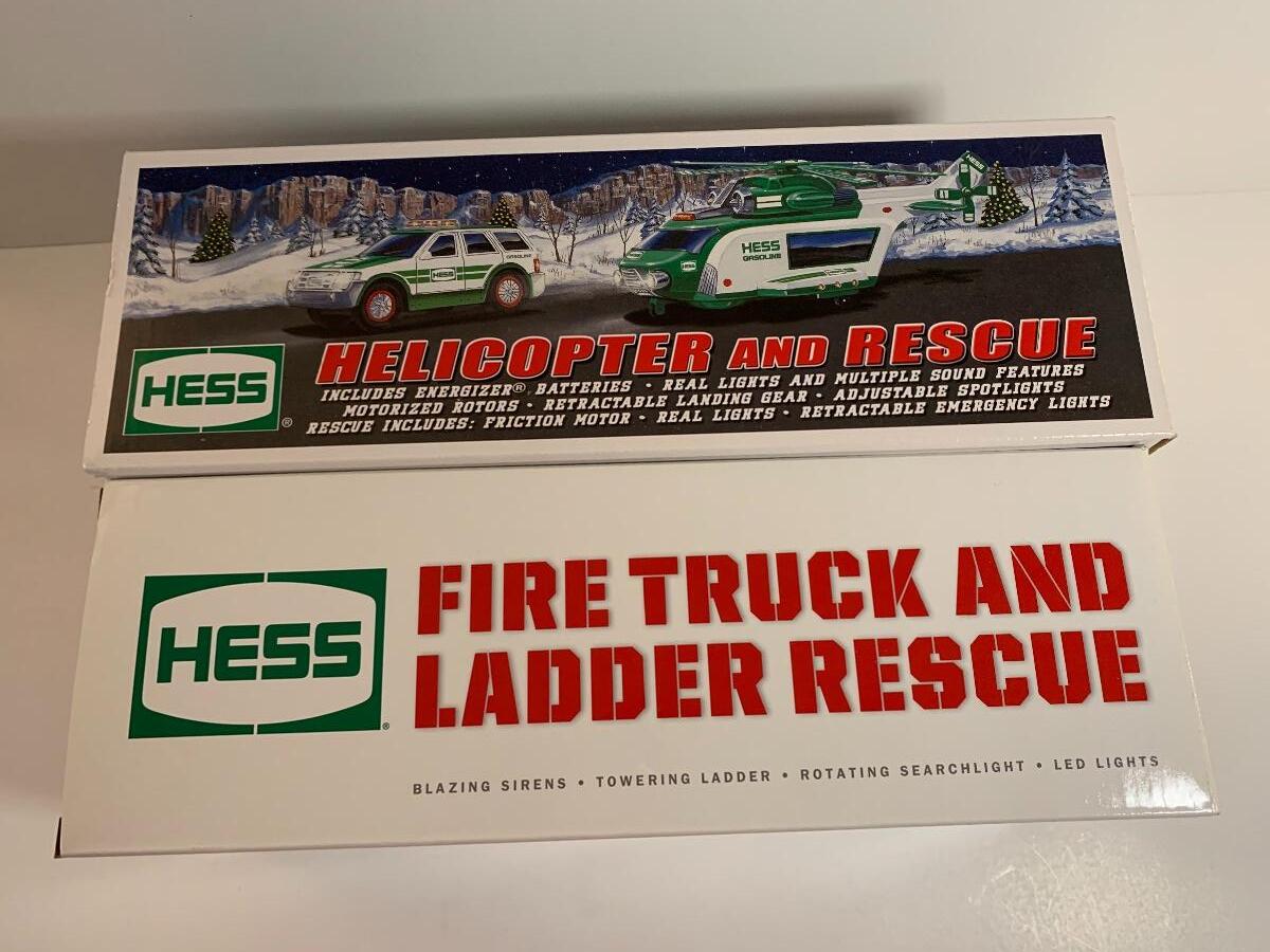New in box Hess Dump Truck & Loader, Hess Truck & Jet, Fire Truck & Ladder Rescue along with the Helicopter & Rescue.