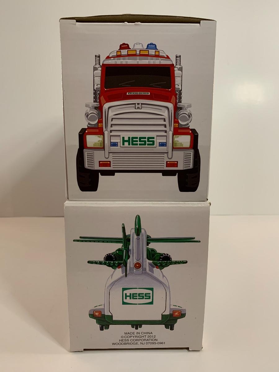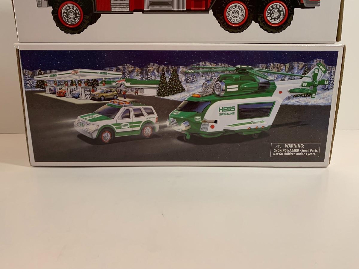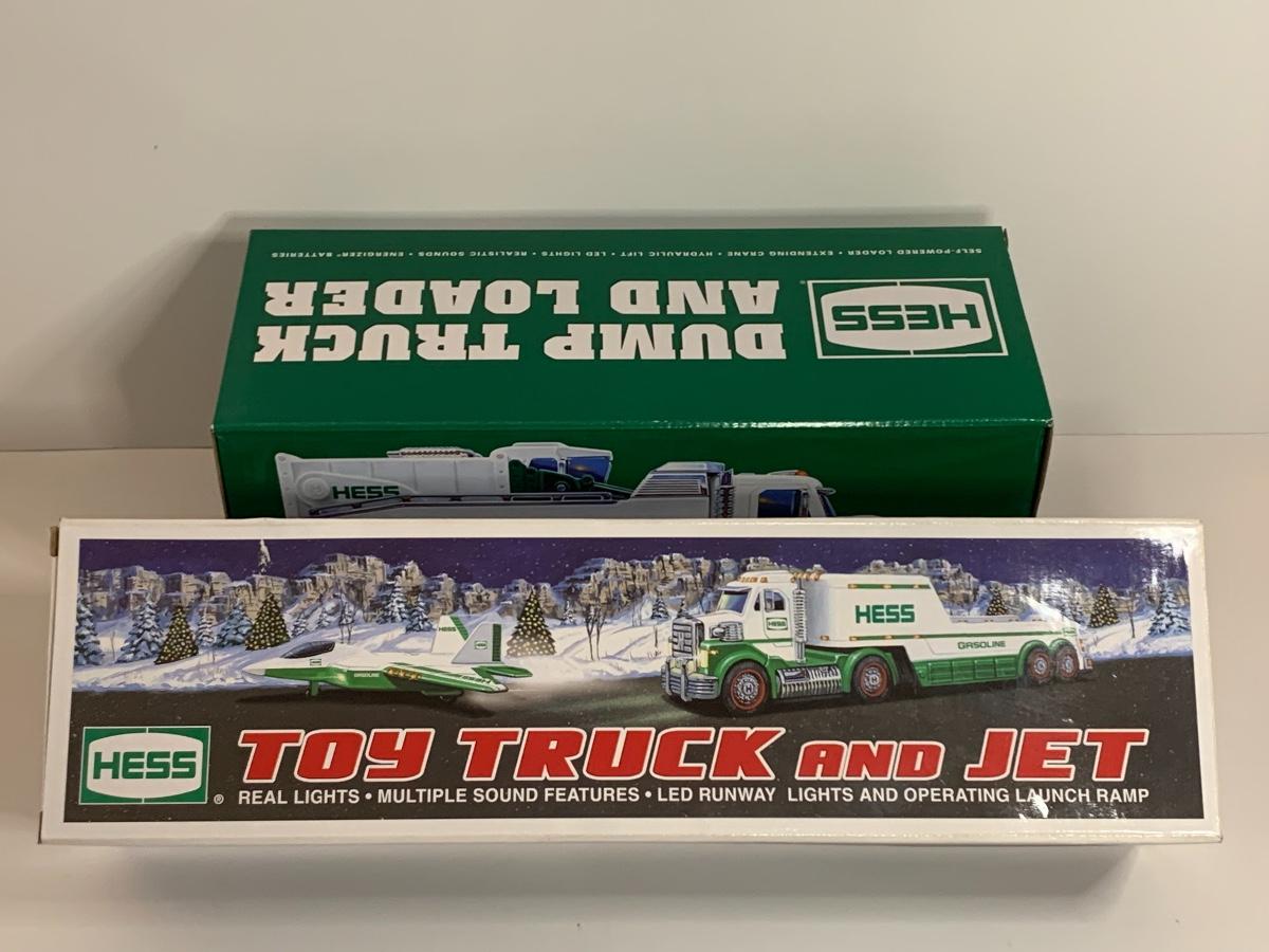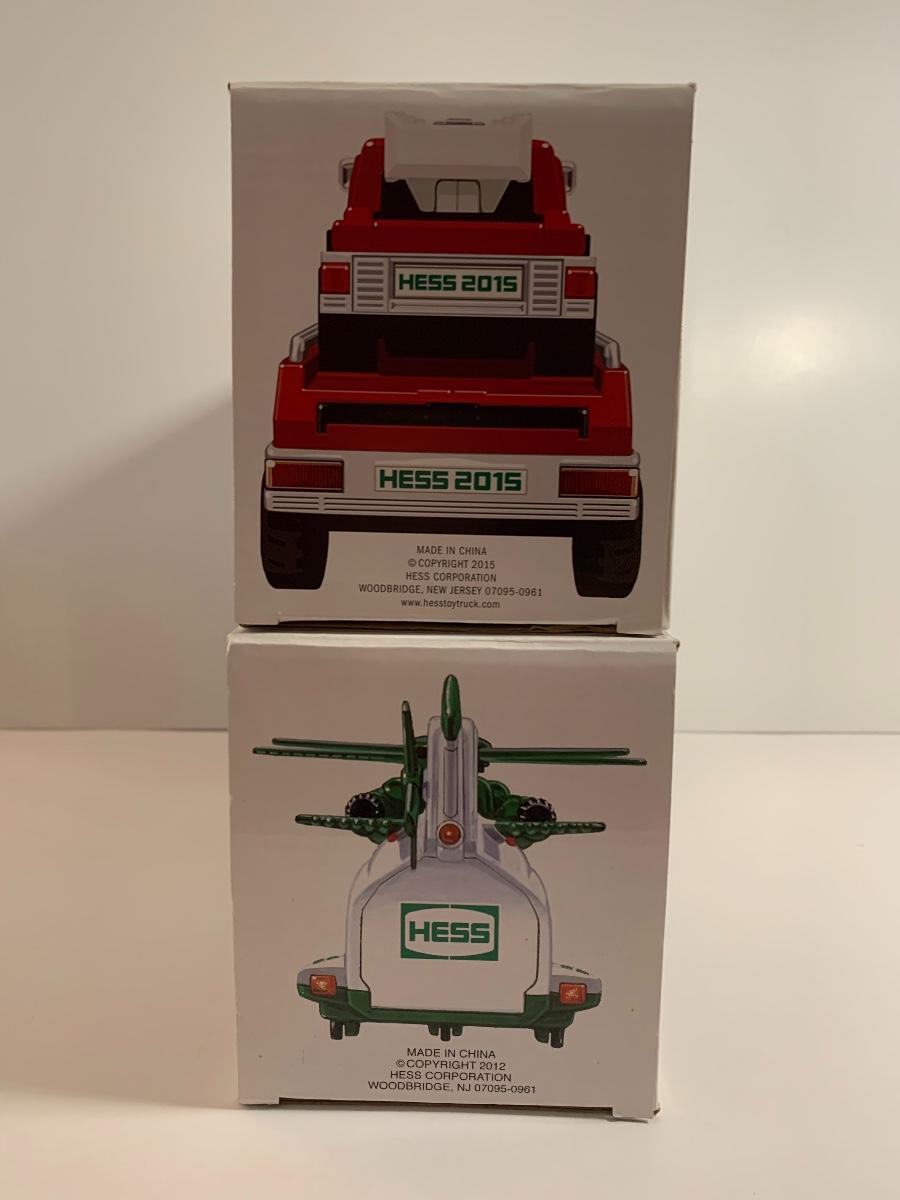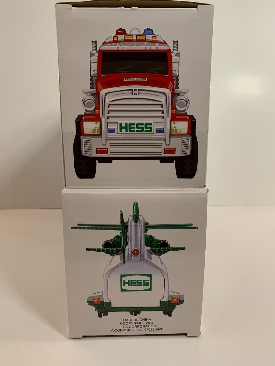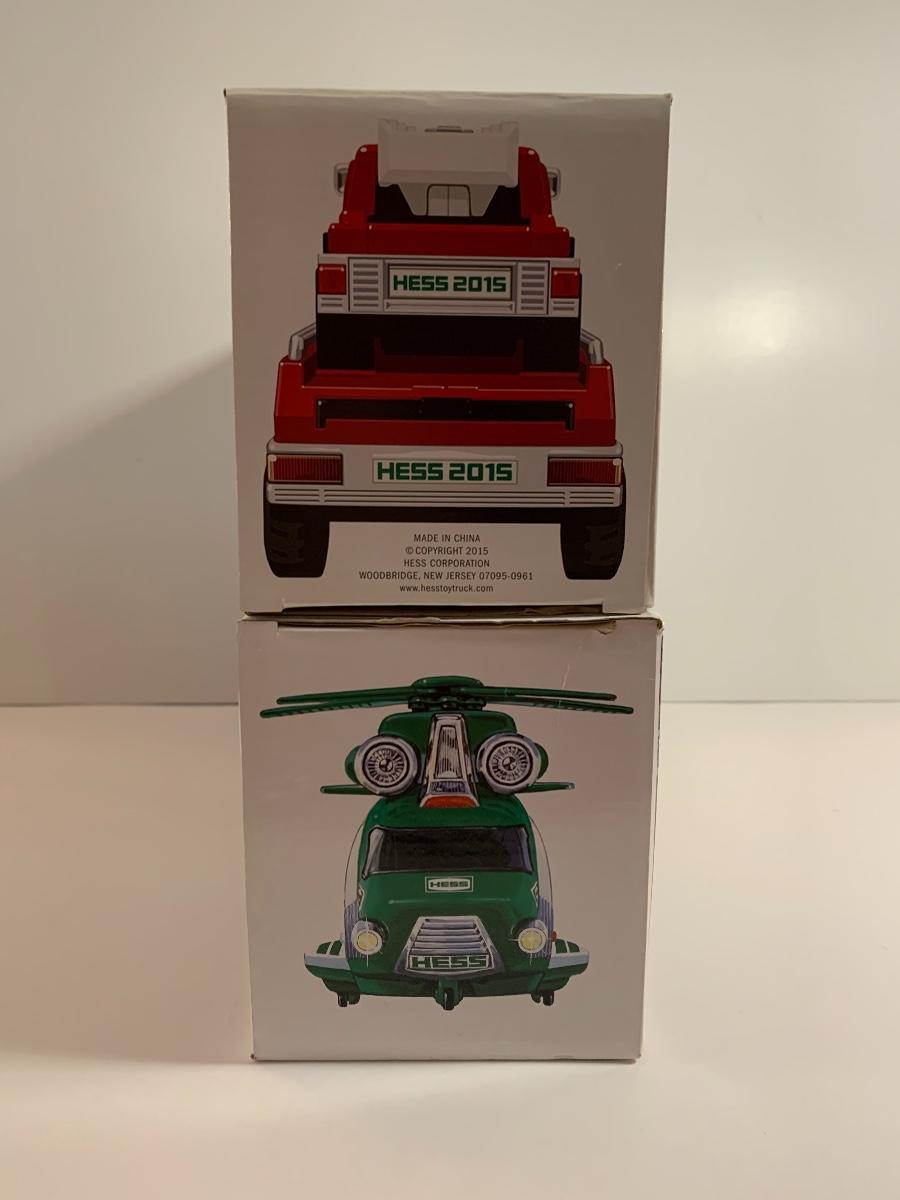 New in box Hess Dump Truck & Loader, Hess Truck & Jet, Fire Truck & Ladder Rescue along with the Helicopter & Rescue.