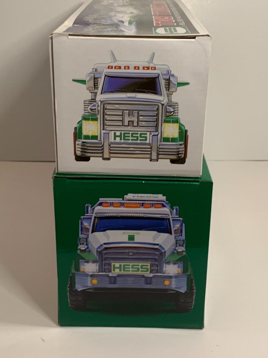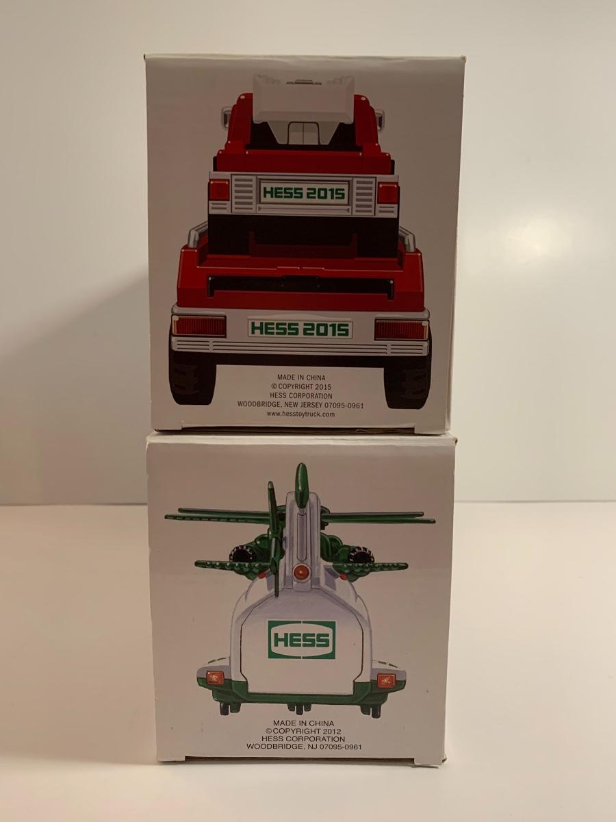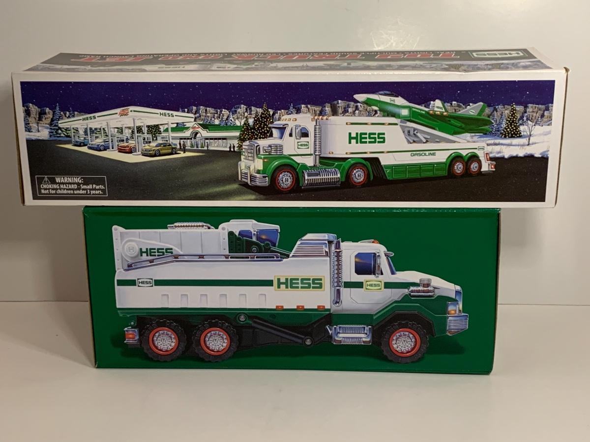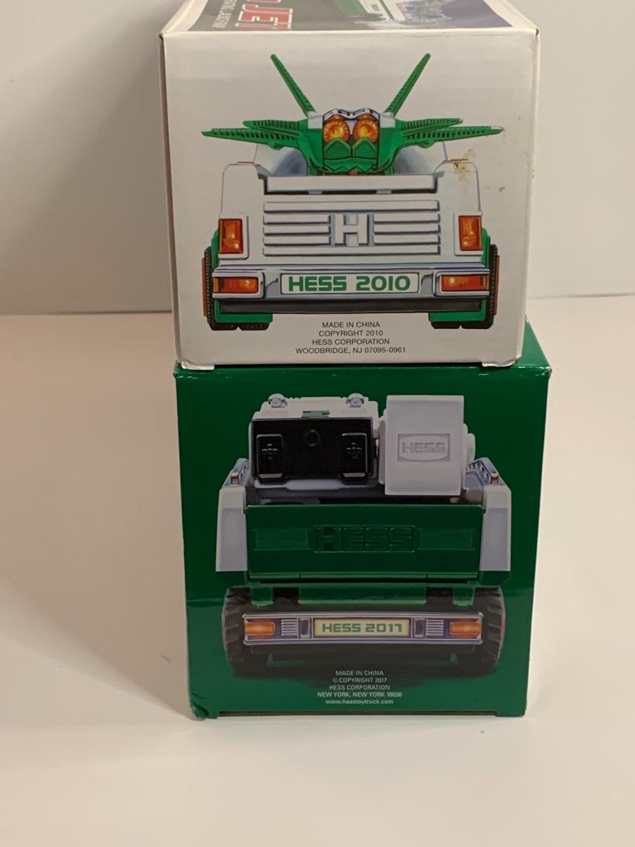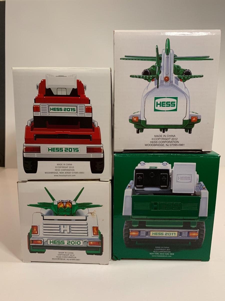 New in box Hess Dump Truck & Loader, Hess Truck & Jet, Fire Truck & Ladder Rescue along with the Helicopter & Rescue.