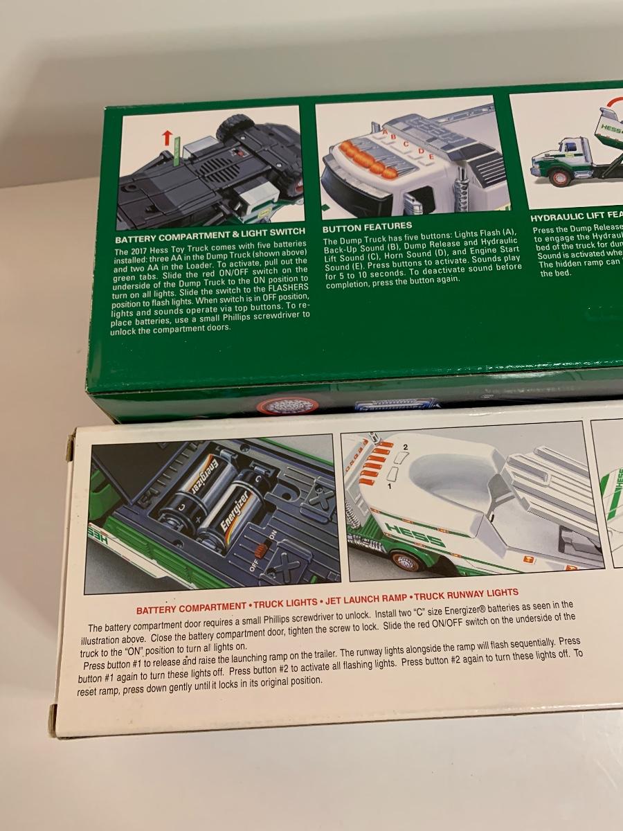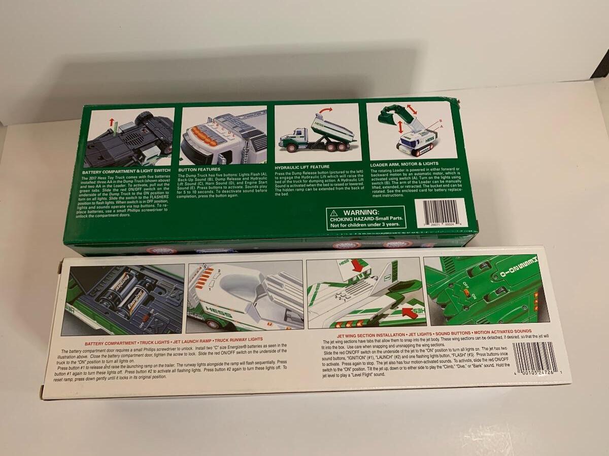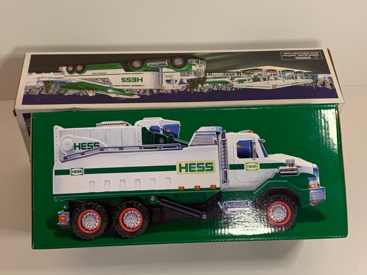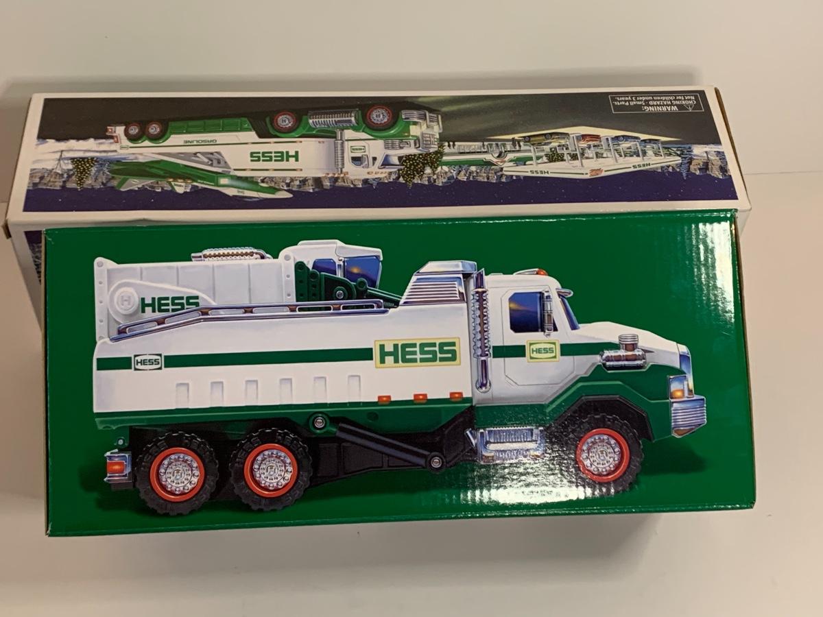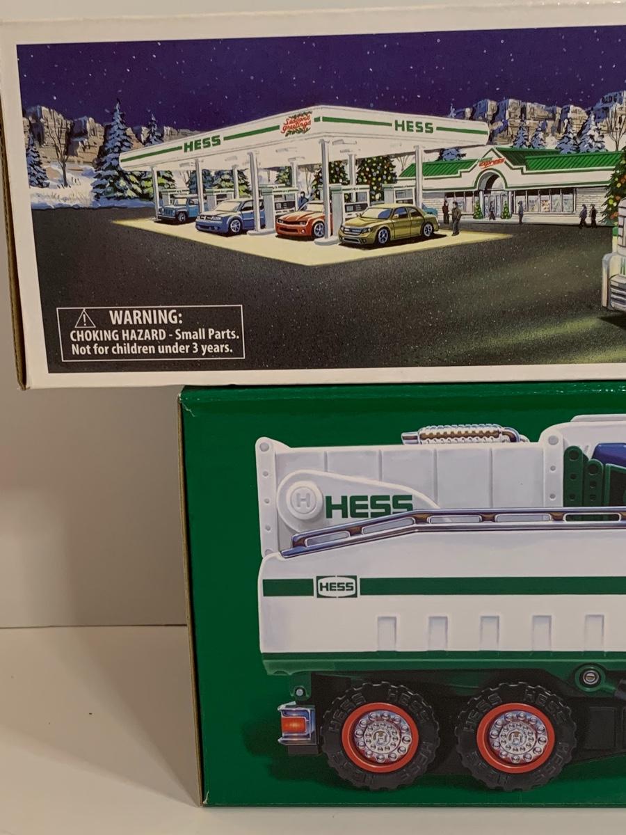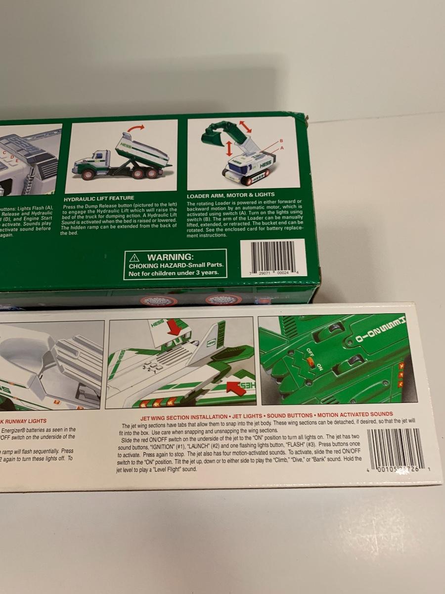 New in box Hess Dump Truck & Loader, Hess Truck & Jet, Fire Truck & Ladder Rescue along with the Helicopter & Rescue.
