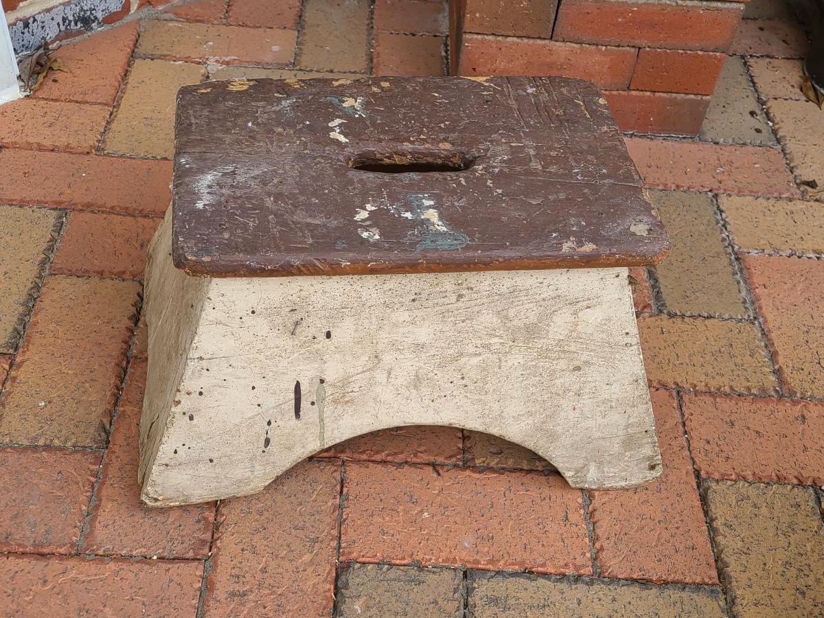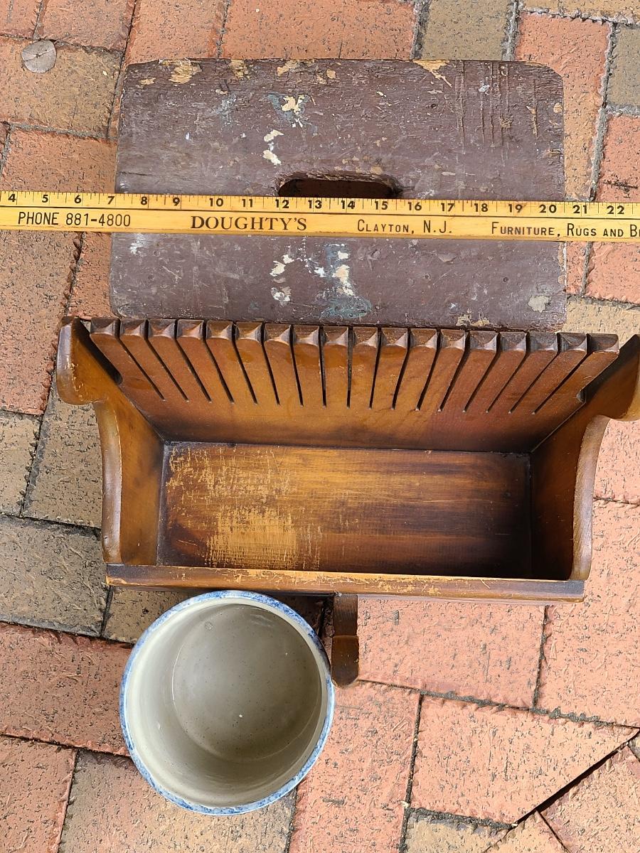 Lot 87S: Railroad Stool, Cranberry Scoop, and Crock