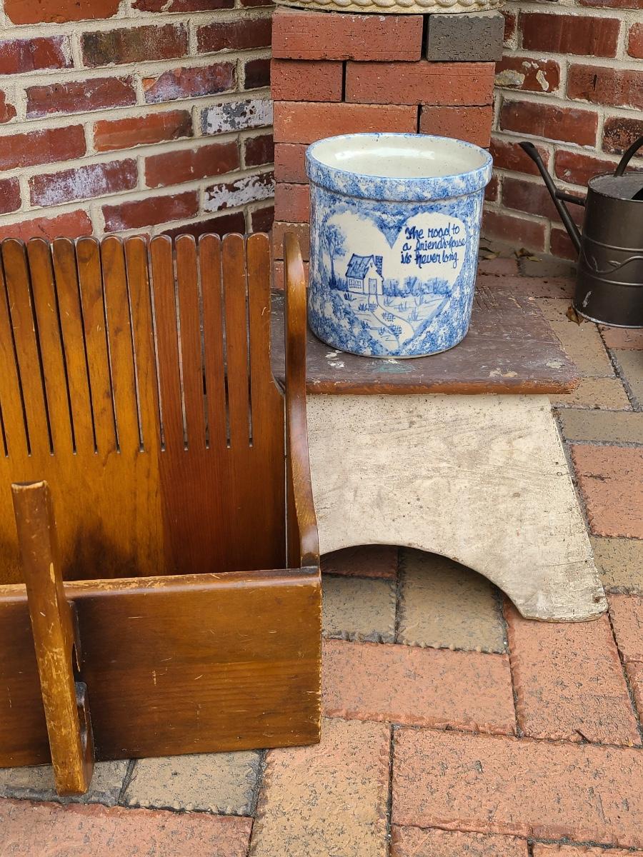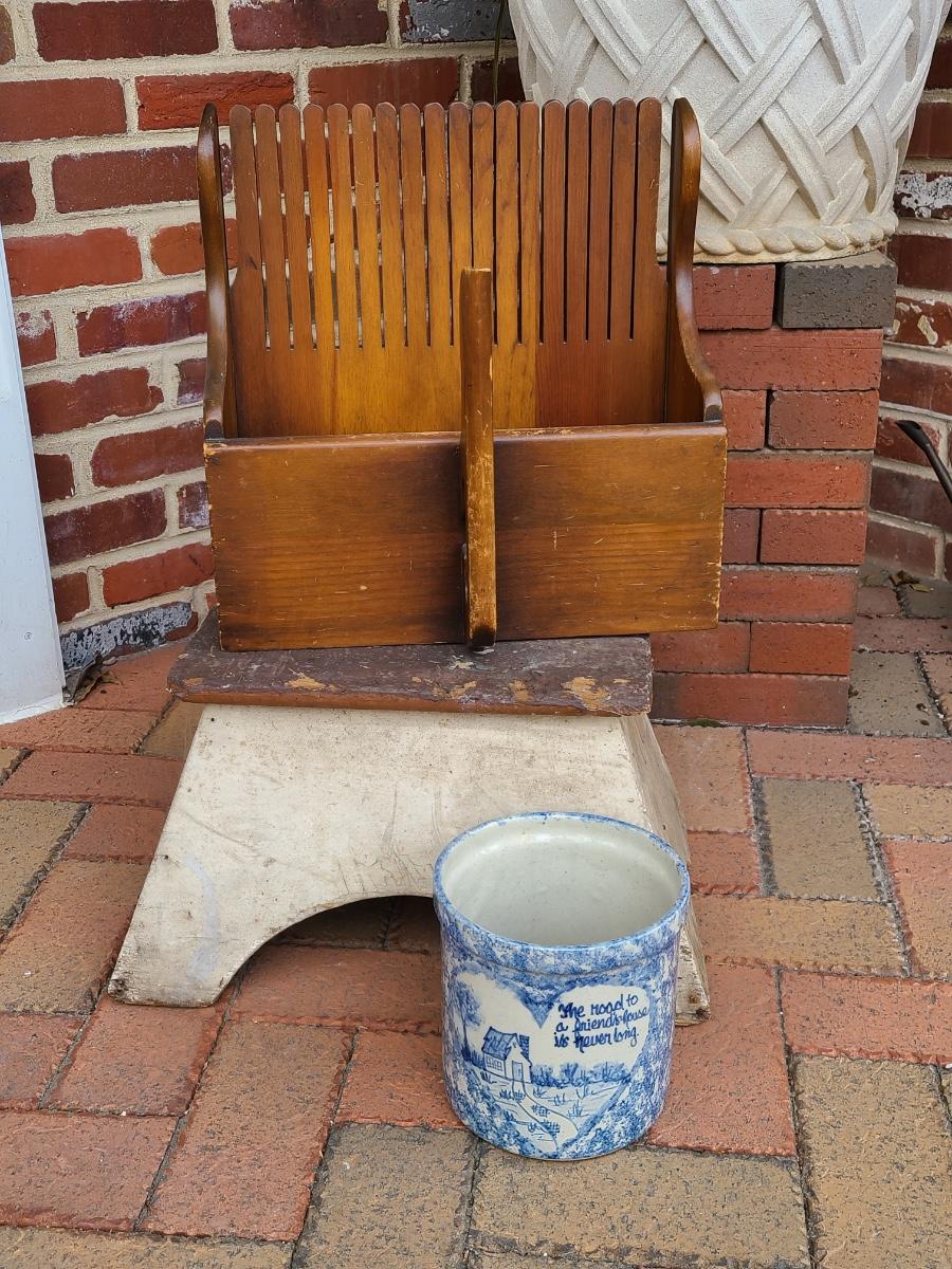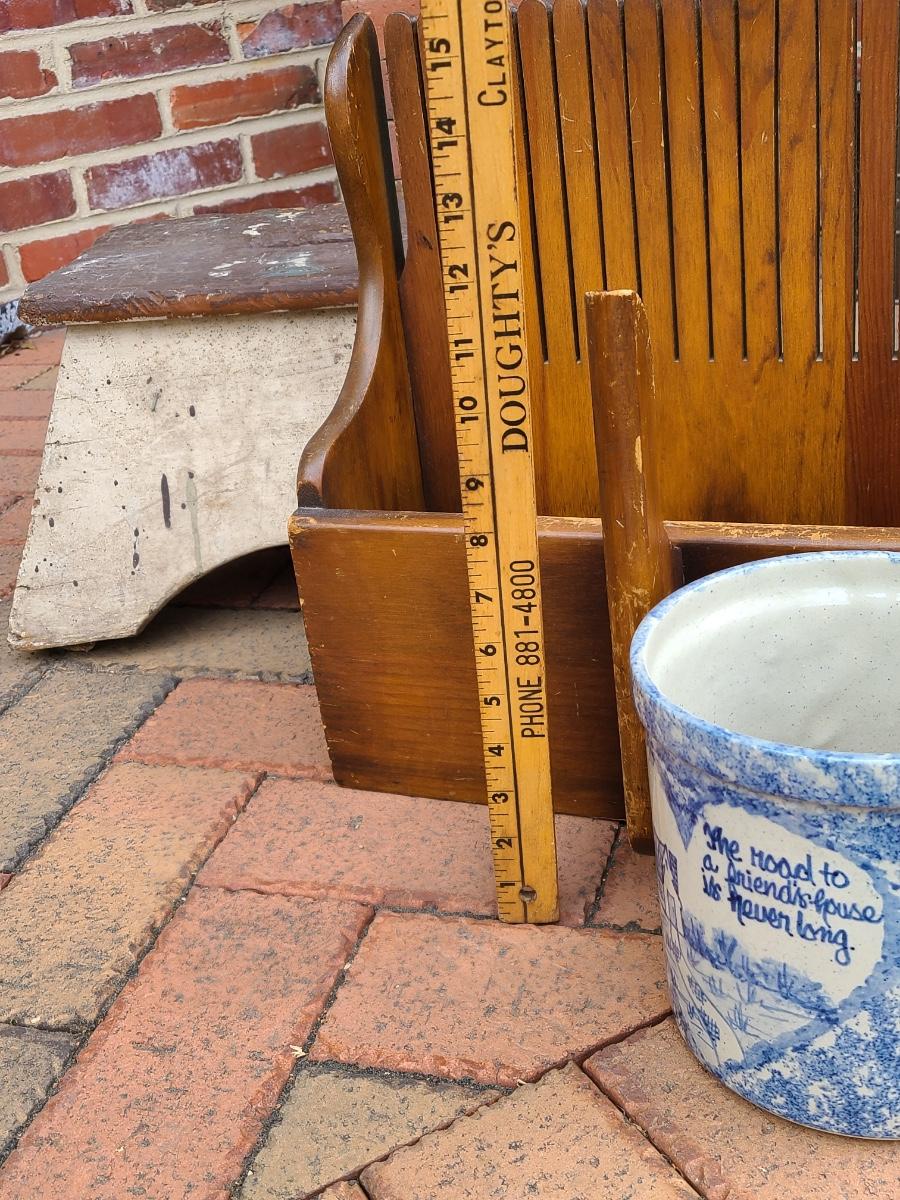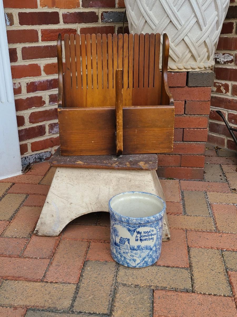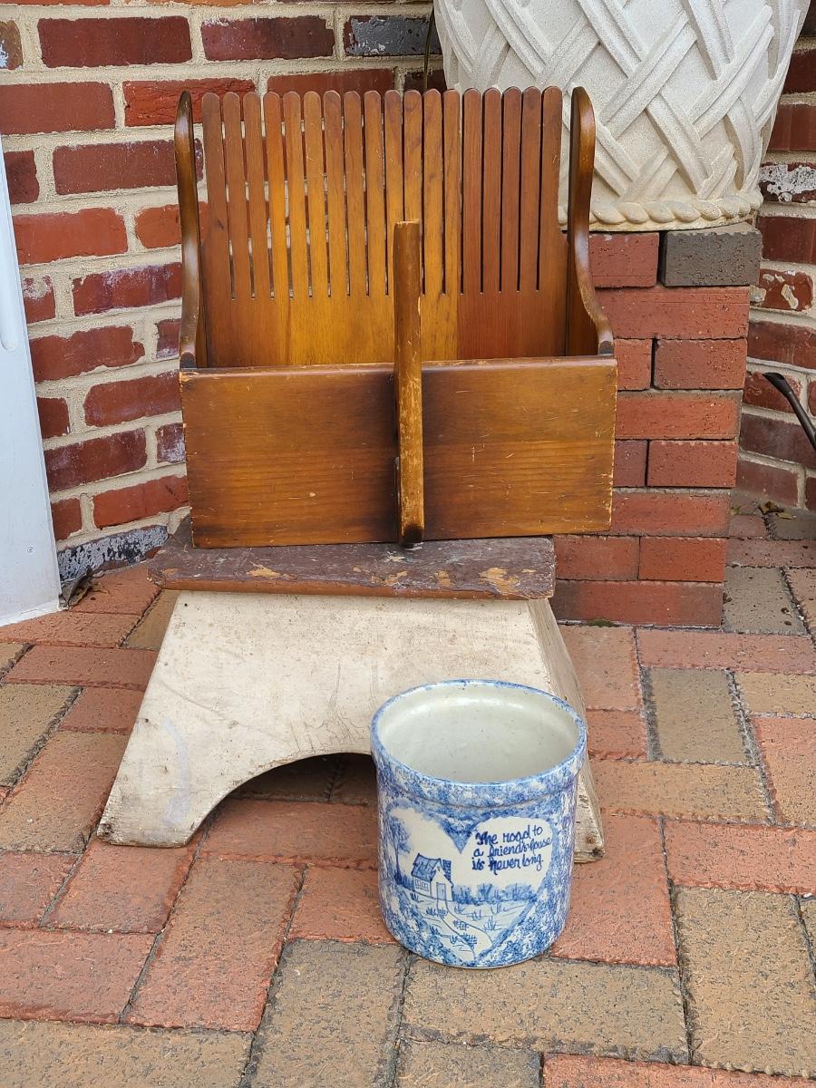 The clients family used to work for the railroad and he believes this was passed down as a railroad stool. Please do research and see pictures. We can't guarantee, we can only go on family history. The cranberry scoop is a reproduction of an antique one, and the crock is a newer home decor piece with sweet message. Would make a great gift! Please see all pictures as they are the best representation of the items. The pictures show condition, measurements if taken, and what is included in the lot. Due to the large amount that we photograph and the time frame, we are not always able to take measurements. All items unless noted, are pre-owned and have been used. If you purchased furniture, you must bring help. We do not allow one person to carry large furniture out on their own. Bring help, tools and a truck for the safety of our client’s homes, and your personal safety. Any damages that result to the property including walls, and floors due to moving of the furniture will be charged to the buyer. Company policy. Thank you.