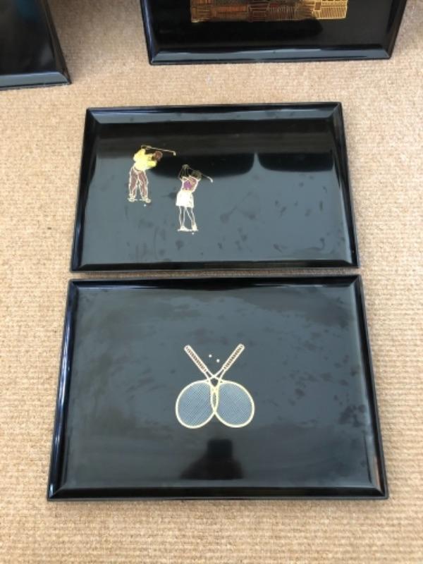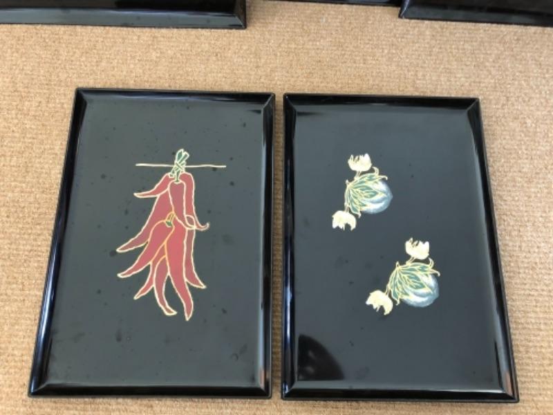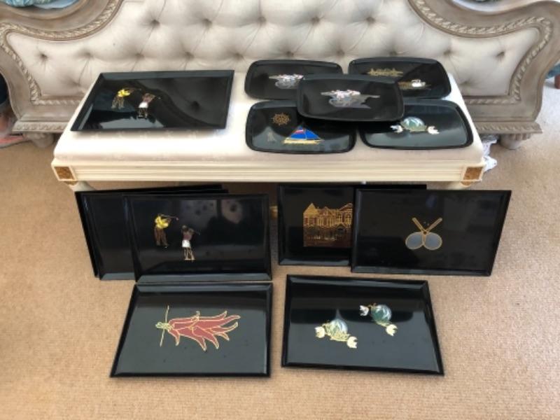 Lot 87U. Mid-century enameled trays“”6 large printed, 2 large, plain, and 5 small trays, Couroc from Monterrey, CA--$45