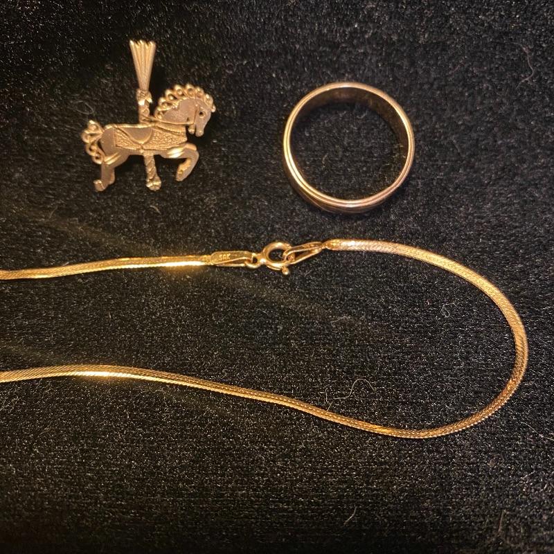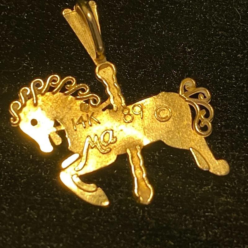 Get ready for Valentine’s Day with this lot! This lot includes all 14 karat gold pieces: a necklace, a ring and a sweet horse pendant. Shipping available.