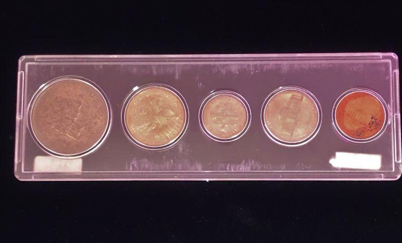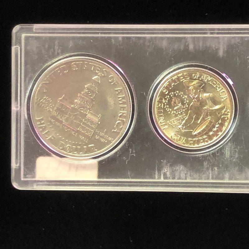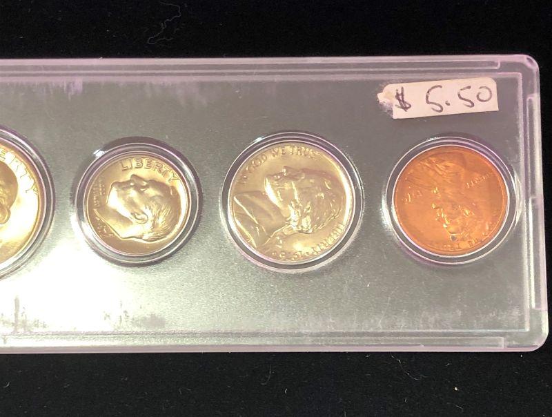 The half dollar and quarter do not have a mint mark, but the other three are the Denver mint. They all appear to be uncirculated. Please see the pictures for details and condition.